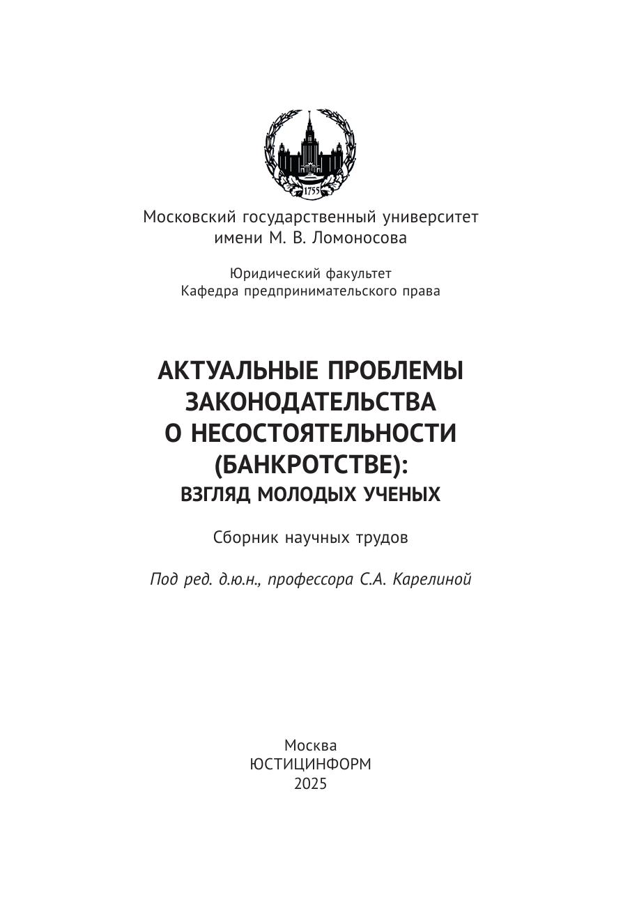 В сборник включены научные работы студентов и аспирантов Юридического факультета Московского государственного университета имени М.В. Ломоносова, посвященные актуальным проблемам законодательства о несостоятельности (банкротстве).