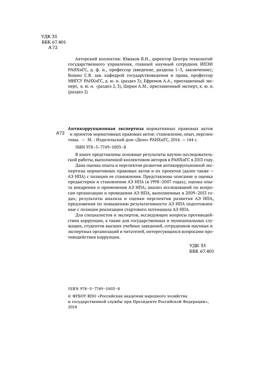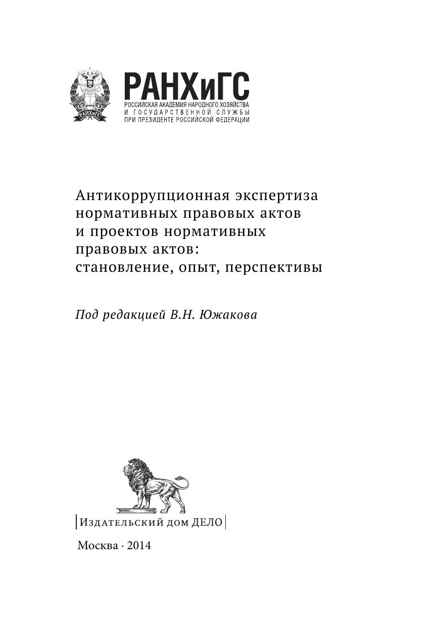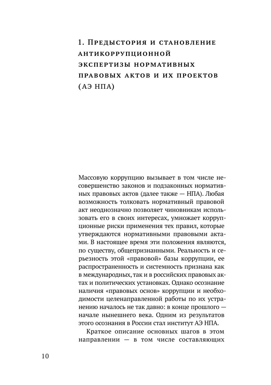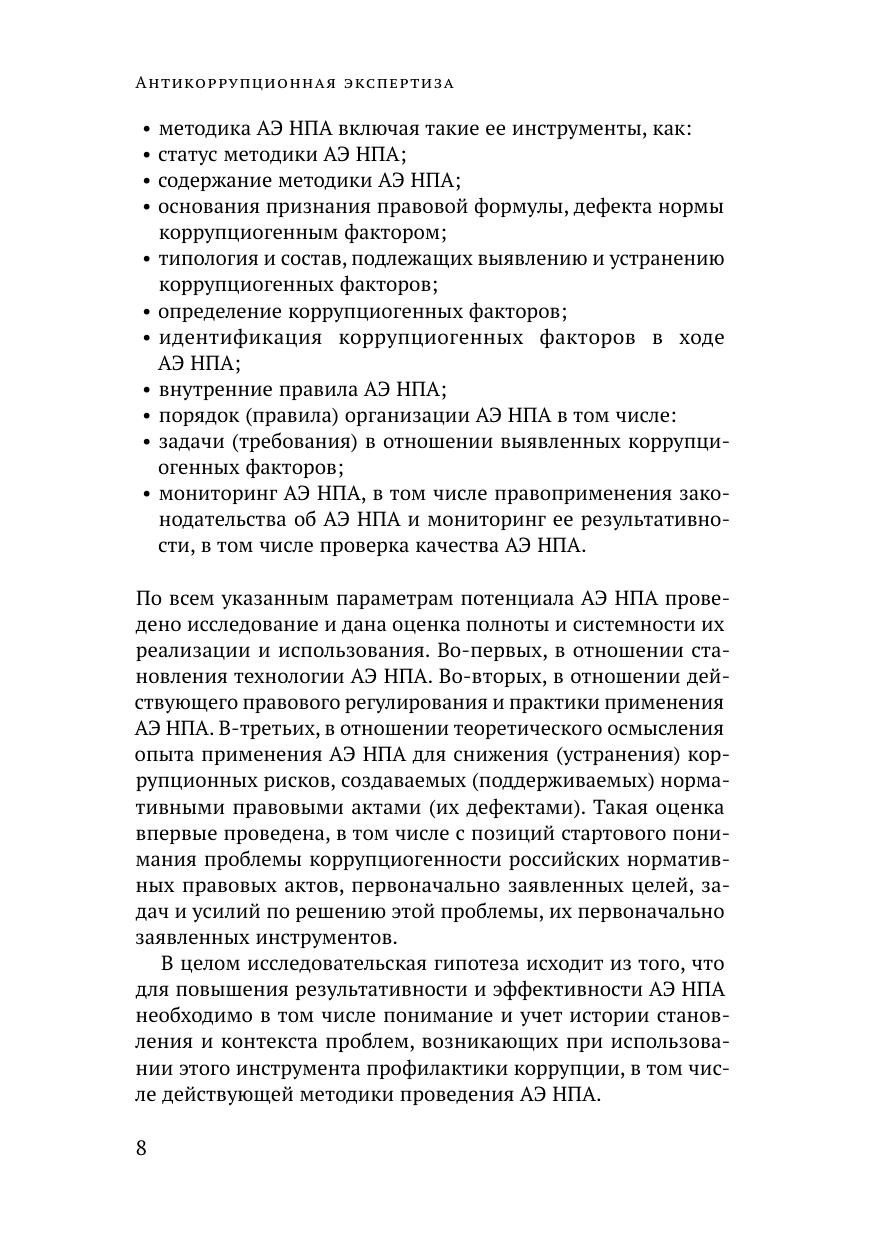 В книге представлены основные результаты научно-исследовательской работы, выполненной коллективом авторов в РАНХиГС в 2013 году. Дана оценка опыта и перспектив развития антикоррупционной экспертизы нормативных правовых актов и их проектов (далее также - АЭ НПА) с позиции ее становления. Представлены описание и оценка предыстории и становления АЭ НПА (в 1998-2007 годах), оценка опыта внедрения и применения АЭ НПА, анализ исследований по вопросам организации и проведения АЭ НПА, выполненных в 2009-2013 годах, результаты анализа и оценки перспектив развития АЭ НПА, предложения по повышению результативности АЭ НПА подготовленные с позиции реализации стартового потенциала АЭ НПА. Для специалистов и экспертов, исследующих вопросы противодействия коррупции, а также для государственных и муниципальных служащих, студентов высших учебных заведений, сотрудников научных и экспертных организаций и читателей, интересующихся вопросами противодействия коррупции.