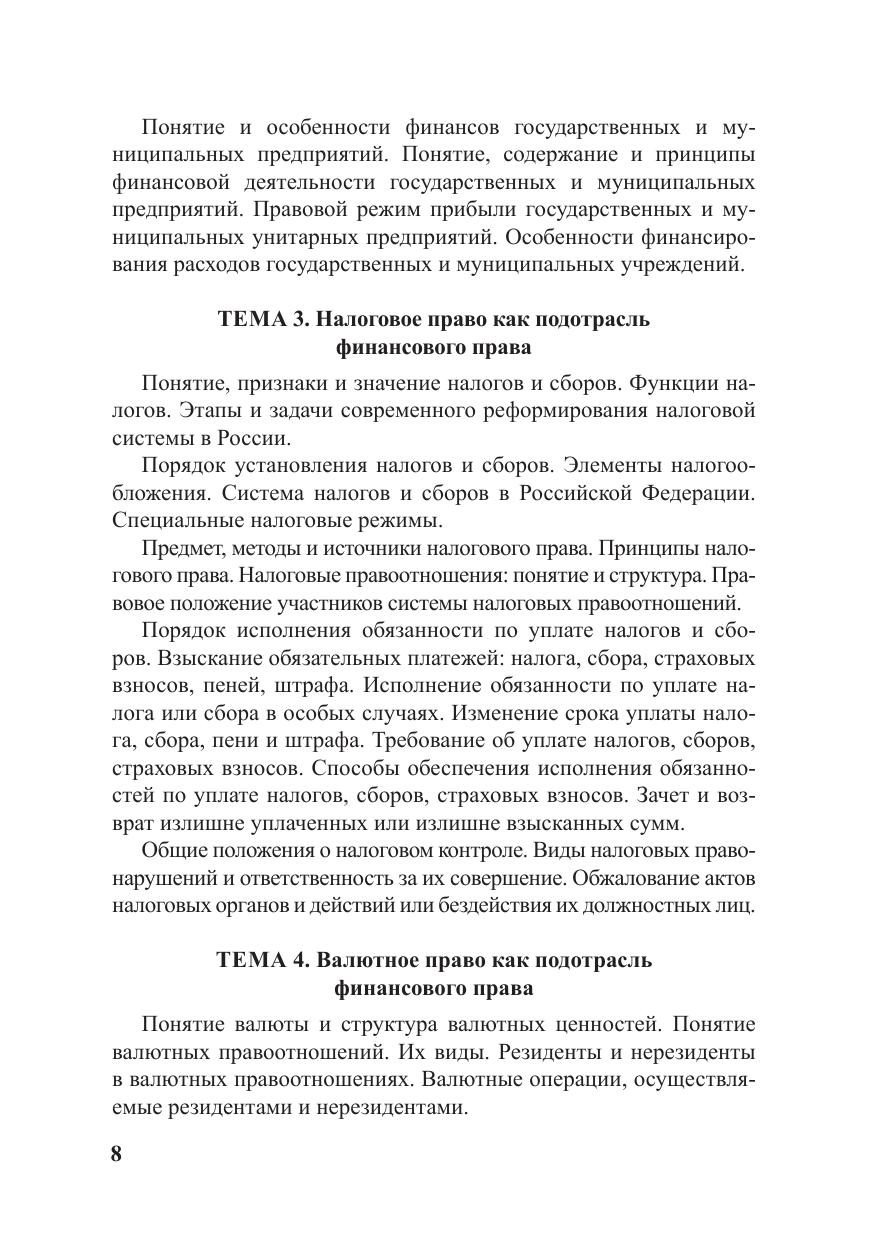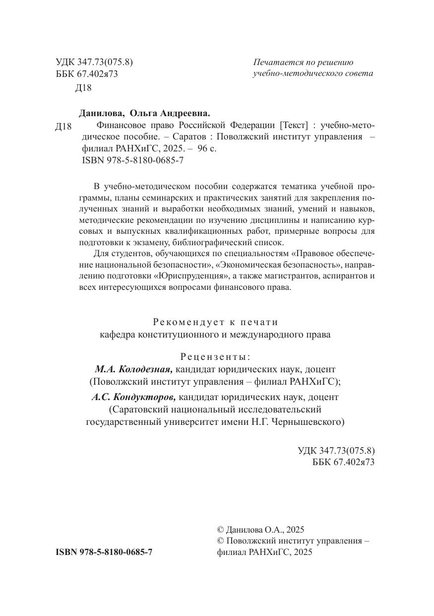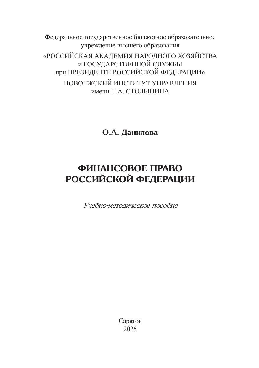 В учебно-методическом пособии содержатся тематика учебной программы, планы семинарских и практических занятий для закрепления полученных знаний и выработки необходимых знаний, умений и навыков, методические рекомендации по изучению дисциплины и написанию курсовых и выпускных квалификационных работ, примерные вопросы для подготовки к экзамену, библиографический список. Для студентов, обучающихся по специальностям «Правовое обеспечение национальной безопасности», «Экономическая безопасность», направлению подготовки «Юриспруденция», а также магистрантов, аспирантов и всех интересующихся вопросами финансового права.