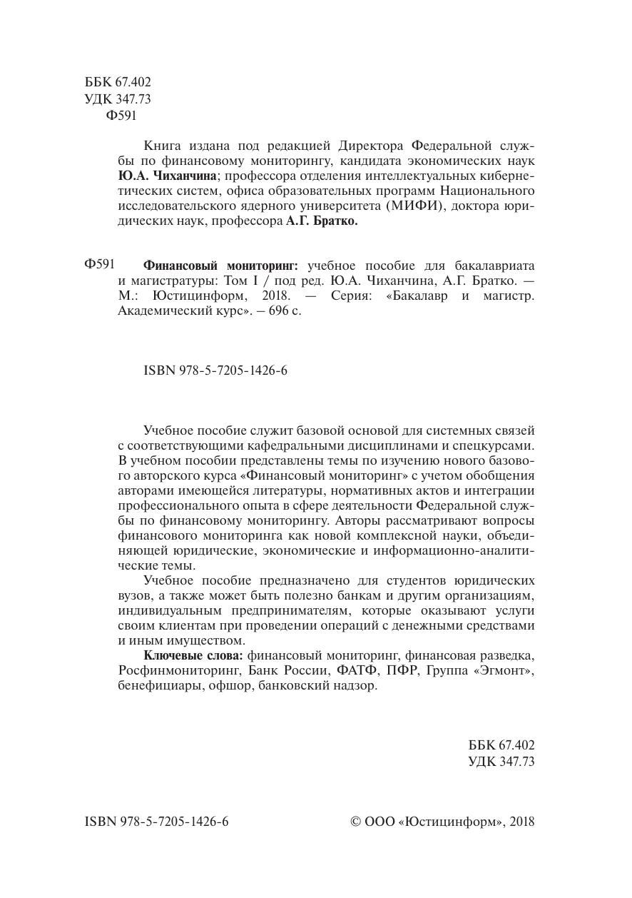 Учебное пособие служит базовой основой для системных связей с соответствующими кафедральными дисциплинами и спецкурсами. В учебном пособии представлены темы по изучению нового базового авторского курса «Финансовый мониторинг» с учетом обобщения авторами имеющейся литературы, нормативных актов и интеграции профессионального опыта в сфере деятельности Федеральной службы по финансовому мониторингу. Авторы рассматривают вопросы финансового мониторинга как новой комплексной науки, объединяющей юридические, экономические и информационно-аналитические темы. Учебное пособие предназначено для студентов юридических вузов, а также может быть полезно банкам и другим организациям,