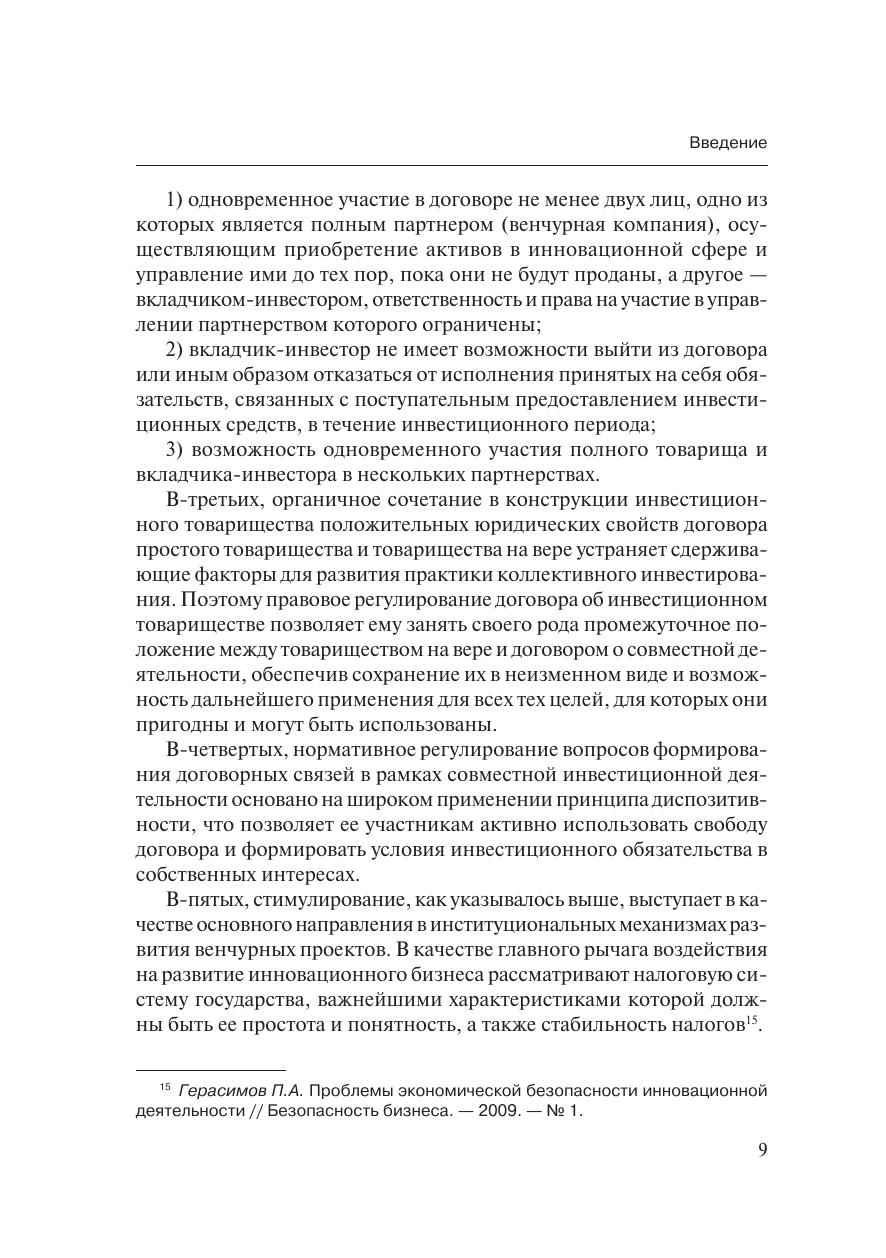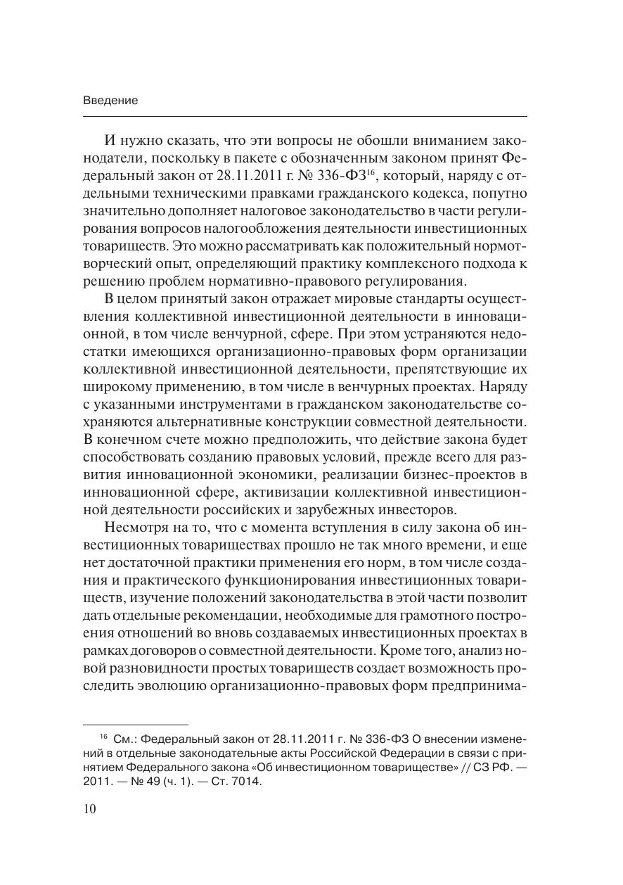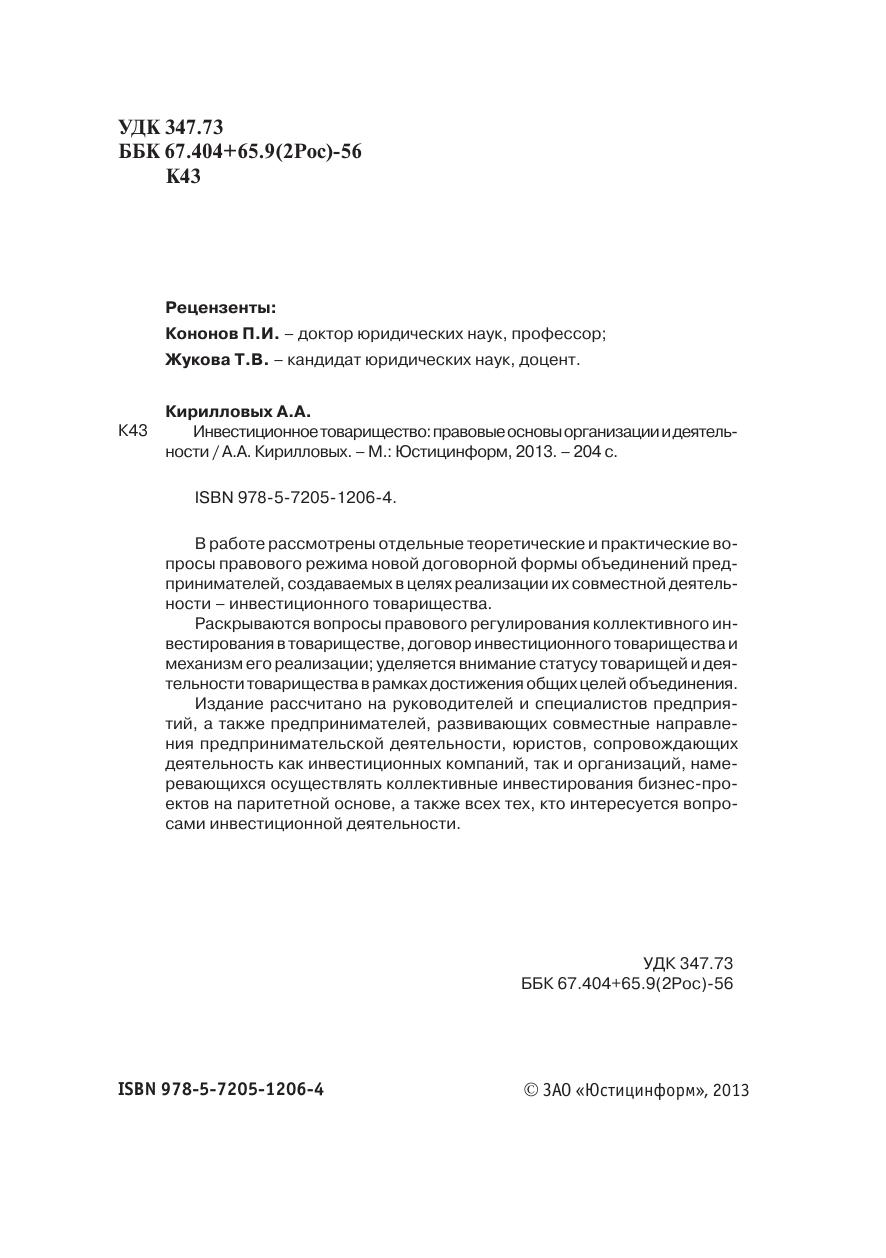 В работе рассмотрены отдельные теоретические и практические во-просы правового режима новой договорной формы объединений пред-принимателей, создаваемых в целях реализации их совместной деятель-ности – инвестиционного товарищества.Раскрываются вопросы правового регулирования коллективного ин-вестирования в товариществе, договор инвестиционного товарищества имеханизм его реализации уделяется внимание статусу товарищей и дея-тельности товарищества в рамках достижения общих целей объединения.Издание рассчитано на руководителей и специалистов предприя-тий, а также предпринимателей, развивающих совместные направле-ния предпринимательской деятельности, юристов, сопровождающихдеятельность как инвестиционных компаний, так и организаций, наме-ревающихся осуществлять коллективные инвестирования бизнес-про-ектов на паритетной основе, а также всех тех, кто интересуется вопро-сами инвестиционной деятельности.