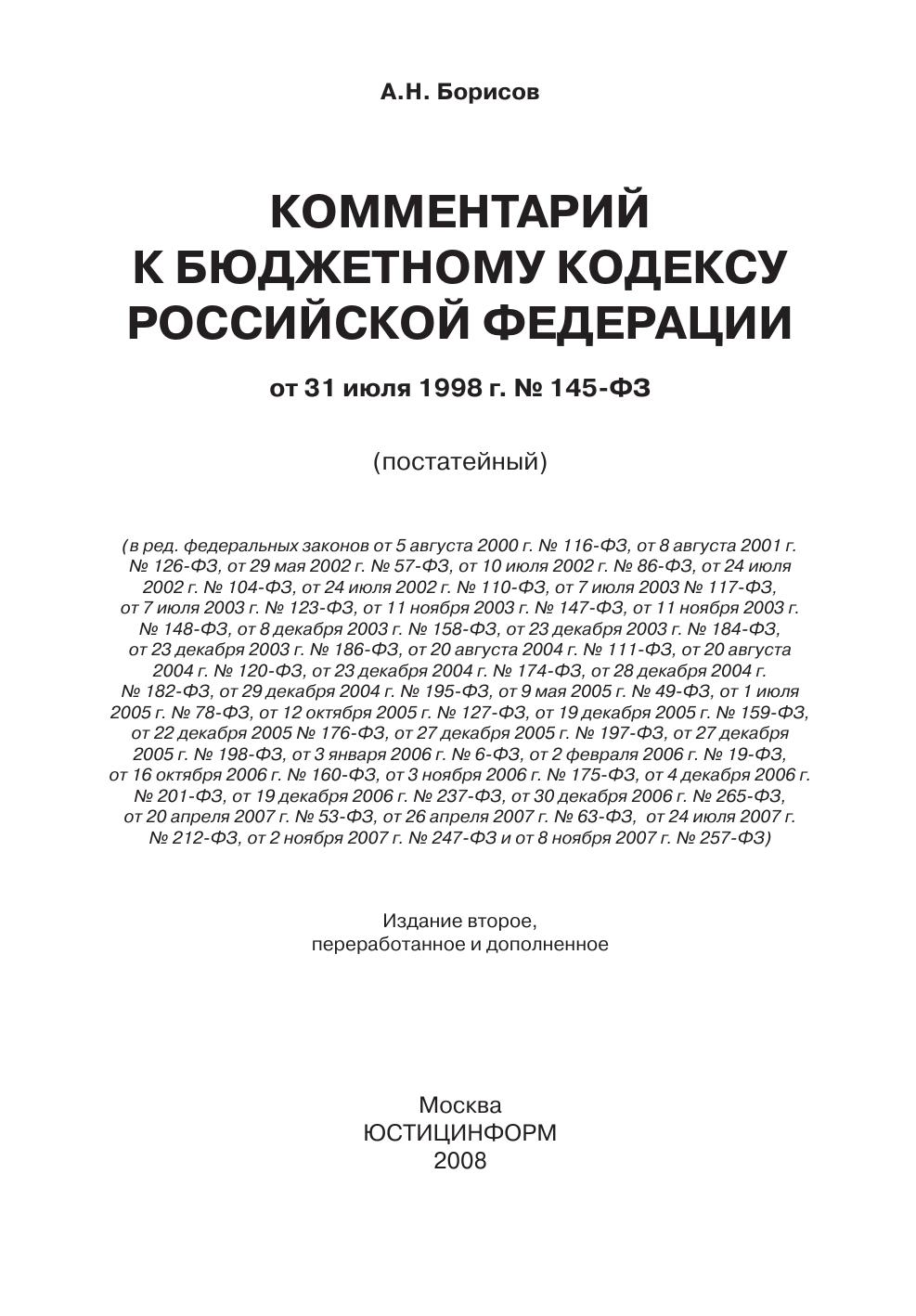 В книге дан постатейный комментарий к Бюджетному кодексу РФ от 31 июля 1998 г. № 145-ФЗ с учетом внесенных в него изменений, в том числе Федеральными законами от 2 ноября 2007 г. № 247-ФЗ и от 8 ноября 2007 г. № 257-ФЗ.Подробно проанализированы положения об организации и функционировании бюджетной системы Российской Федерации, правовое положение субъектов бюджетных правоотношений, основы бюджетного процесса и межбюджетных отношений, основания и виды ответственности за нарушение бюджетного законодательства.При рассмотрении положений Кодекса учтены судебная практика, разъяснения высших судебных органов и правовые позиции Минфина России и Федерального казначейства.
