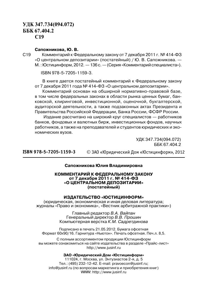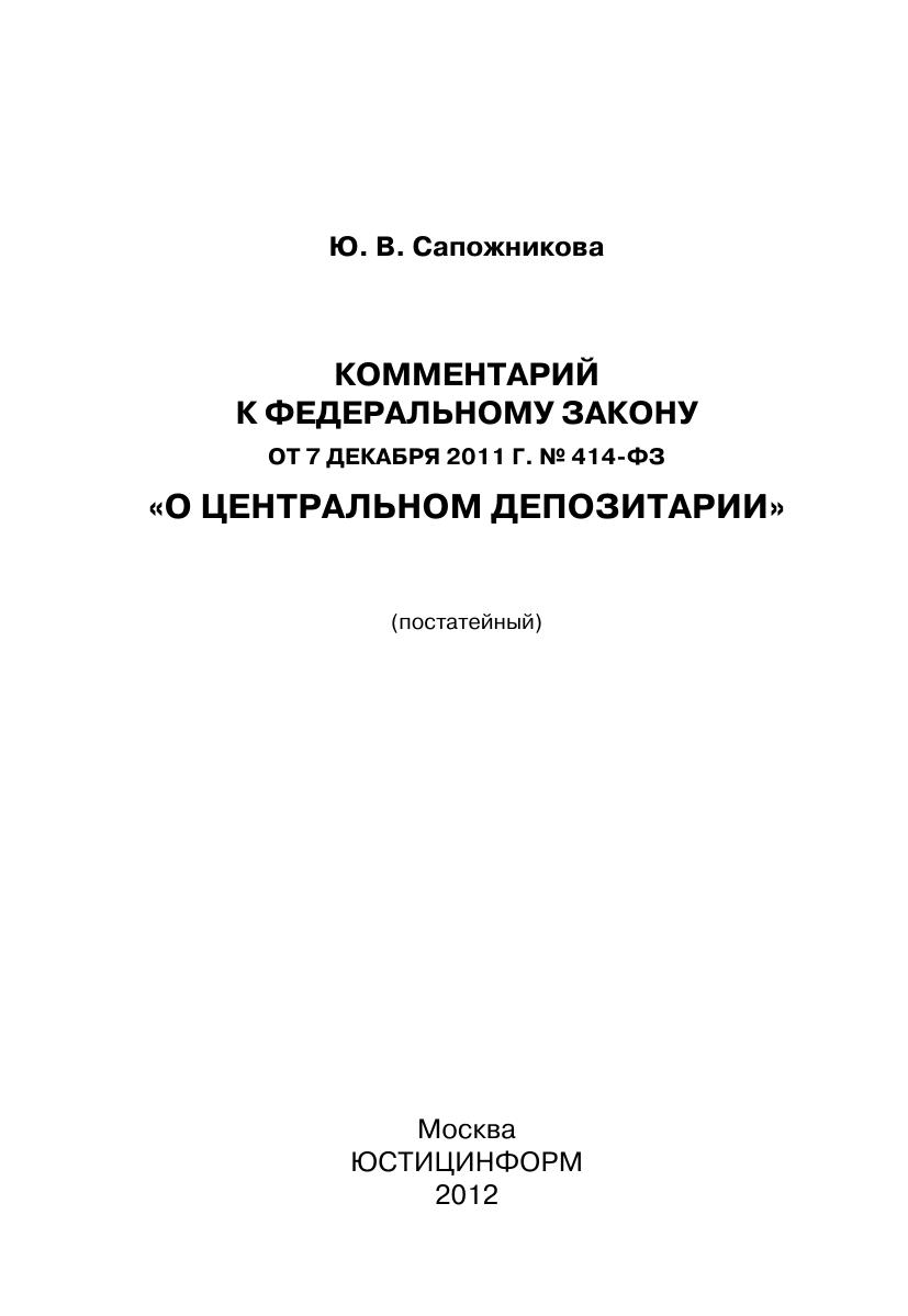 Комментарий к Федеральному закону от 7 декабря 2011 г. № 414-ФЗ «О центральном депозитарии» (постатейный)