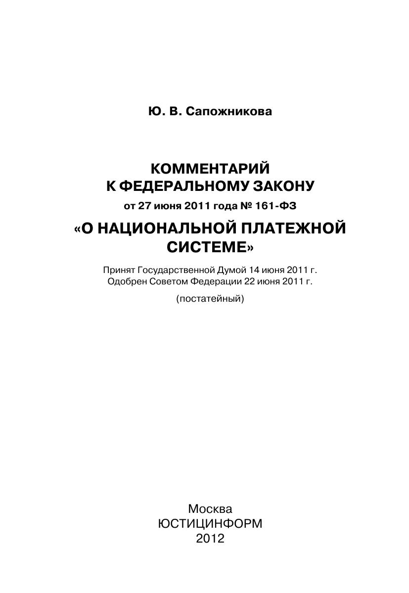 Комментарий к Федеральному закону от 27 июня 2011 г. № 161-ФЗ «О национальной платежной системе» (постатейный)