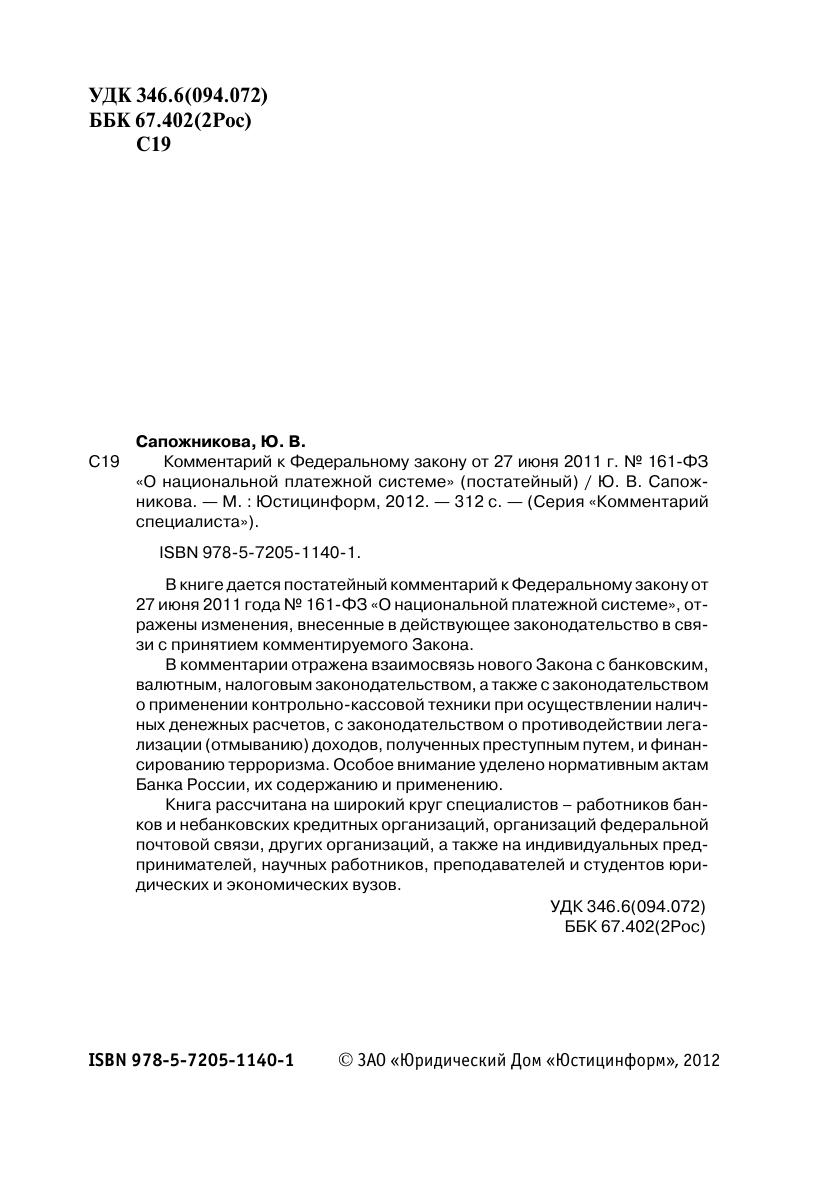 В книге дается постатейный комментарий к Федеральному закону от 27 июня 2011 года № 161-ФЗ «О национальной платежной системе», отражены изменения, внесенные в действующее законодательство в связи с принятием комментируемого Закона. В комментарии отражена взаимосвязь нового Закона с банковским, валютным, налоговым законодательством, а также с законодательством о применении контрольно-кассовой техники при осуществлении наличных денежных расчетов, с законодательством о противодействии легализации (отмыванию) доходов, полученных преступным путем, и финансированию терроризма. Особое внимание уделено нормативным актам Банка России, их содержанию и применению.Книга рассчитана на широкий круг специалистов – работников банков и небанковских кредитных организаций, организаций федеральной почтовой связи, других организаций, а также на индивидуальных предпринимателей, научных работников, преподавателей и студентов юридических и экономических вузов.