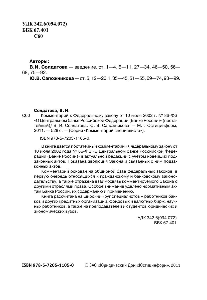 В книге дается постатейный комментарий к Федеральному закону от 10 июля 2002 года № 86-ФЗ «О Центральном банке Российской Федерации (Банке России)» в актуальной редакции с учетом новейших подзаконных актов. Показана эволюция Закона и связанных с ним подзаконных актов.Комментарий основан на обширной базе федеральных законов, в первую очередь относящихся к гражданскому и банковскому законодательству, а также отражена взаимосвязь комментируемого Закона с другими отраслями права. Особое внимание уделено нормативным актам Банка России, их содержанию и применению. Книга рассчитана на широкий круг специалистов – работников банков и других кредитных организаций, фондовых и валютных бирж, научных работников, а также на преподавателей и студентов юридических иэкономических вузов