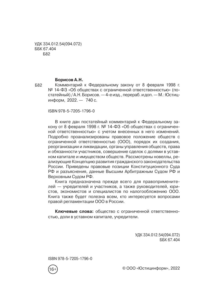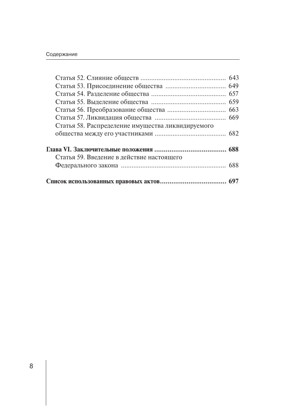 В книге дан постатейный комментарий к Федеральному закону от 8 февраля 1998 г. № 14-ФЗ «Об обществах с ограниченной ответственностью» с учетом внесенных в него изменений. Подробно проанализированы правовое положение обществ с ограниченной ответственностью (ООО), порядок их создания, реорганизации и ликвидации, органы управления обществ, права и обязанности участников, совершение сделок с долями в уставном капитале и имуществом обществ. Рассмотрены новеллы, реализующие Концепцию развития гражданского законодательства России. Приведены правовые позиции Конституционного Суда РФ и разъяснения, данные Высшим Арбитражным Судом РФ и Верховным Судом РФ.