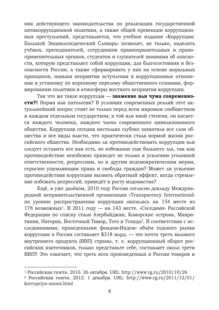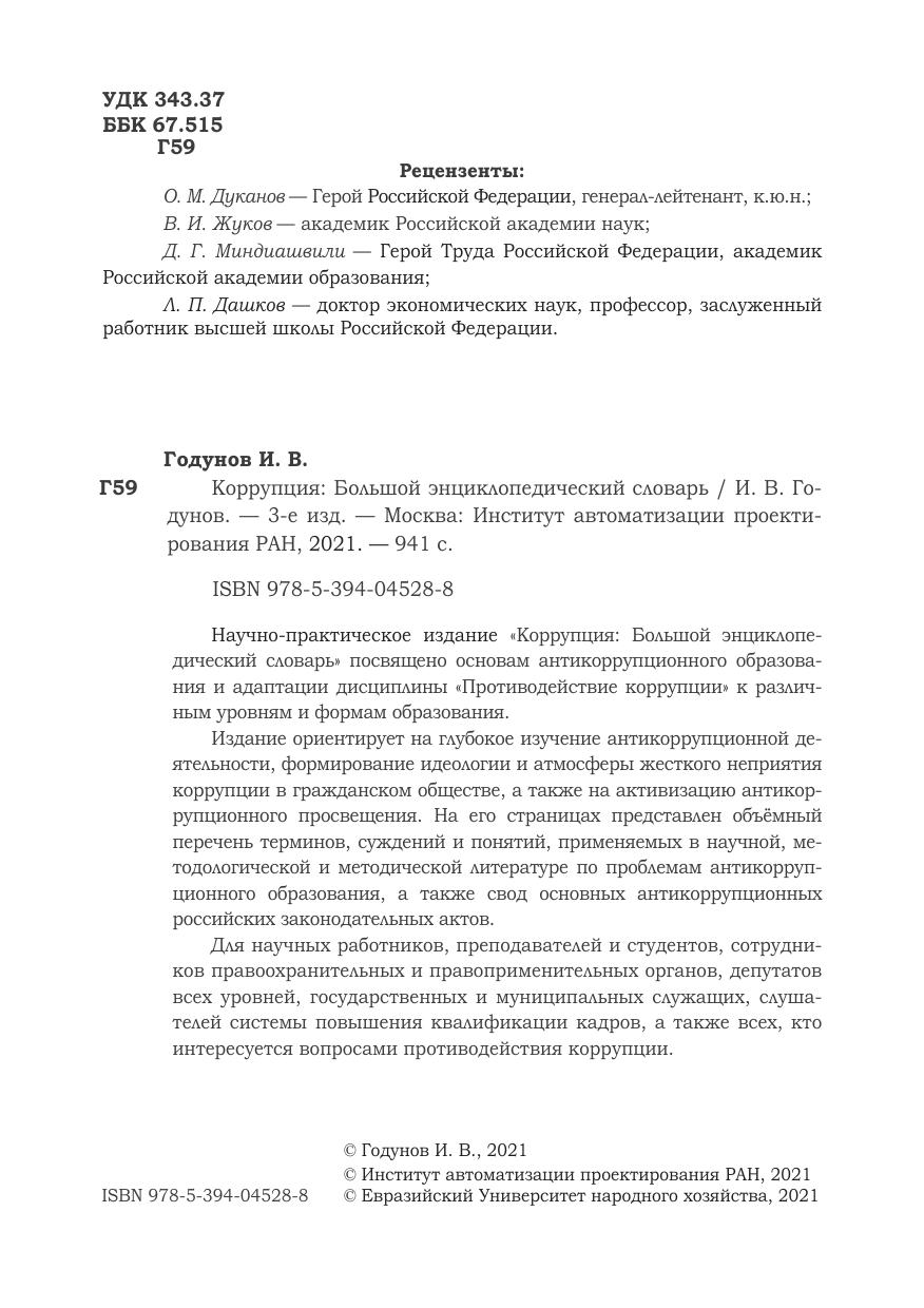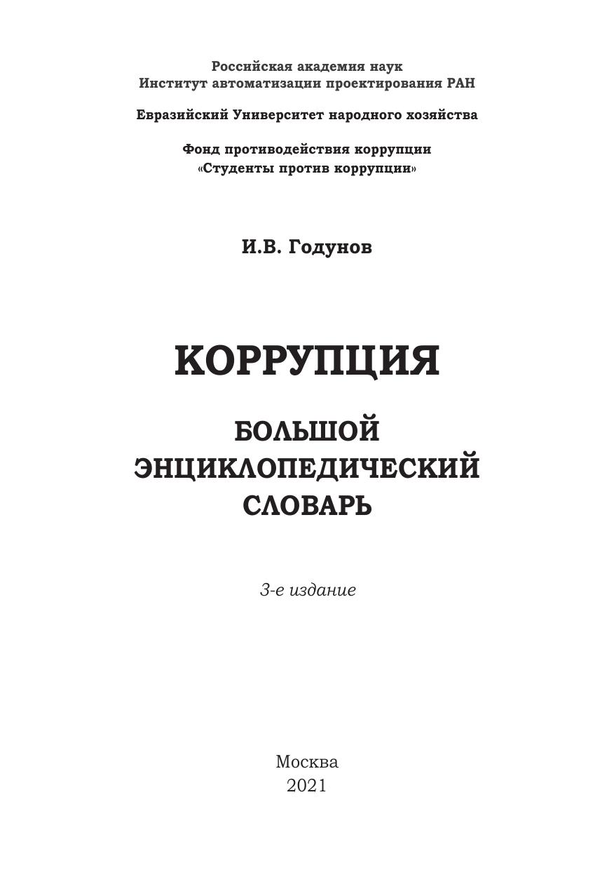 Научно-практическое издание «Коррупция: Большой энциклопе- дический словарь» посвящено основам антикоррупционного образования и адаптации дисциплины «Противодействие коррупции» к различным уровням и формам образования.