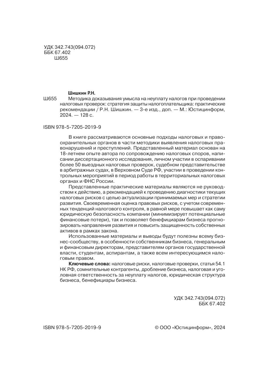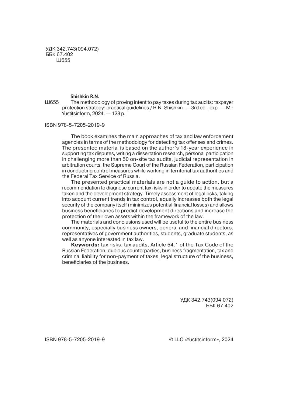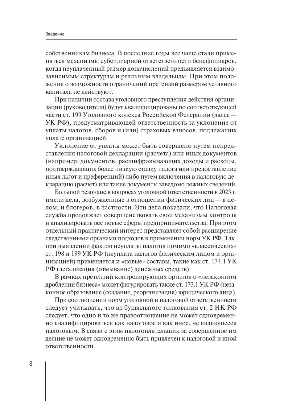 В книге рассматриваются основные подходы налоговых и правоохранительных органов в части методики выявления налоговых правонарушений и преступлений. Представленный материал основан на 18-летнем опыте автора по сопровождению налоговых споров, написании диссертационного исследования, личном участии в оспаривании более 50 выездных налоговых проверок, судебном представительстве в арбитражных судах, в Верховном Суде РФ, участии в проведении контрольных мероприятий в период работы в территориальных налоговых органах и ФНС России. Представленные практические материалы являются не руководством к действию, а рекомендацией к проведению диагностики текущих налоговых рисков с целью актуализации принимаемых мер и стратегии развития. Своевременная оценка правовых рисков, с учетом современных тенденций налогового контроля, в равной мере повышает как саму юридическую безопасность компании (минимизирует потенциальные финансовые потери), так и позволяет бенефициарам бизнеса прогнозировать направления развития и повысить защищенность собственных активов в рамках закона. Использованные материалы и выводы будут полезны всему бизнес-сообществу, в особенности собственникам бизнеса, генеральным и финансовым директорам, представителям органов государственной власти, студентам, аспирантам, а также всем интересующимся налоговым правом.
