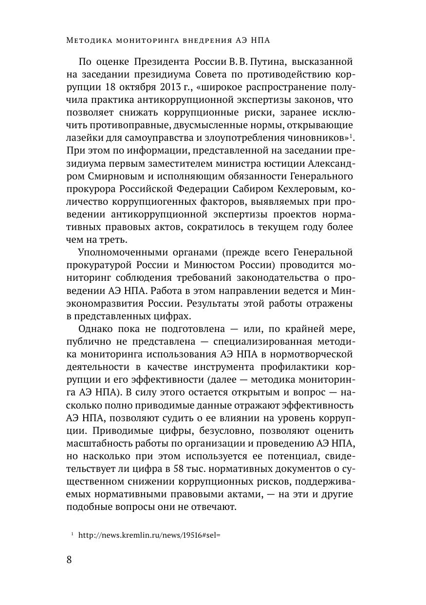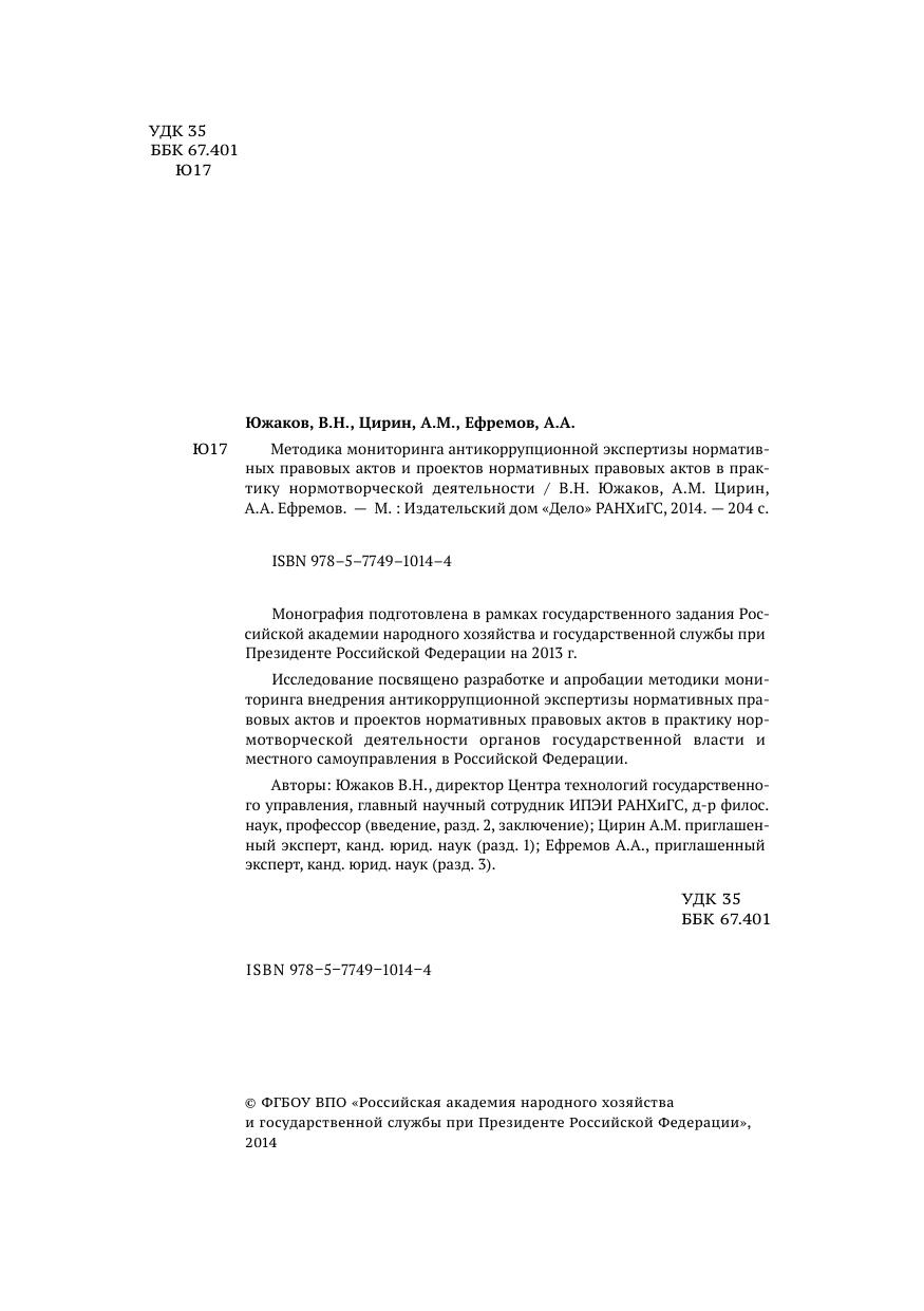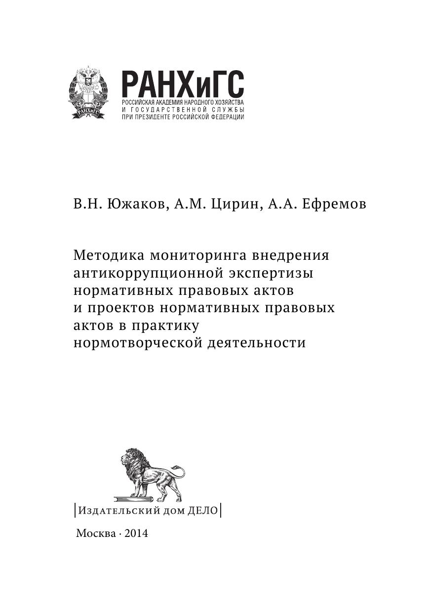 Монография подготовлена в рамках государственного задания Российской академии народного хозяйства и государственной службы при Президенте Российской Федерации на 2013 г. Исследование посвящено разработке и апробации методики мониторинга внедрения антикоррупционной экспертизы нормативных правовых актов и проектов нормативных правовых актов в практику нормотворческой деятельности органов государственной власти и местного самоуправления в Российской Федерации. Авторы: Южаков В.Н., директор Центра технологий государственного управления, главный научный сотрудник ИПЭИ РАНХиГС, д-р филос. наук, профессор (введение, разд. 2, заключение), Цирин А.М. приглашенный эксперт, канд. юрид. наук (разд. 1), Ефремов А.А., приглашенный эксперт, канд. юрид. наук (разд. 3).