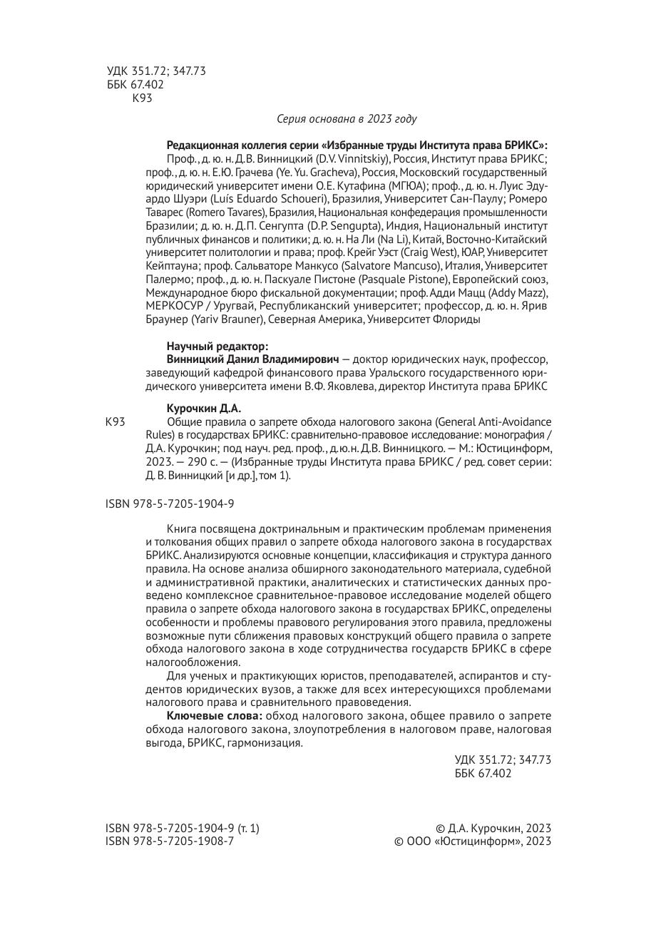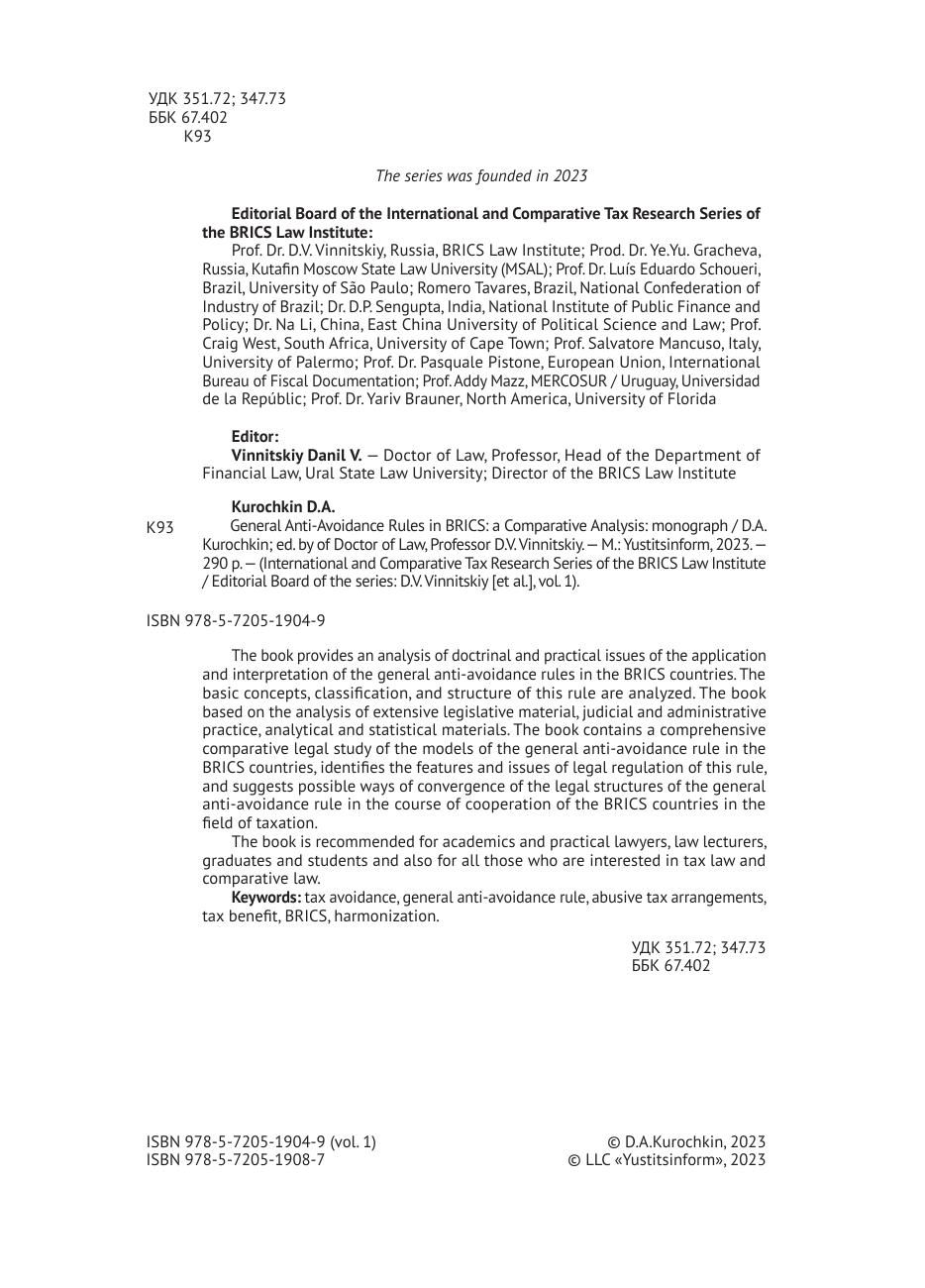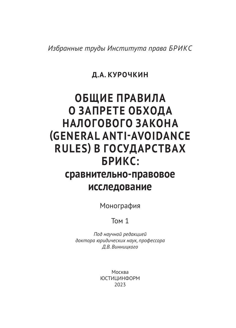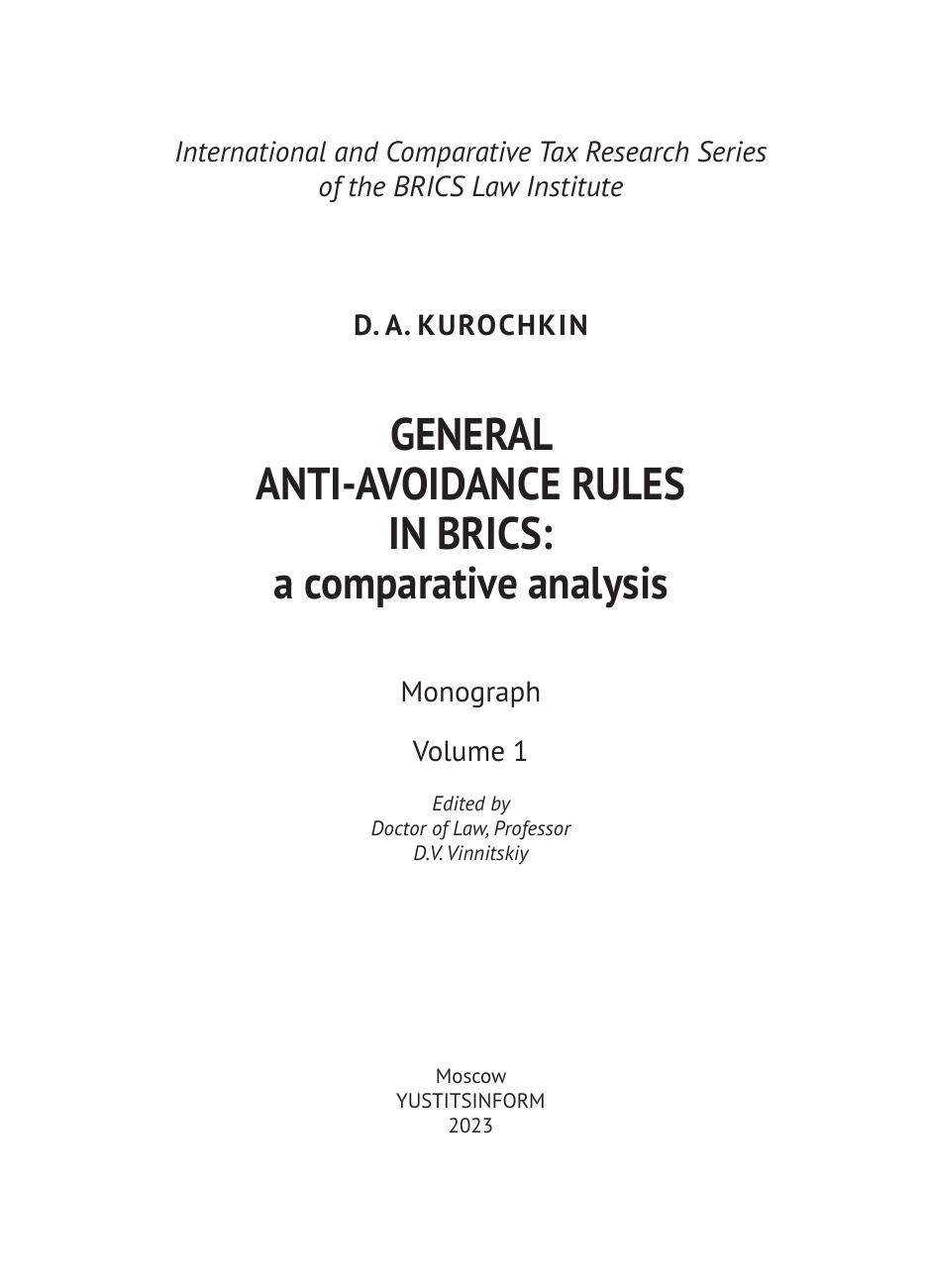 Общие правила о запрете обхода налогового закона (General Anti-Avoidance Rules) в государствах БРИКС: сравнительно-правовое исследование. Том 1
