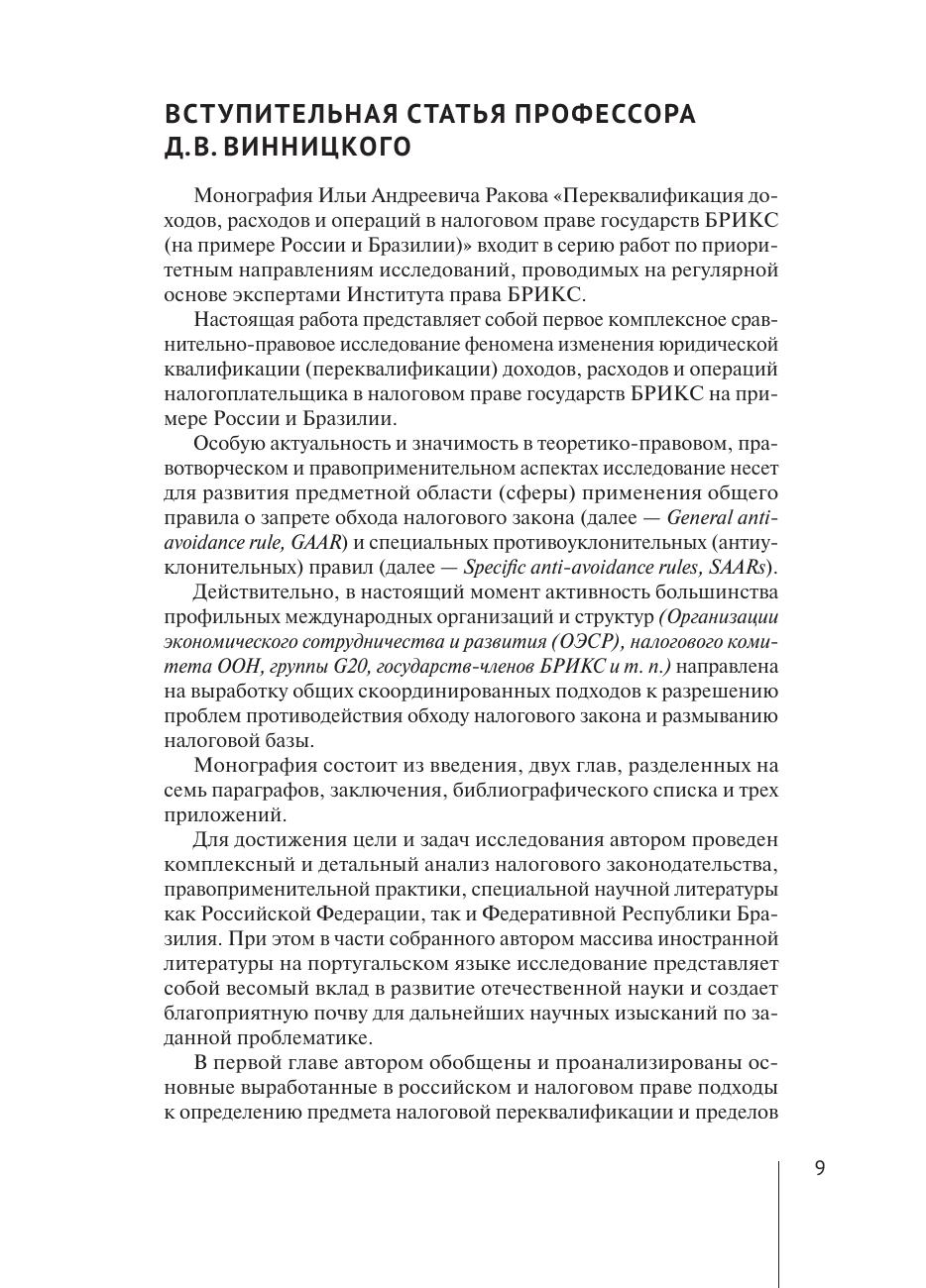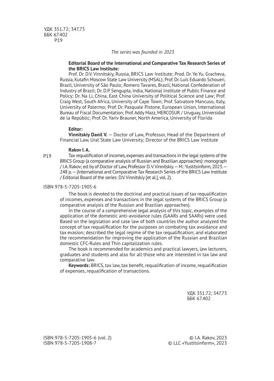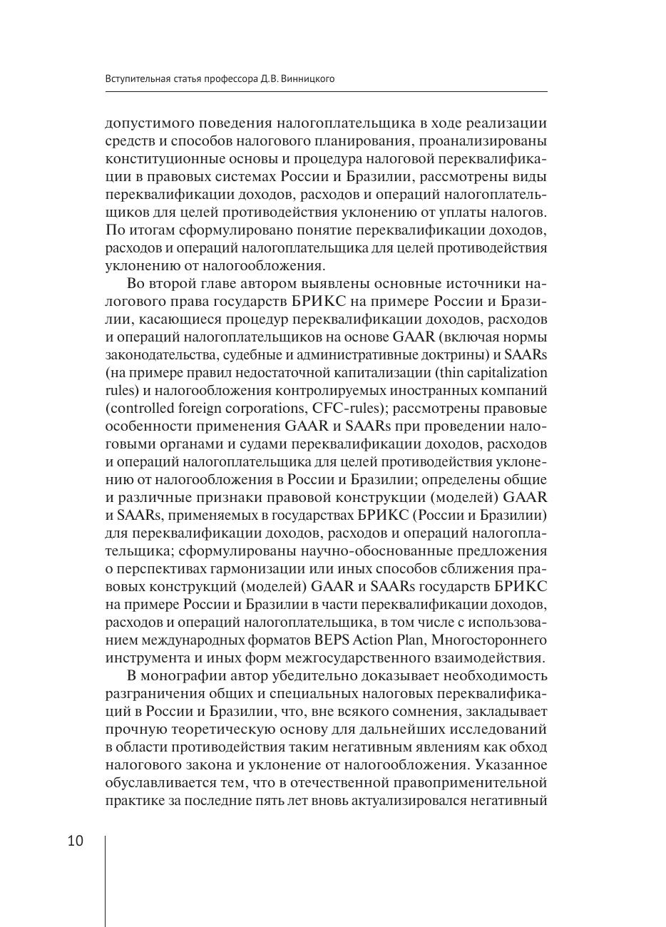 Книга посвящена доктринальным и практическим проблемам переквалификации доходов, расходов и операций в налоговом праве государств БРИКС на примере подходов в правовых системах России и Бразилии. В ходе комплексного правового анализа данной темы использованы примеры применения общих (GAARs) и специальных (SAARs) антиуклонительных норм. На основе законодательства и правоприменительной практики указанных юрисдикций сформулировано понятие налоговой переквалификации для целей противодействия уклонению от уплаты налогов, предмет налоговой переквалификации, описан его правовой режим, выявлены особенности и даны рекомендации для целей совершенствования применения российских национальных «Правил КИК» (CFC-rules) и «Правил о недостаточной капитализации» (Thin capitalization rules). Для ученых и практикующих юристов, преподавателей, аспирантов и студентов юридических вузов, а также для всех интересующихся проблемами налогового права и сравнительного правоведения.