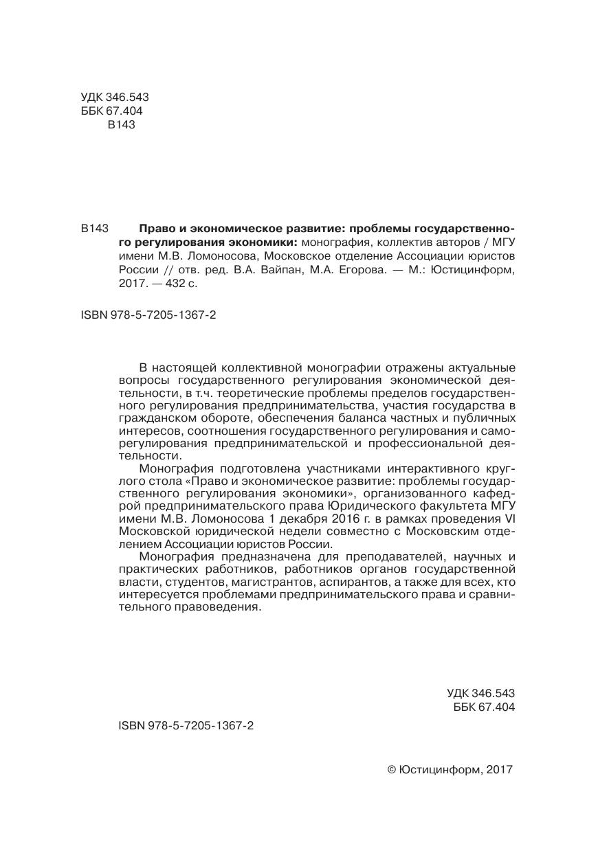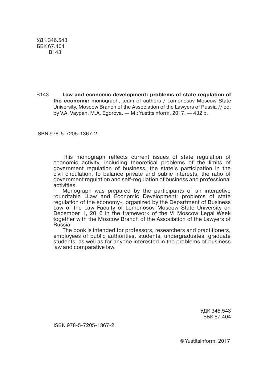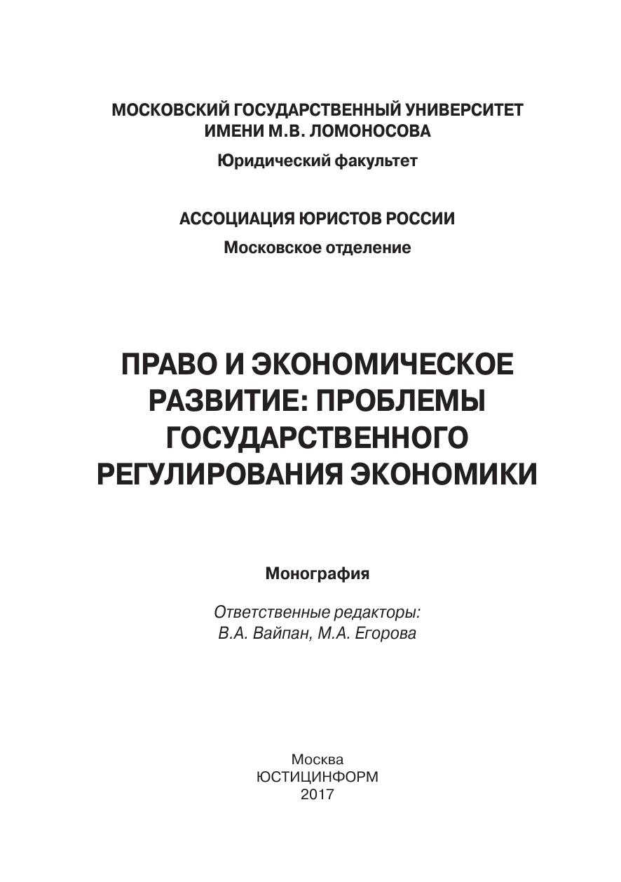 Монография подготовлена участниками интерактивного круглого стола «Право и экономическое развитие: проблемы государственного регулирования экономики», организованного кафедрой предпринимательского права Юридического факультета МГУ имени М.В. Ломоносова 1 декабря 2016 г. в рамках проведения VI Московской юридической недели совместно с Московским отделением Ассоциации юристов россии.