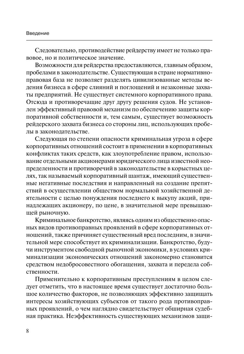 В научно-практическом пособии исследуется понятие корпоративных отношений, проблемы концептуального характера, касающиеся теоретико-правовой основы построения системы защиты прав акционеров. Особое внимание уделяется изучению современных криминальных угроз в сфере корпоративных отношений.Проанализированы актуальные юридические и организационно-практические меры противодействия указанным явлениям, с учетом охранительных и регулятивных возможностей как цивилистических отраслей права, так и права отраслей криминального цикла. Рассмотрены возможности собственников бизнеса по противодействию данным криминальным угрозам, сформулированы соответствующие практические рекомендации. Комплексно исследована проблема обеспечения защиты корпоративных отношений с позиций экономики, политики, позитивного и административного права, права отраслей криминального цикла. Изучен зарубежный опыт законодательной регламентации корпоративных отношений и противодействия современным криминальным угрозам в данной сфере, сформулированы предложения по использованию такого опыта в отечественной правотворческой и правоприменительной практике.Разработанные автором приложения в форме таблиц и схем помогут лучшему усвоению и закреплению материала.