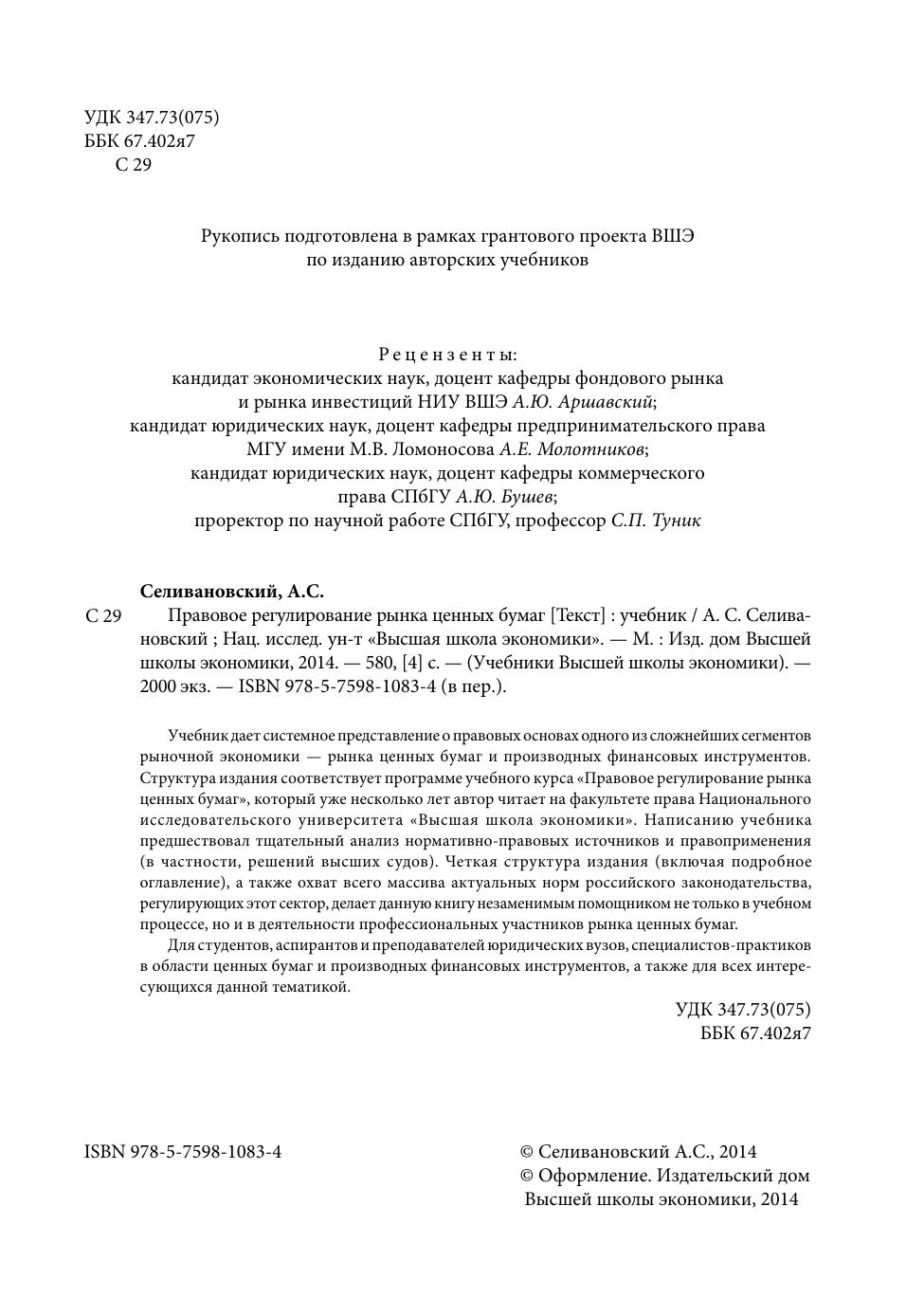Гриф: Рекомендовано федеральным государственным бюджетным образовательным учреждением высшего профессионального образования «Санкт-Петербургский государственный университет» в качестве учебника по дисциплине «Правовое регулирование рынка ценных бумаг» для студентов высших учебных заведений, обучающихся по специальности 030501.65 «Юриспруденция» (подготовка специалиста по гражданско-правовой специализации) и по направлению 030500.68 «Юриспруденция» (подготовка магистра)