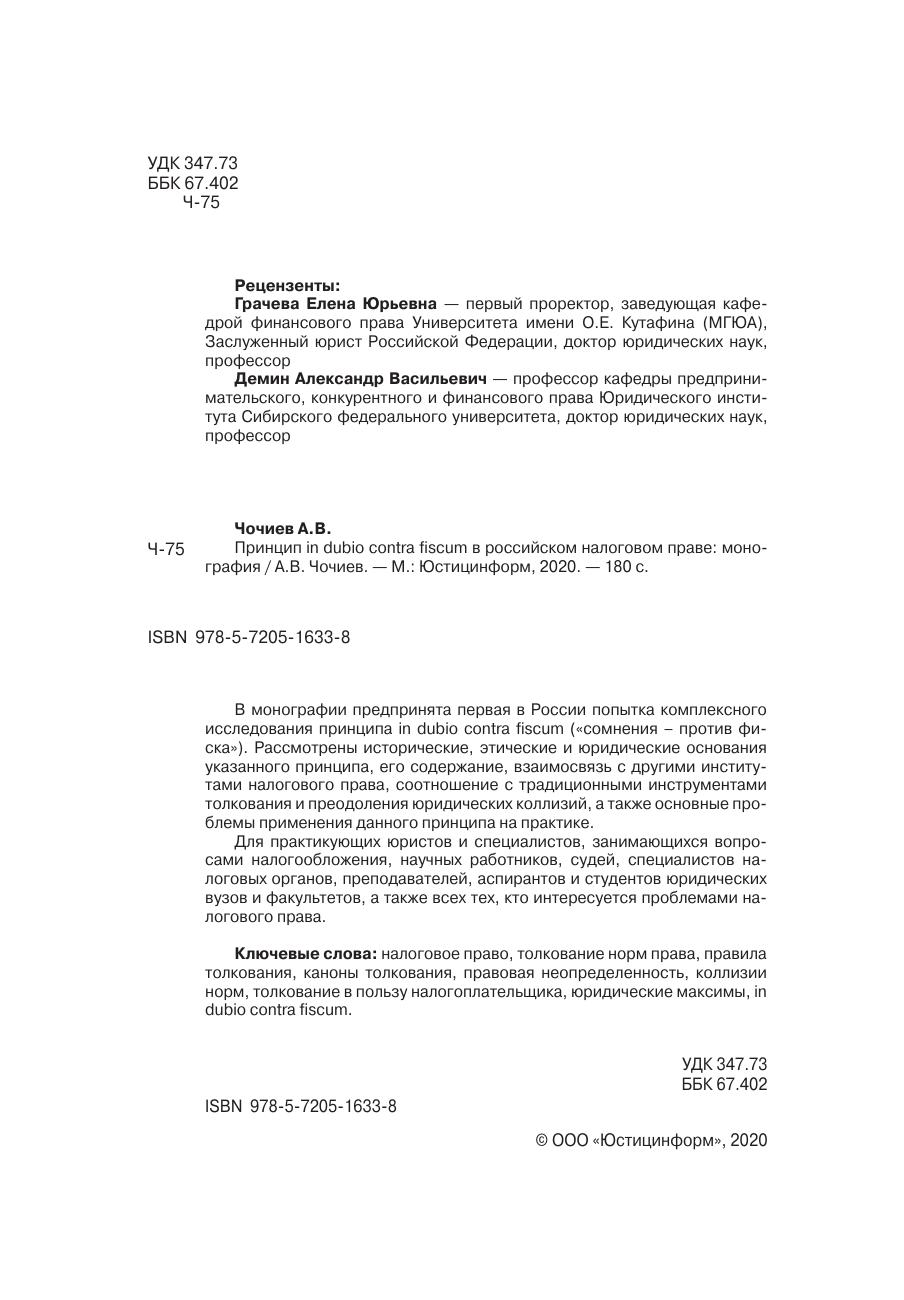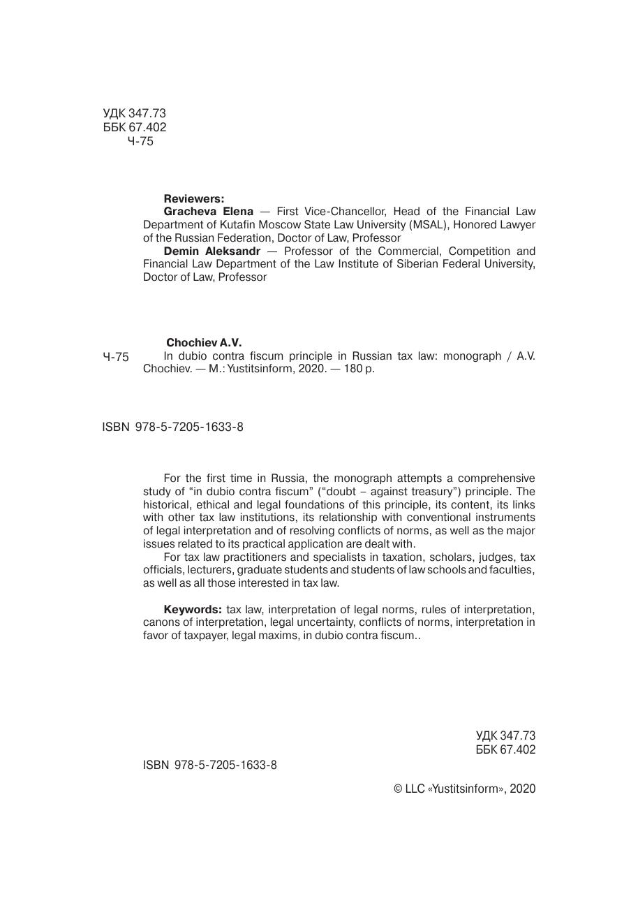 В монографии предпринята первая в России попытка комплексного исследования принципа in dubio contra fiscum («сомнения – против фиска»). Рассмотрены исторические, этические и юридические основания указанного принципа, его содержание, взаимосвязь с другими институтами налогового права, соотношение с традиционными инструментами толкования и преодоления юридических коллизий, а также основные проблемы применения данного принципа на практике. Для практикующих юристов и специалистов, занимающихся вопросами налогообложения, научных работников, судей, специалистов налоговых органов, преподавателей, аспирантов и студентов юридических вузов и факультетов, а также всех тех, кто интересуется проблемами налогового права.