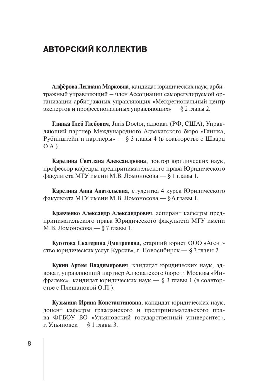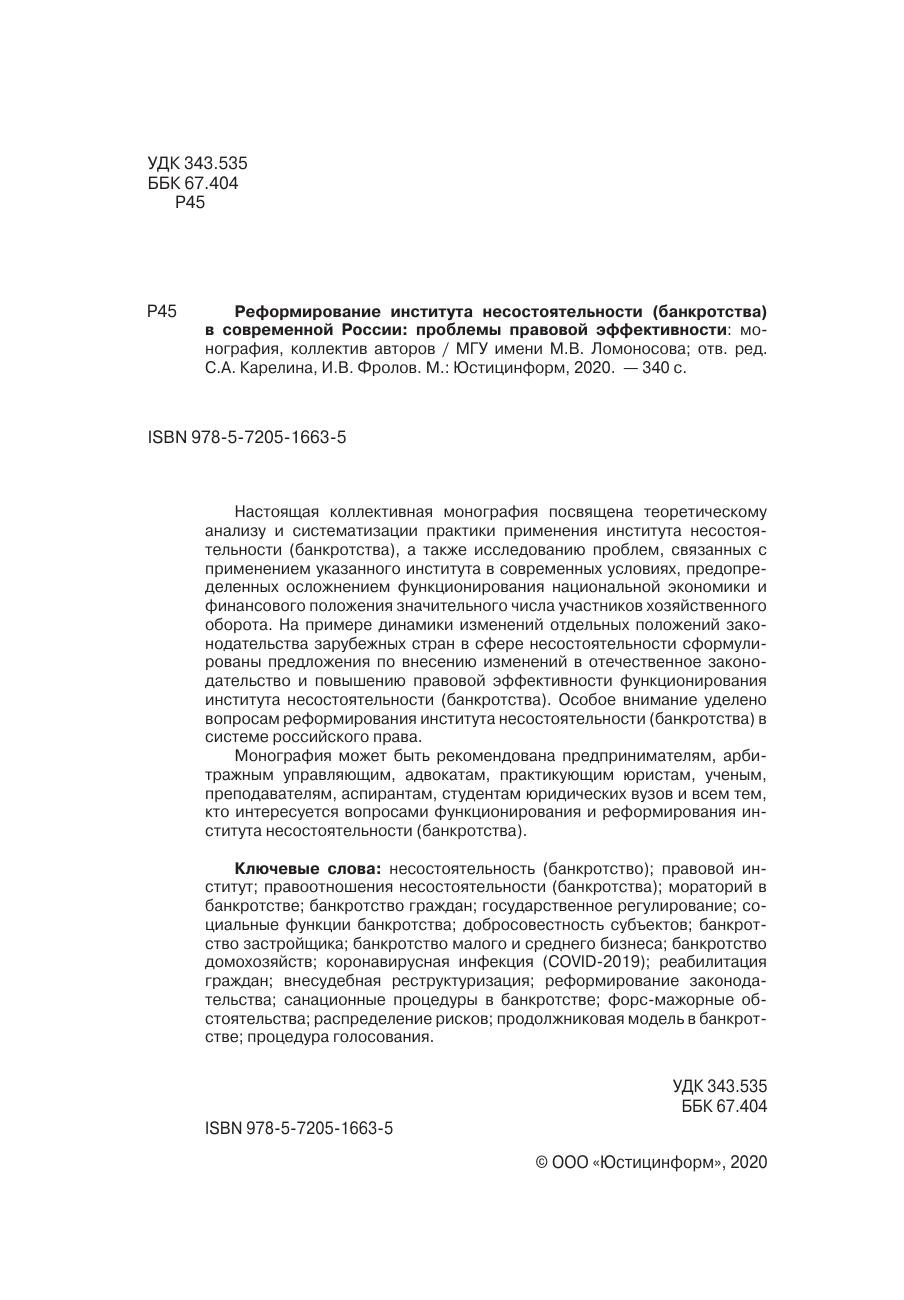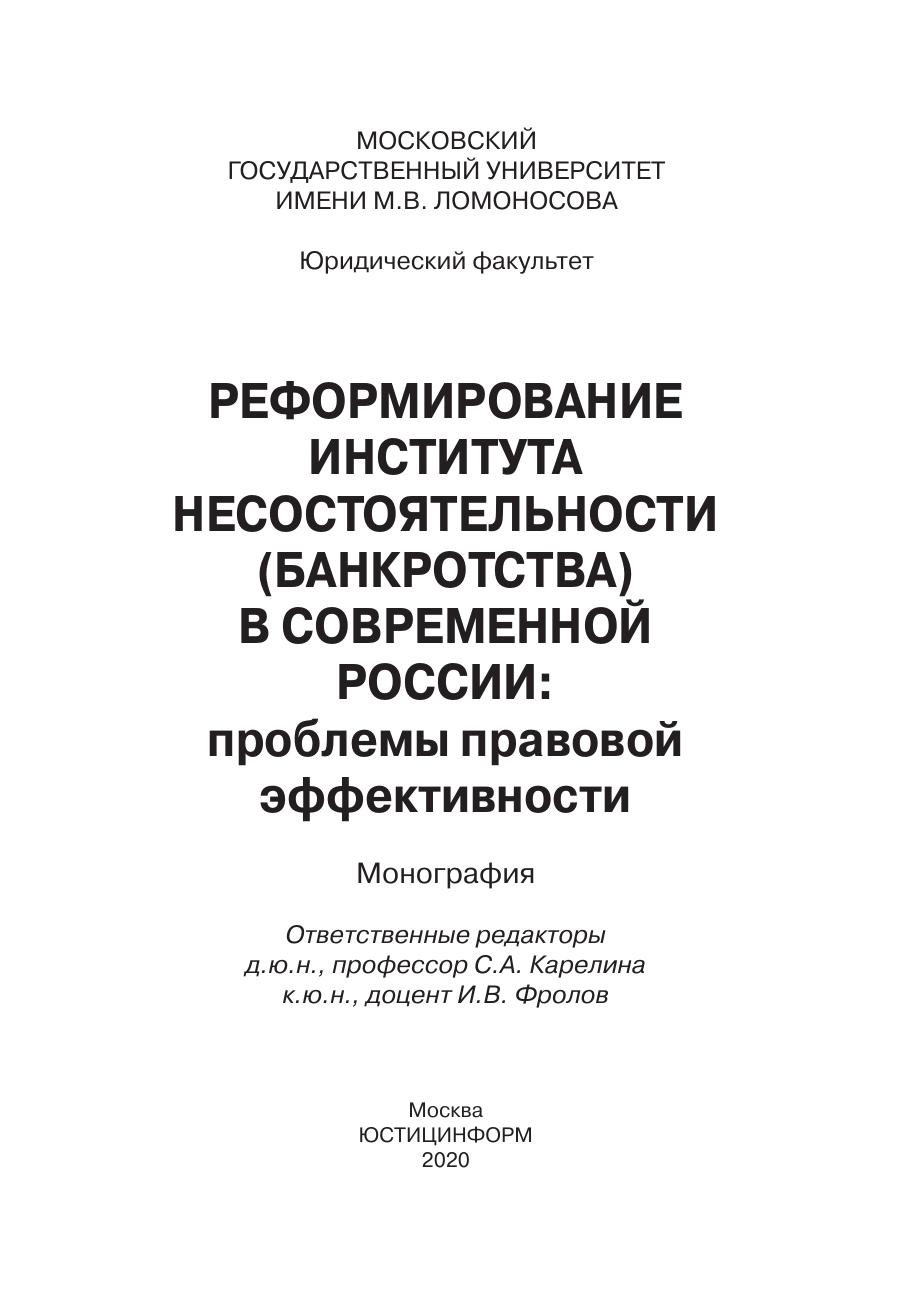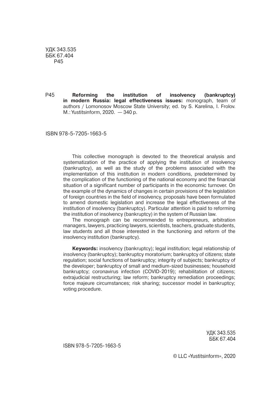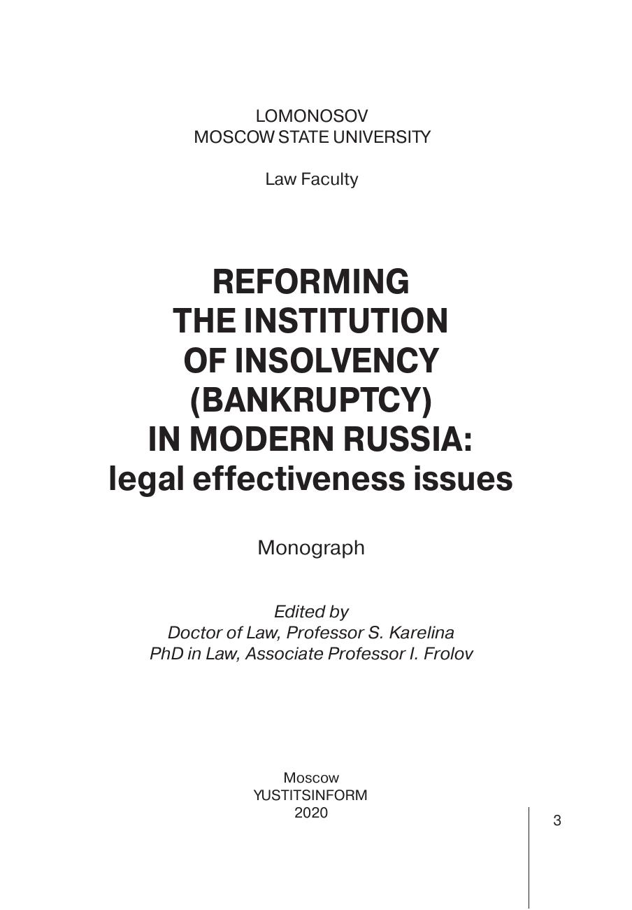 Настоящая коллективная монография посвящена теоретическому анализу и систематизации практики применения института несостоятельности (банкротства), а также исследованию проблем, связанных с применением указанного института в современных условиях, предопределенных осложнением функционирования национальной экономики и финансового положения значительного числа участников хозяйственного оборота. На примере динамики изменений отдельных положений законодательства зарубежных стран в сфере несостоятельности сформулированы предложения по внесению изменений в отечественное законодательство и повышению правовой эффективности функционирования института несостоятельности (банкротства). Особое внимание уделено вопросам реформирования института несостоятельности (банкротства) в системе российского права. Монография может быть рекомендована предпринимателям, арбитражным управляющим, адвокатам, практикующим юристам, ученым, преподавателям, аспирантам, студентам юридических вузов и всем тем, кто интересуется вопросами функционирования и реформирования института несостоятельности (банкротства).