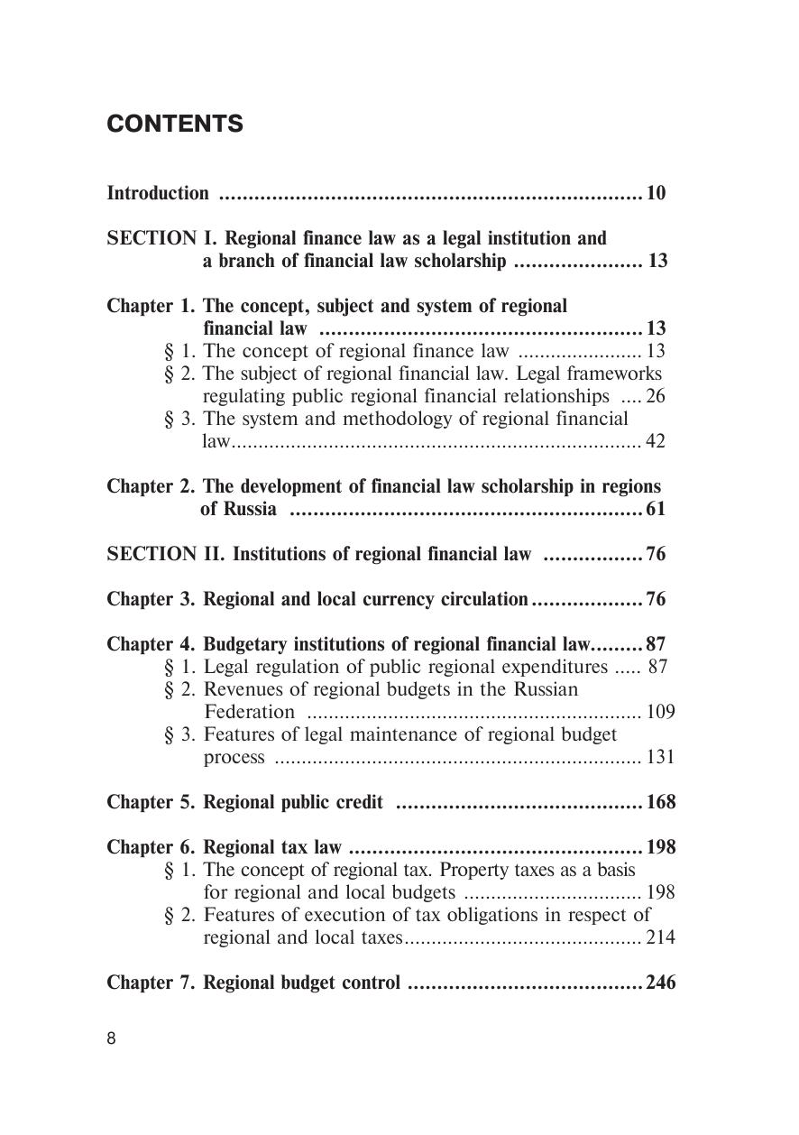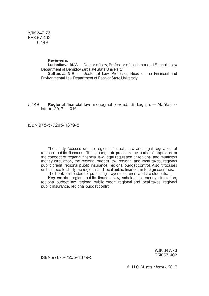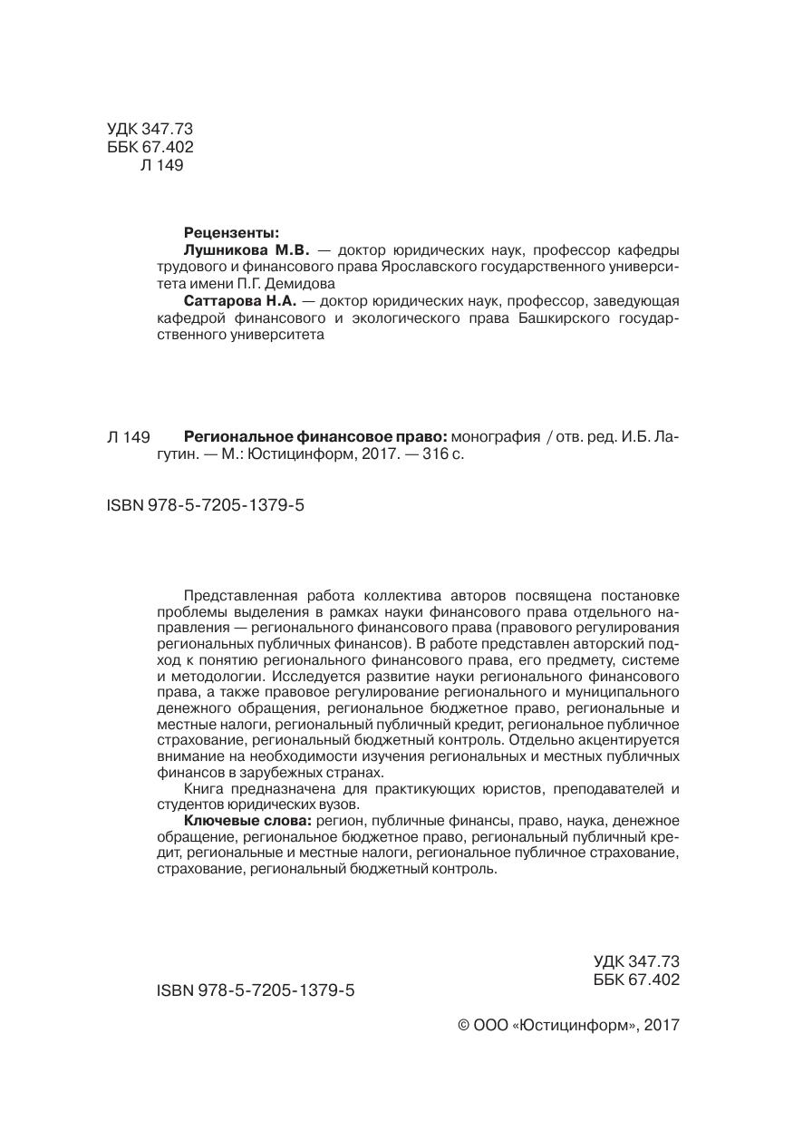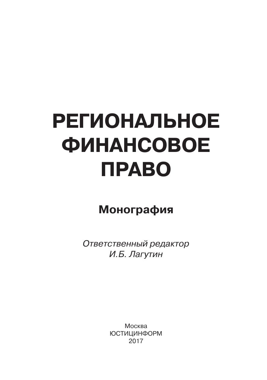Представленная работа коллектива авторов посвящена постановке проблемы выделения в рамках науки финансового права отдельного направления — регионального финансового права (правового регулирования региональных публичных финансов). В работе представлен авторский подход к понятию регионального финансового права, его предмету, системе и методологии. Исследуется развитие науки регионального финансового права, а также правовое регулирование регионального и муниципального денежного обращения, региональное бюджетное право, региональные и местные налоги, региональный публичный кредит, региональное публичное страхование, региональный бюджетный контроль. Отдельно акцентируется внимание на необходимости изучения региональных и местных публичных финансов в зарубежных странах.