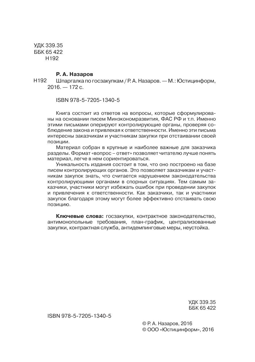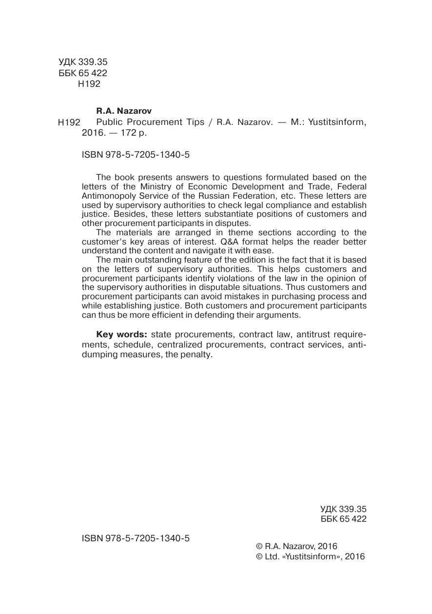 Книга состоит из ответов на вопросы, которые сформулированы на основании писем Минэкономразвития, фАс рф и т.п. именно этими письмами оперируют контролирующие органы, проверяя соблюдение закона и привлекая к ответственности. именно эти письма интересны заказчикам и участникам закупки при отстаивании своей позиции. Материал собран в крупные и наиболее важные для заказчика разделы. формат «вопрос – ответ» позволяет читателю лучше понять материал, легче в нем сориентироваться. Уникальность издания состоит в том, что оно построено на базе писем контролирующих органов. Это позволяет заказчикам и участникам закупок знать, что считается нарушением законодательства контролирующими органами в спорных ситуациях. тем самым заказчики, участники могут избежать ошибок при проведении закупок и привлечения к ответственности. Как заказчики, так и участники закупок благодаря этому могут более эффективно отстаивать свою позицию.