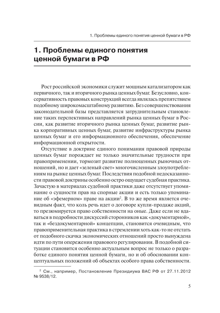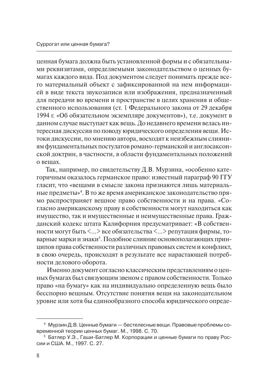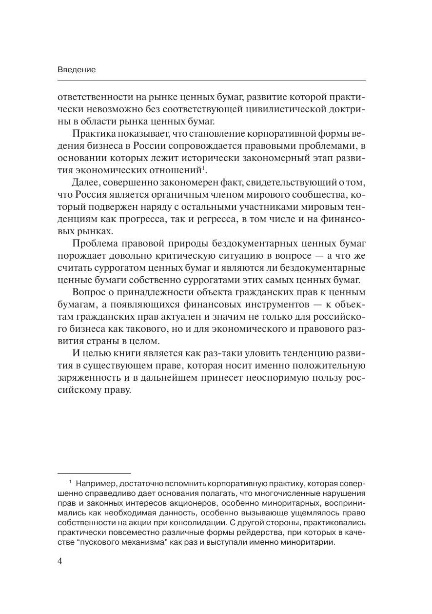 Ценные бумаги являются необходимым спутником рыночной эконо-мики. Повышенный интерес современной науки к эмиссионным ценнымбумагам, особенно к бездокументарным, объясняется прежде всего тем,что исторически сложилась такая ситуация, при которой российский ры-нок ценных бумаг после огромного по историческим и экономическимрамкам перерыва в развитии в период своего становления создает объ-ективную необходимость в совершенствовании оборота корпоративныхэмиссионных ценных бумаг. И если учесть, что стабильное развитие эко-номических отношений практически невозможно без усовершенствова-ния правовых конструкций, становится очевидной настоятельная необ-ходимость не только в изменении конкретных норм, в коррекции которыхвозникла безотлагательная потребность, но и в создании фундаменталь-ных положений о правовой природе и собственно правовой сущностиценных бумаг, особенно эмиссионных.Книга освещает проблематику правовой природы бездокументар-ных ценных бумаг и выявляет основные пробелы действующего законо-дательства. В результате прочтения данной книги можно прийти к выводуо том, что в результате правовой неопределенности практически все вы-пуски бездокументарных ценных бумаг можно признать выпусками сур-рогатных ценных бумаг по формальным основаниям. Данная проблема-тика помножена на проблему появления все новых видов ценных бумаг,которых действующее законодательство просто не знает