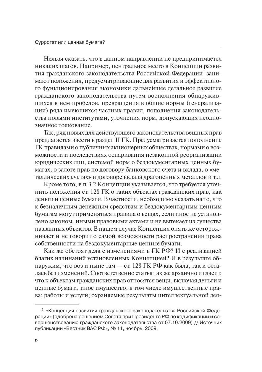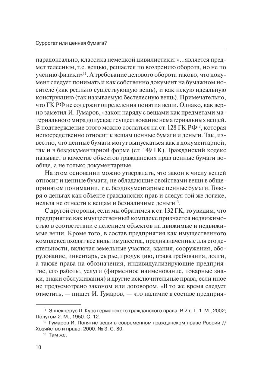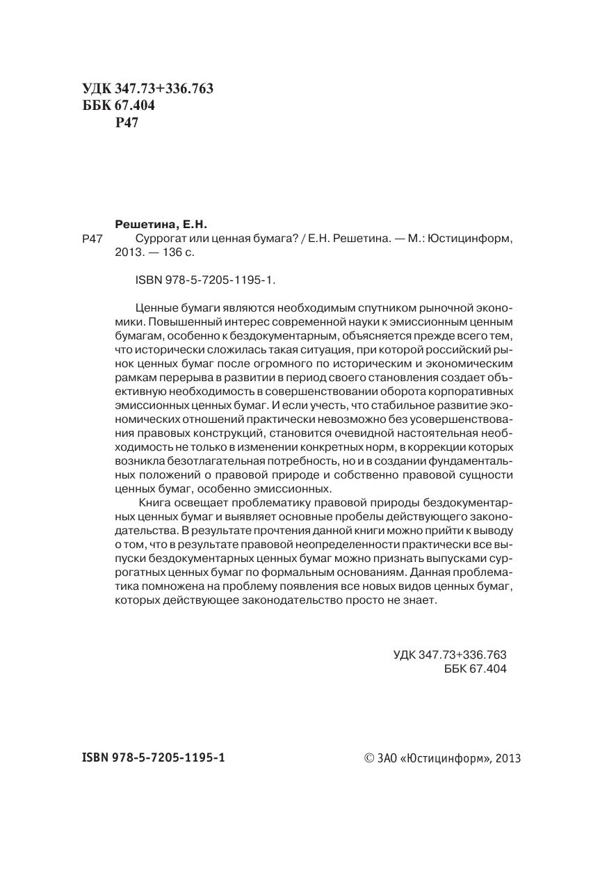 Ценные бумаги являются необходимым спутником рыночной эконо-мики. Повышенный интерес современной науки к эмиссионным ценнымбумагам, особенно к бездокументарным, объясняется прежде всего тем,что исторически сложилась такая ситуация, при которой российский ры-нок ценных бумаг после огромного по историческим и экономическимрамкам перерыва в развитии в период своего становления создает объ-ективную необходимость в совершенствовании оборота корпоративныхэмиссионных ценных бумаг. И если учесть, что стабильное развитие эко-номических отношений практически невозможно без усовершенствова-ния правовых конструкций, становится очевидной настоятельная необ-ходимость не только в изменении конкретных норм, в коррекции которыхвозникла безотлагательная потребность, но и в создании фундаменталь-ных положений о правовой природе и собственно правовой сущностиценных бумаг, особенно эмиссионных.Книга освещает проблематику правовой природы бездокументар-ных ценных бумаг и выявляет основные пробелы действующего законо-дательства. В результате прочтения данной книги можно прийти к выводуо том, что в результате правовой неопределенности практически все вы-пуски бездокументарных ценных бумаг можно признать выпусками сур-рогатных ценных бумаг по формальным основаниям. Данная проблема-тика помножена на проблему появления все новых видов ценных бумаг,которых действующее законодательство просто не знает