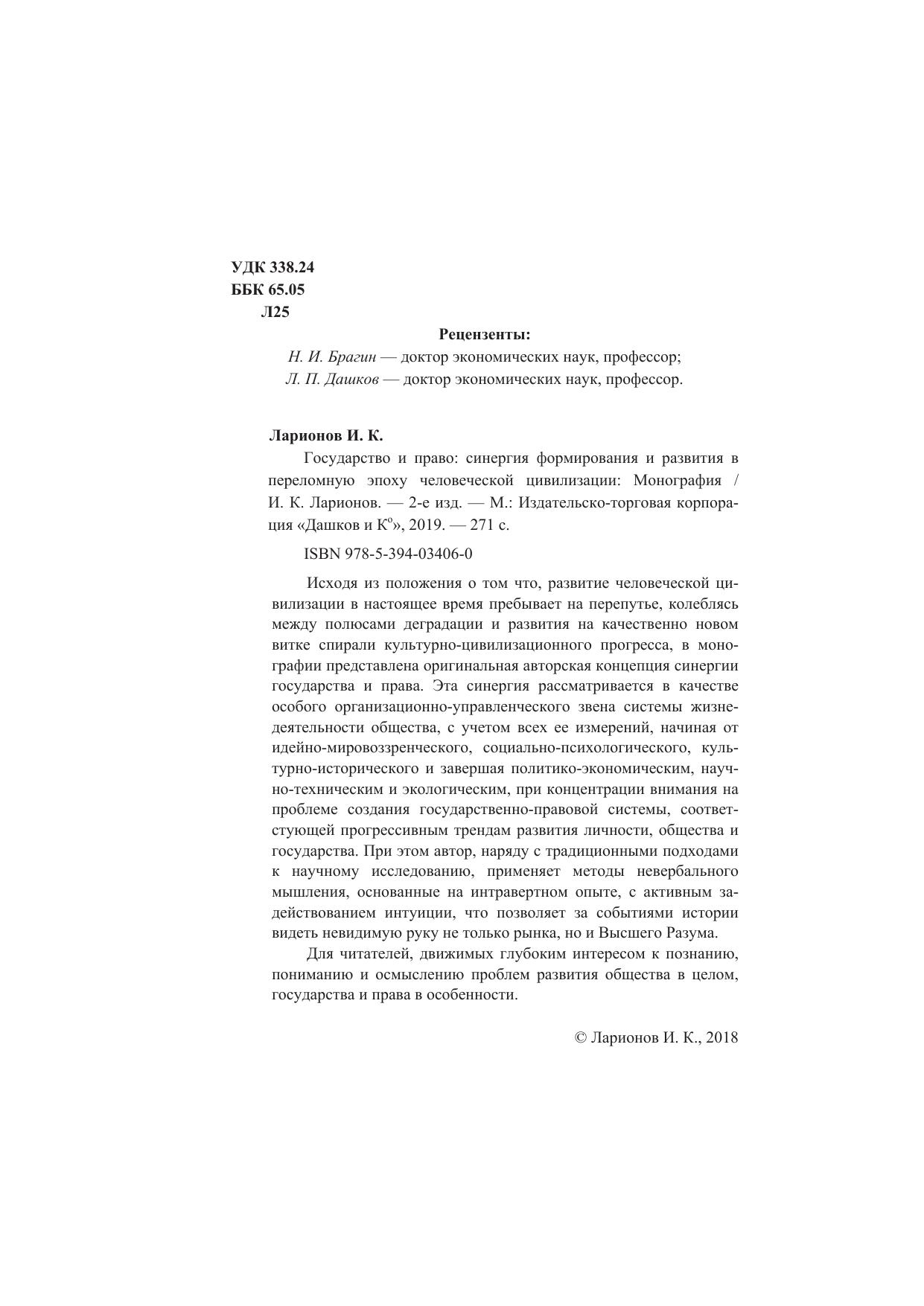 Исходя из положения о том, что развитие человеческой цивилизации в настоящее время пребывает на перепутье, колеблясь между плюсами деградации и развития на качественно новом витке спирали культурно-цивилизационного прогресса, в монографии представлена оригинальная авторская концепция синергии государства и права. Эта синергия рассматривается в качестве особого организационно-управленческого звена системы жизнедеятельности общества, с учетом всех ее изменений, начиная от идейно-мировоззренческого, социально-психологического, культурно-исторического и завершая политико-экономическим, научно-техническим и экологическим, при концентрации внимания на проблеме создания государственно-правовой системы, соответствующей прогрессивным трендам развития личности, общества и государства. При этом автор, наряду с традиционными подходами к научному исследованию, применяет методы невербального мышления, основанные на интровертном опыте, с активным задействованием интуиции, что позволяет за событиями истории видеть невидимую руку не только рынка, но и Высшего Разума. Для читателей, движимых глубоким интересом к познанию, пониманию и осмыслению проблем развития общества в целом государства и права в особенности.