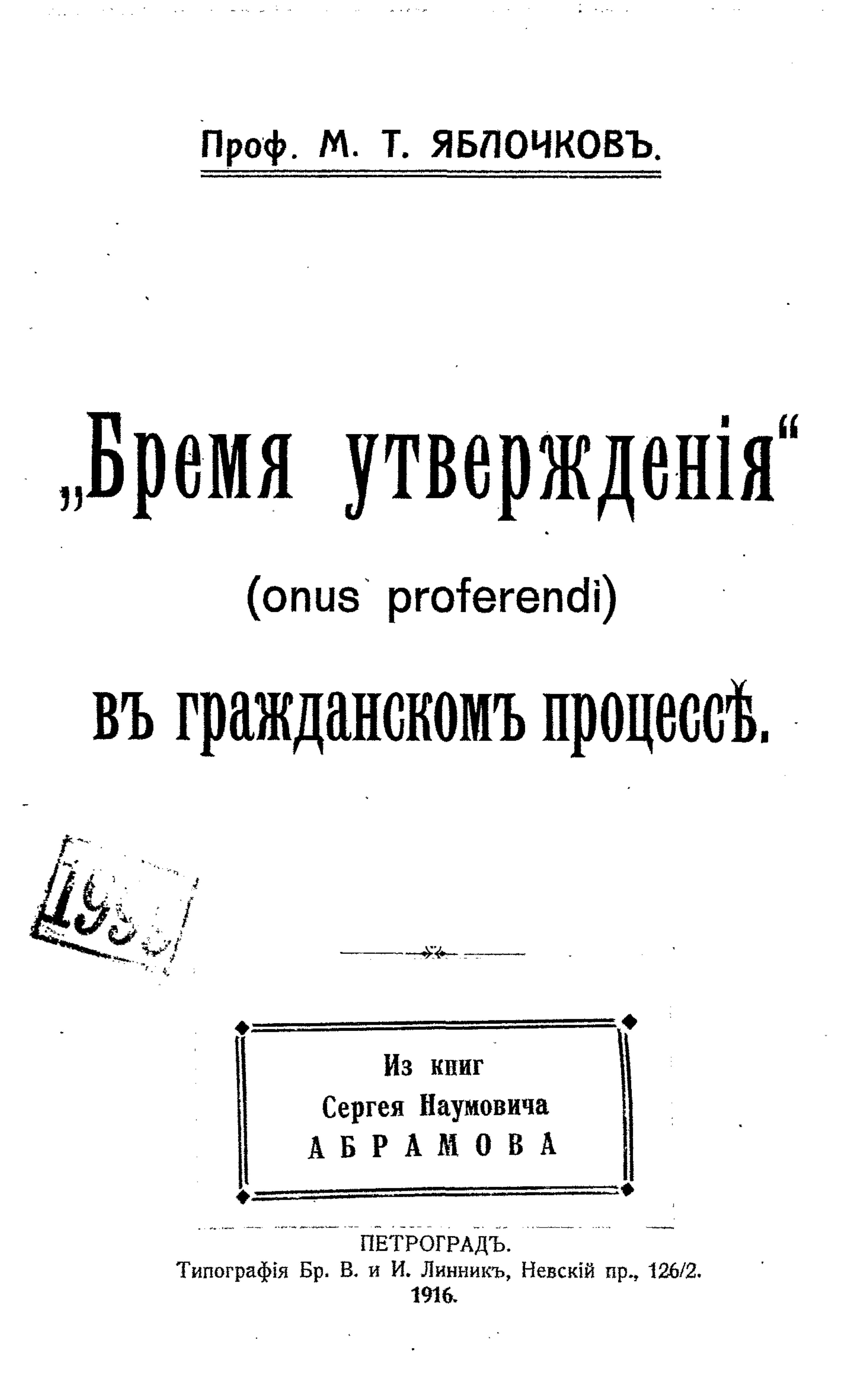 "Бремя утверждения" (onus proferendi) в гражданском процессе (из книг С. Н. Абрамова)