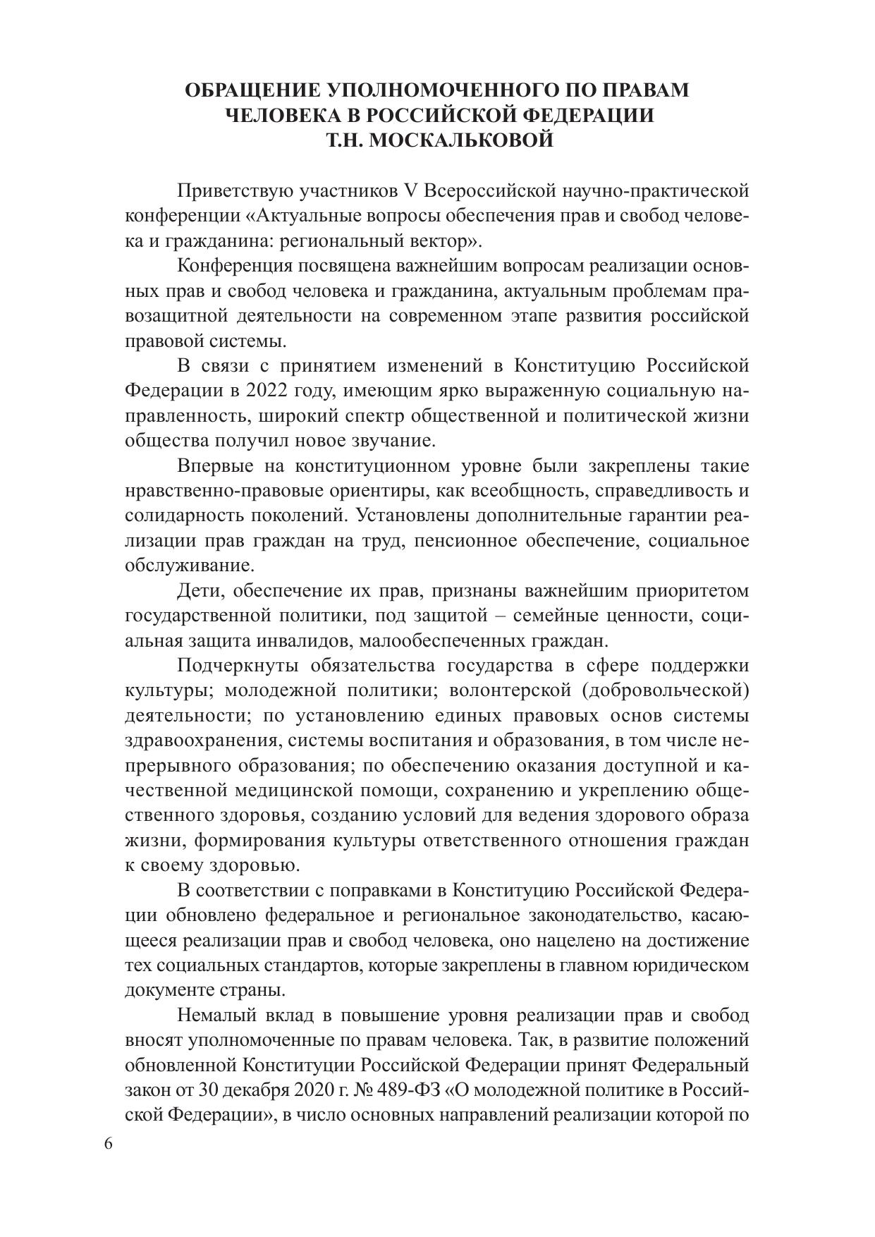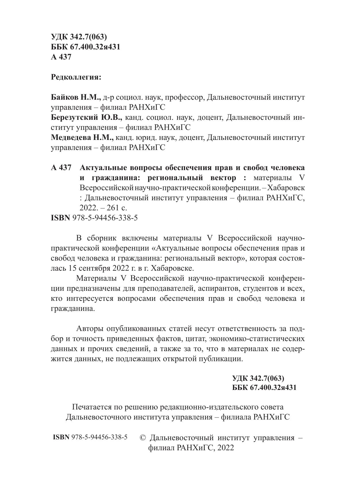 В сборник включены материалы V Всероссийской научнопрактической конференции «Актуальные вопросы обеспечения прав и свобод человека и гражданина: региональный вектор», которая состоялась 15 сентября 2022 г. в г. Хабаровске. Материалы V Всероссийской научно-практической конференции предназначены для преподавателей, аспирантов, студентов и всех, кто интересуется вопросами обеспечения прав и свобод человека и гражданина.