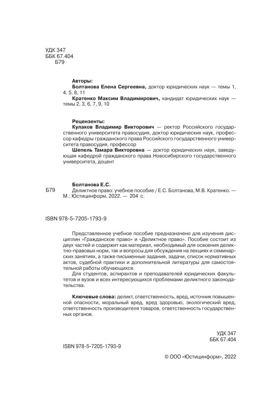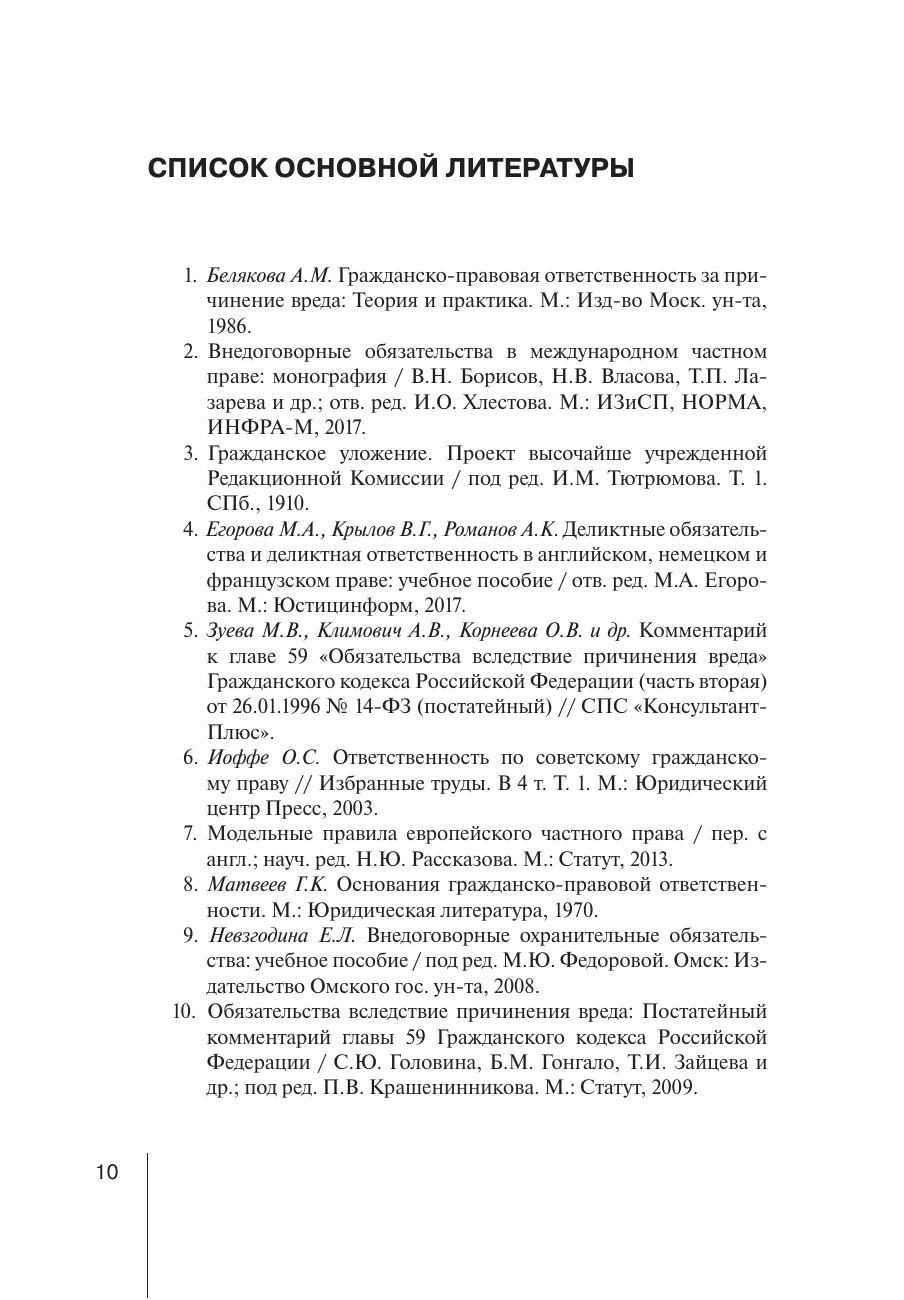Представленное учебное пособие предназначено для изучения дисциплин «Гражданское право» и «Деликтное право». Пособие состоит из двух частей и содержит как материал, необходимый для освоения деликтно-правовых норм, так и вопросы для обсуждения на лекциях и семинарских занятиях, а также письменные задания, задачи, список нормативных актов, судебной практики и дополнительной литературы для самостоятельной работы обучающихся.