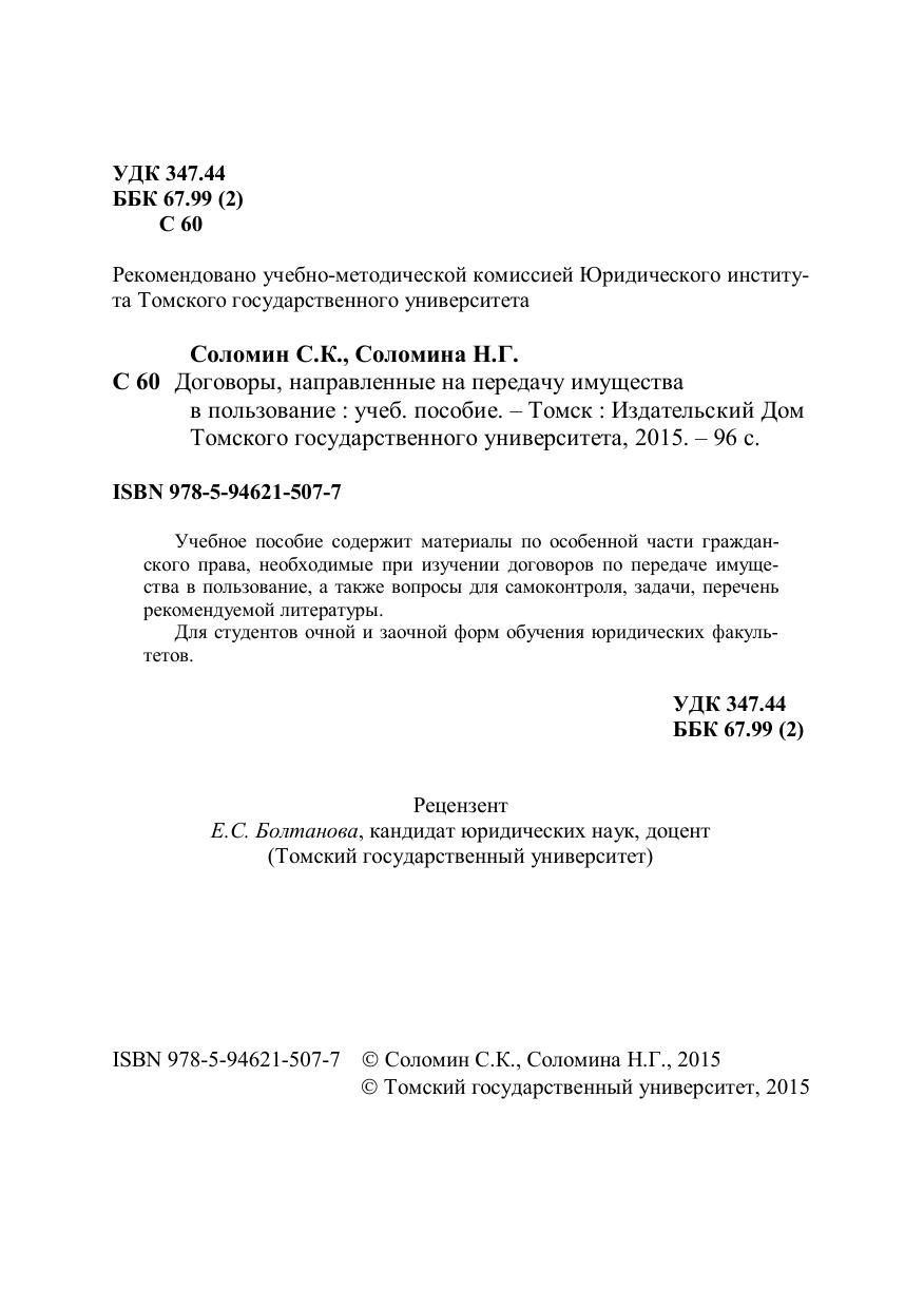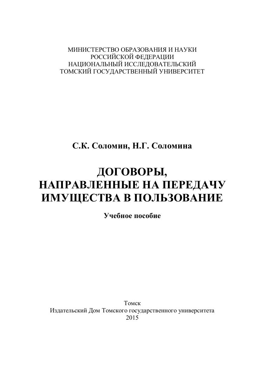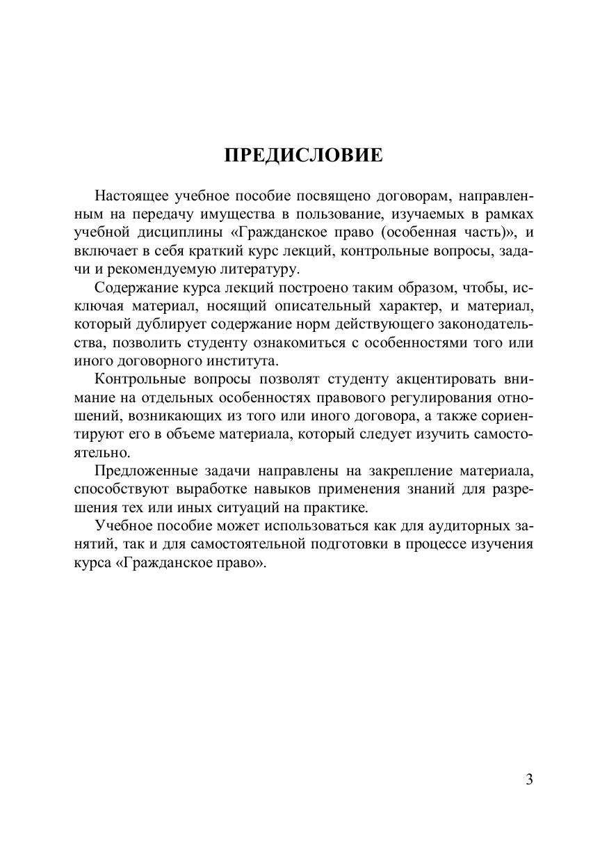 Учебное пособие содержит материалы по особенной части гражданского права, необходимые при изучении договоров по передаче имущества в пользование, а также вопросы для самоконтроля, задачи, перечень рекомендуемой литературы. Для студентов очной и заочной форм обучения юридических факультетов.