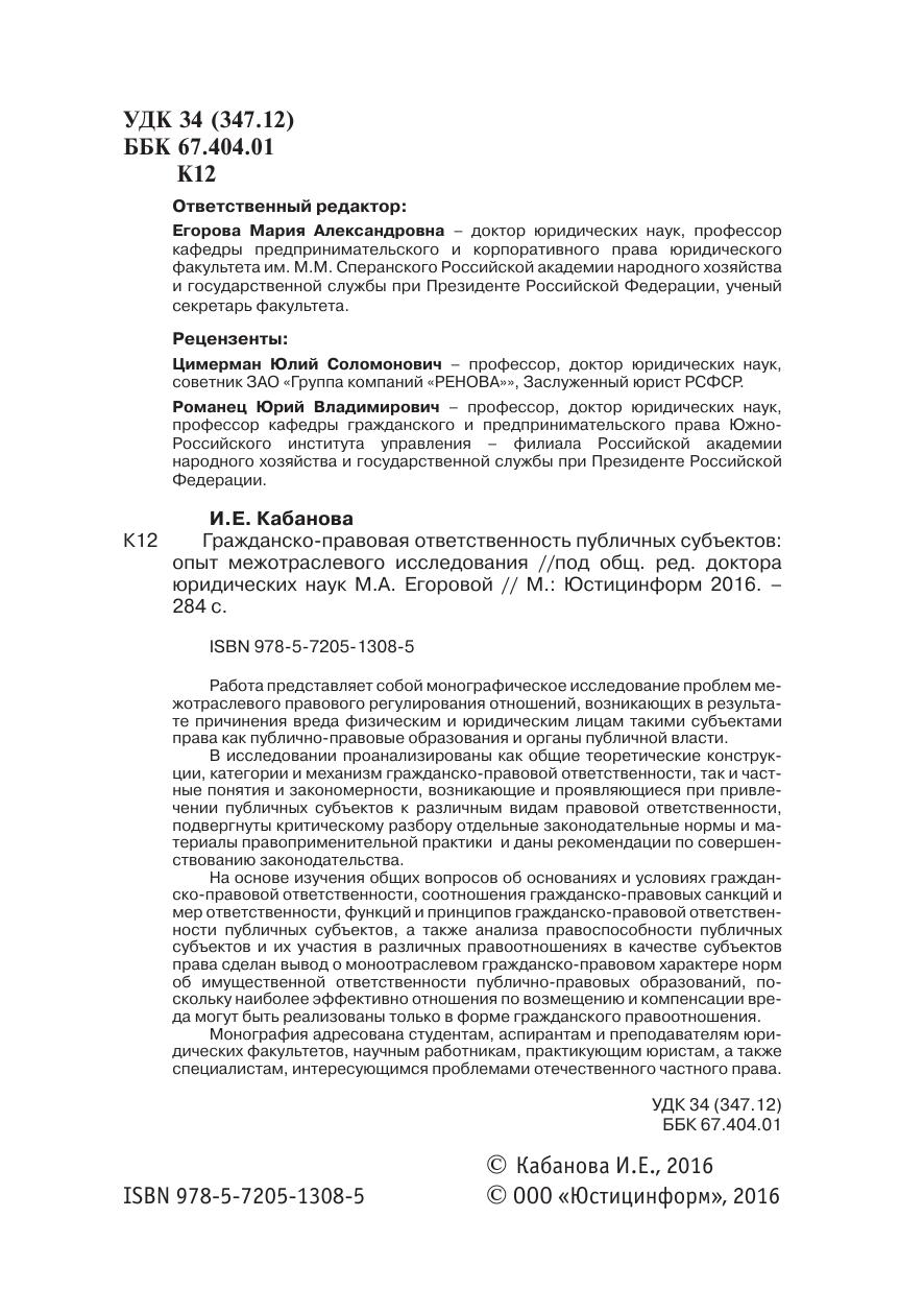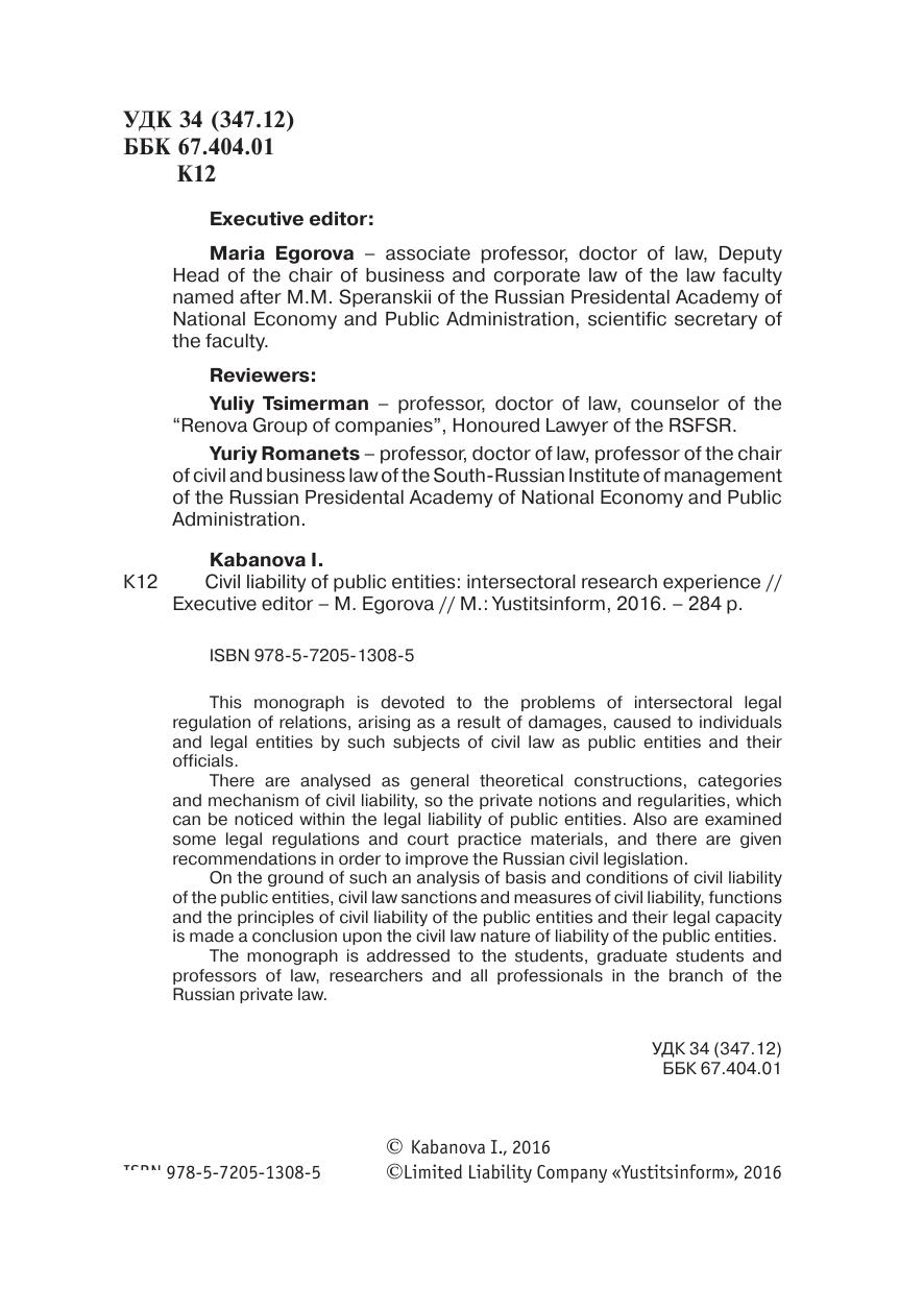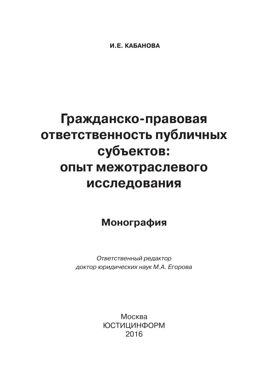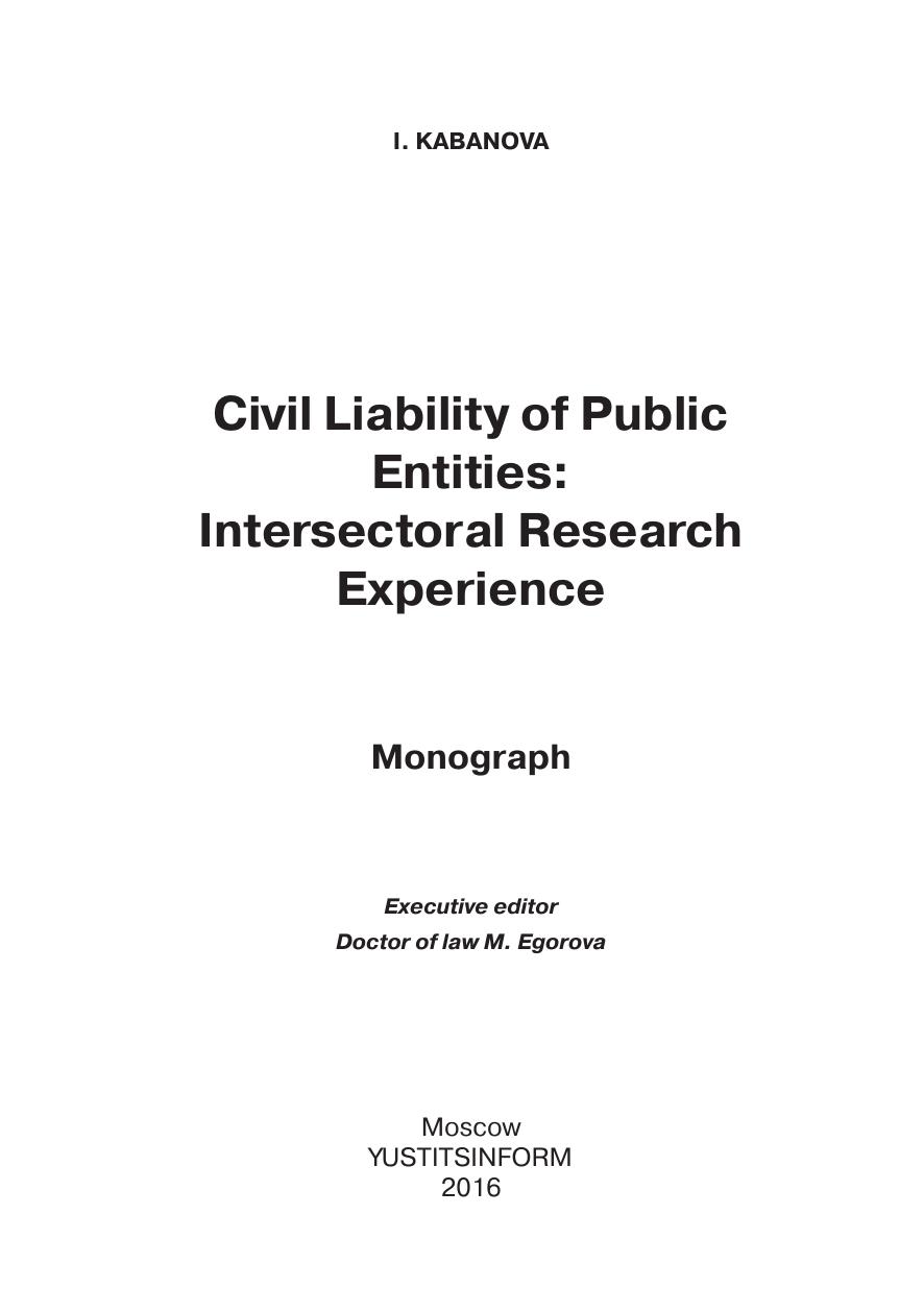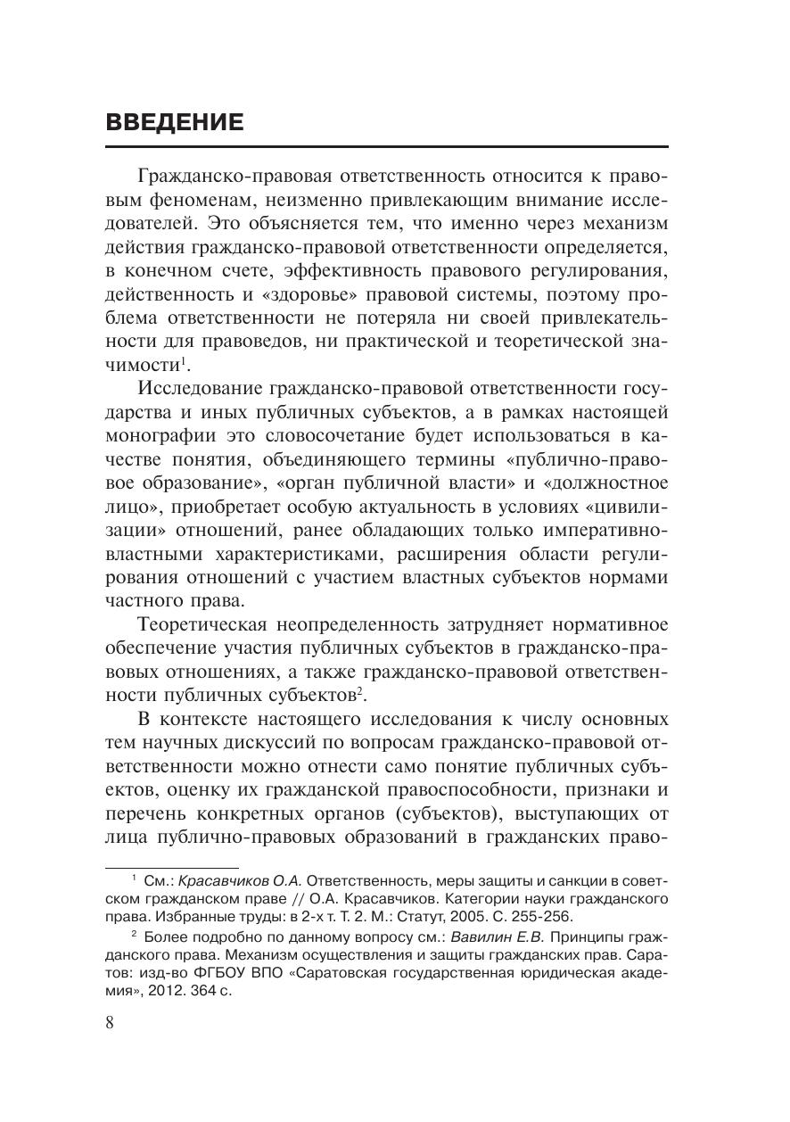 В исследовании проанализированы как общие теоретические конструкции, категории и механизм гражданско-правовой ответственности, так и частные понятия и закономерности, возникающие и проявляющиеся при привлечении публичных субъектов к различным видам правовой ответственности, подвергнуты критическому разбору отдельные законодательные нормы и материалы правоприменительной практики и даны рекомендации по совершенствованию законодательства.