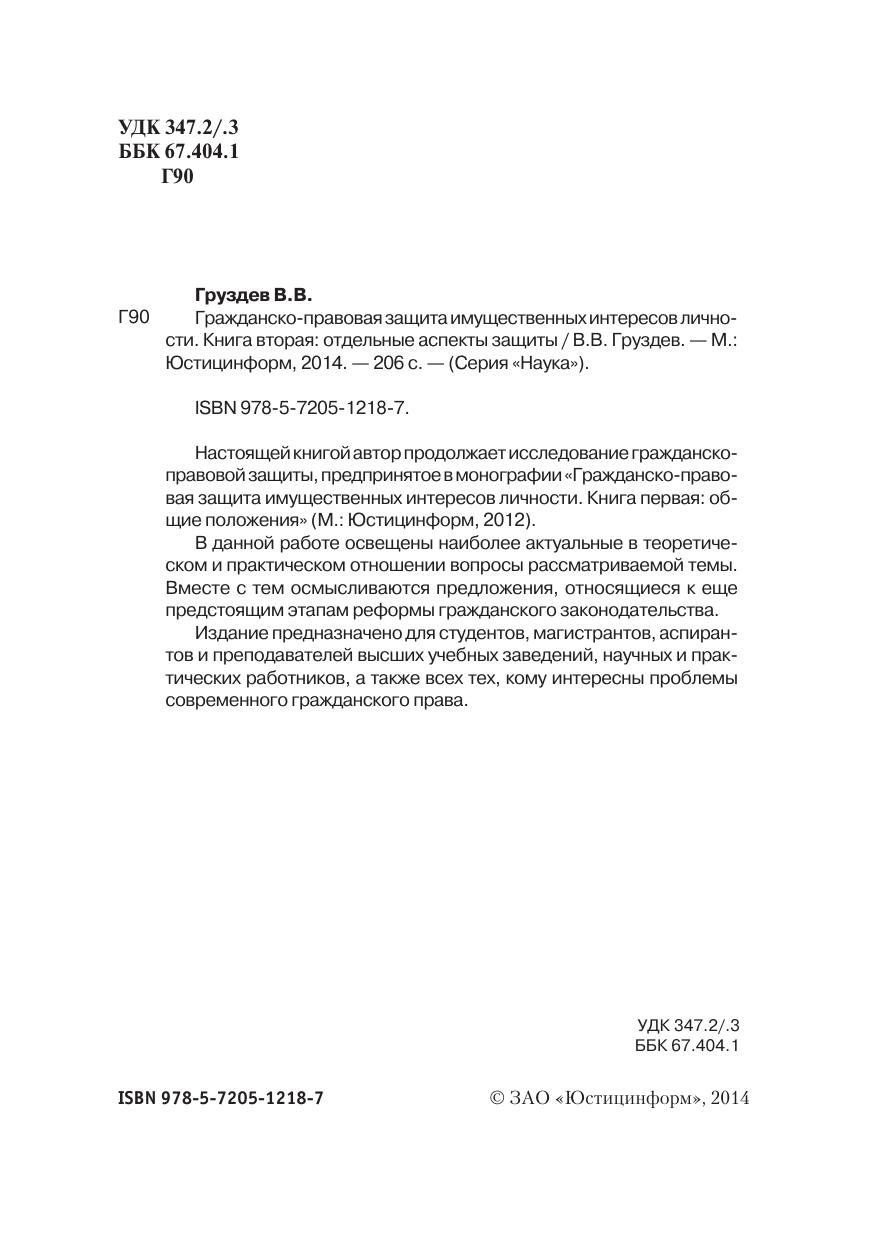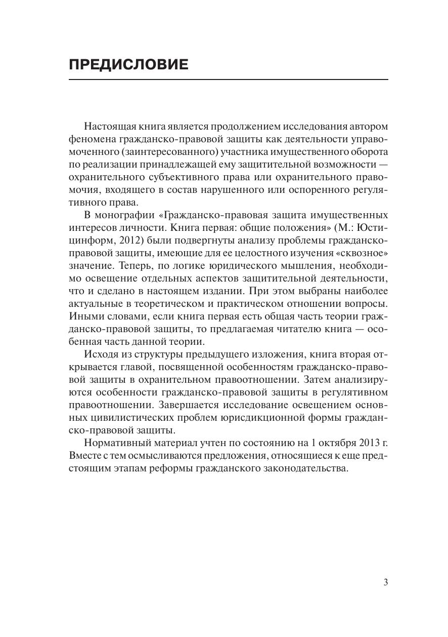 Настоящей книгой автор продолжает исследование гражданско-правовой защиты, предпринятое в монографии «Гражданско-правовая защита имущественных интересов личности. Книга первая: общие положения» (М.: Юстицинформ, 2012). В данной работе освещены наиболее актуальные в теоретическом и практическом отношении вопросы рассматриваемой темы. Вместе с тем осмысливаются предложения, относящиеся к еще предстоящим этапам реформы гражданского законодательства.издание предназначено для студентов, магистрантов, аспирантов и преподавателей высших учебных заведений, научных и практических работников, а также всех тех, кому интересны проблемы современного гражданского права