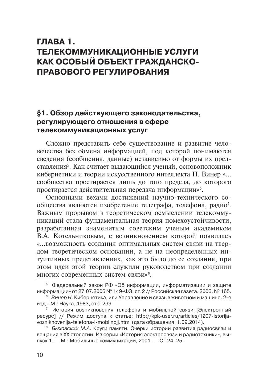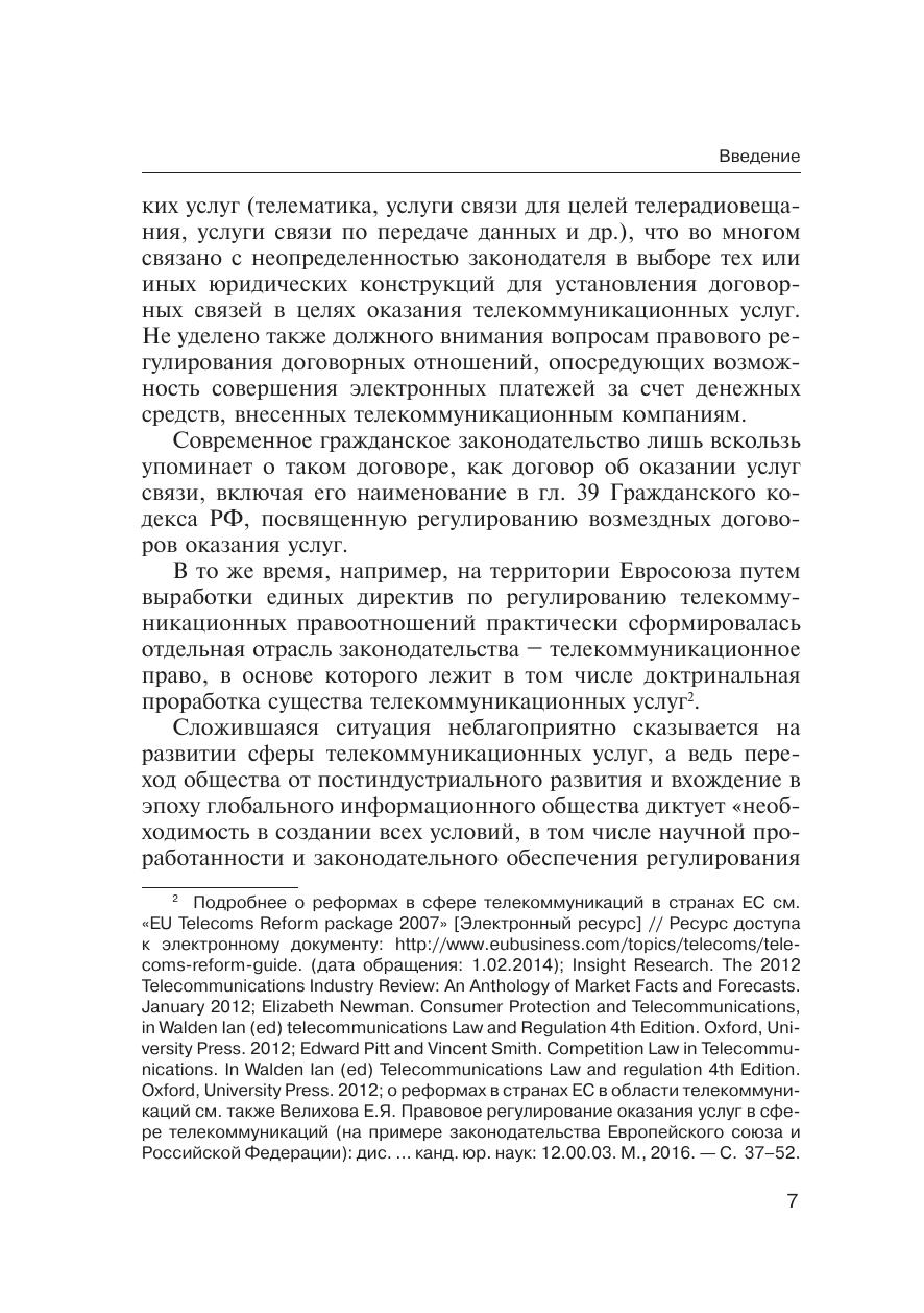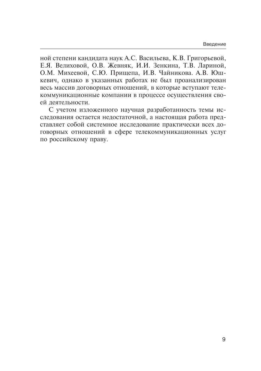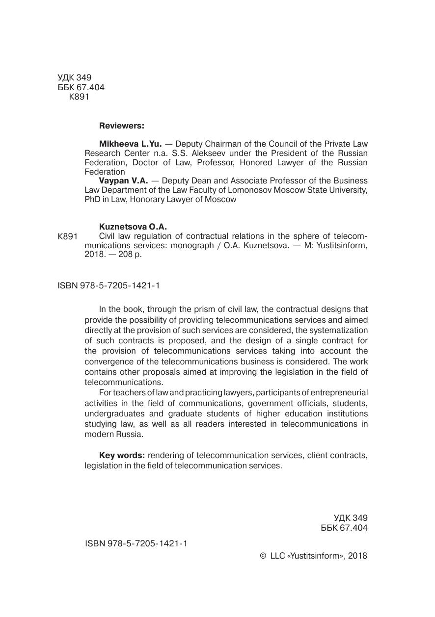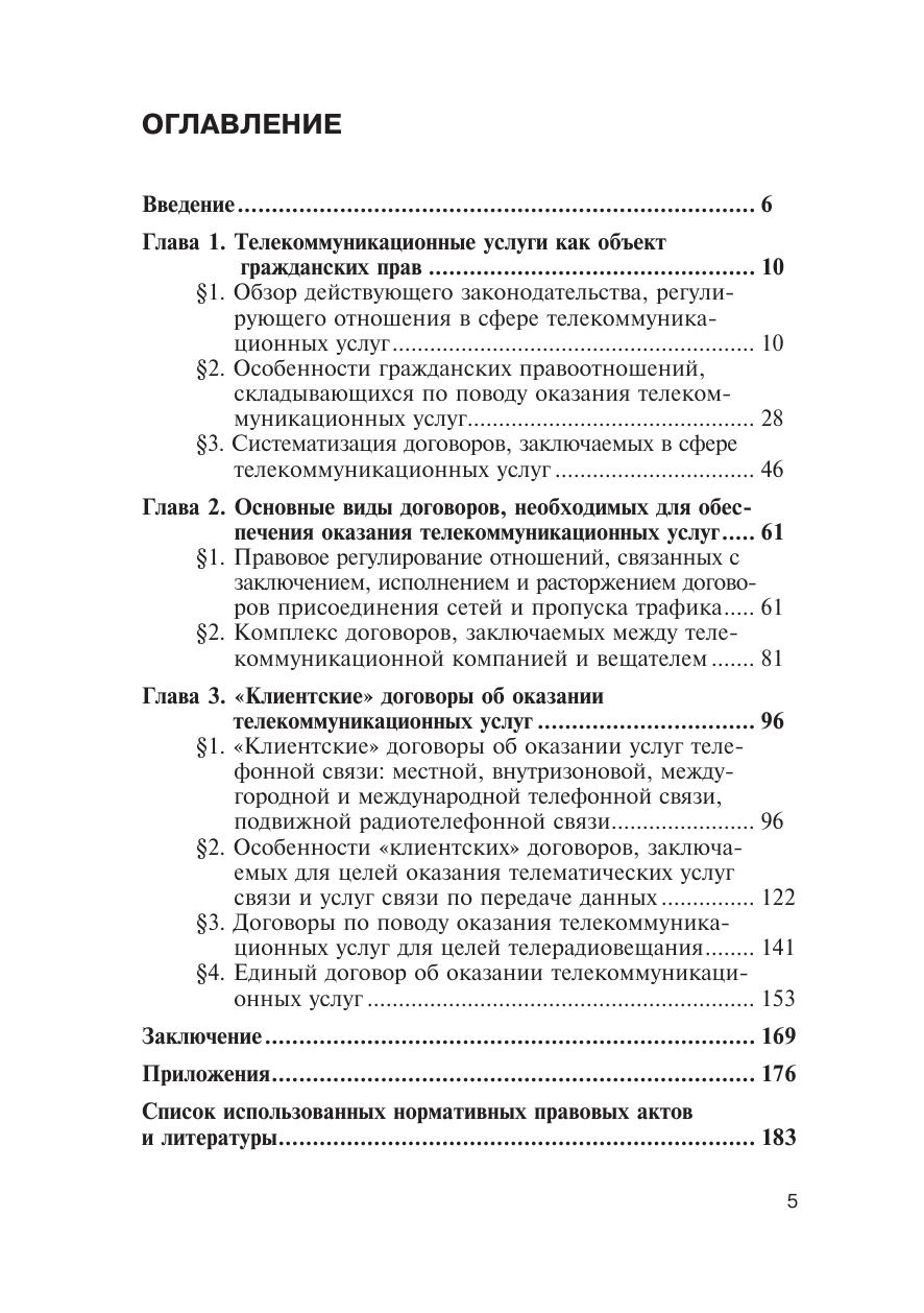 В книге сквозь призму гражданского законодательства рассмотрены договорные конструкции, обеспечивающие возможность оказания телекоммуникационных услуг и направленные непосредственно на оказание таких услуг, предложена систематизация таких договоров, а также рассмотрена предлагаемая с учетом конвергенции телекоммуникационного бизнеса конструкция единого договора об оказании телекоммуникационных услуг. Работа содержит иные предложения, направленные на совершенствование законодательства в сфере телекоммуникаций.