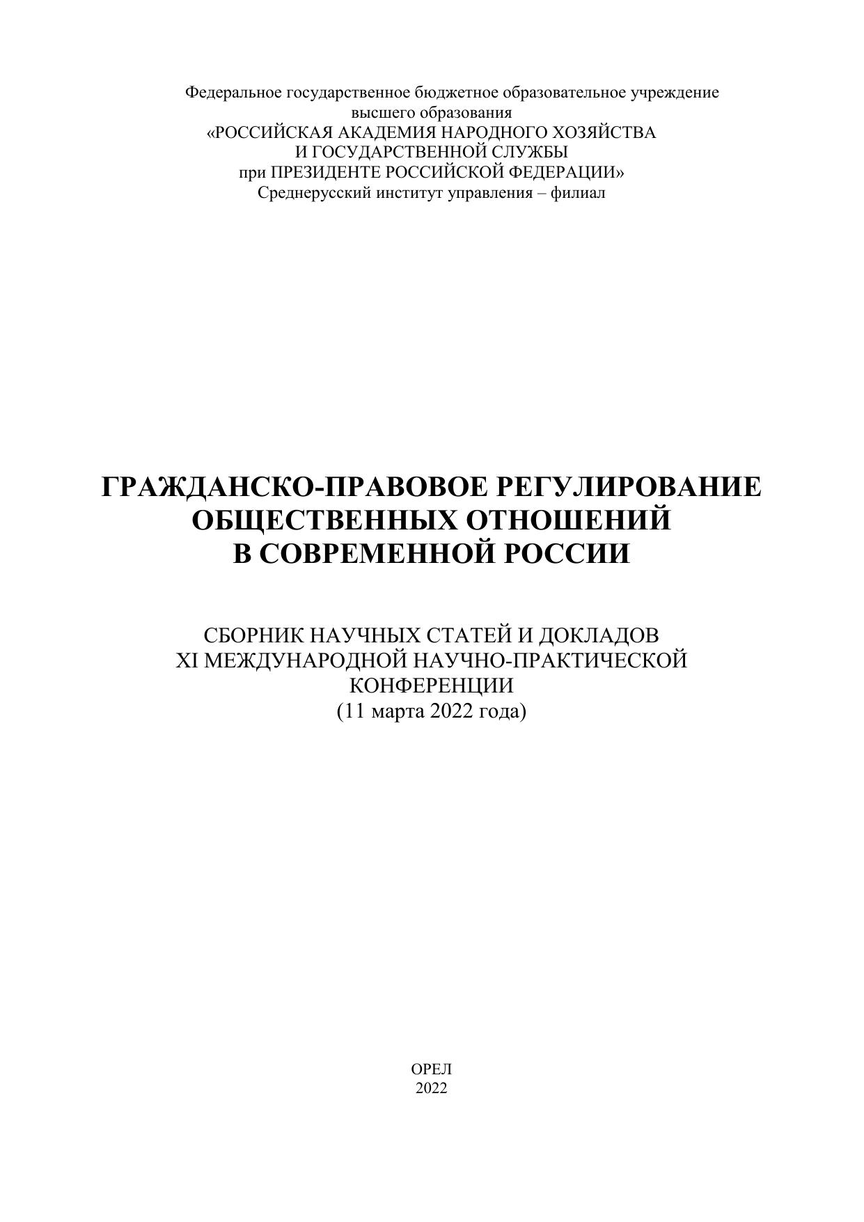 Гражданско-правовое регулирование общественных отношений в современной России. Сборник научных статей и докладов XI Международной научно-практической конференции