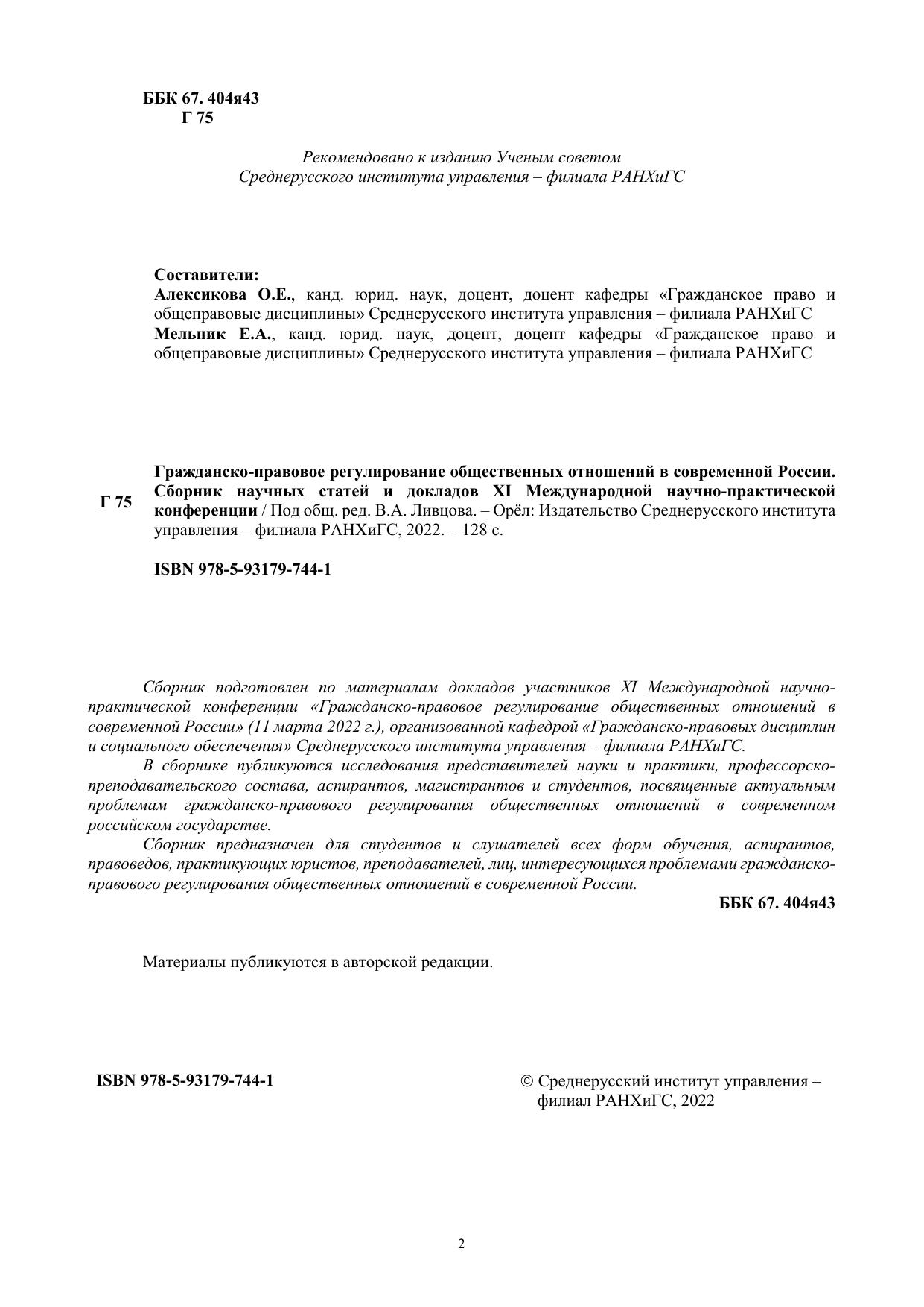 Сборник подготовлен по материалам докладов участников XI Международной научнопрактической конференции «Гражданско-правовое регулирование общественных отношений в современной России» (11 марта 2022 г.), организованной кафедрой «Гражданско-правовых дисциплин и социального обеспечения» Среднерусского института управления – филиала РАНХиГС. В сборнике публикуются исследования представителей науки и практики, профессорскопреподавательского состава, аспирантов, магистрантов и студентов, посвященные актуальным проблемам гражданско-правового регулирования общественных отношений в современном российском государстве. Сборник предназначен для студентов и слушателей всех форм обучения, аспирантов, правоведов, практикующих юристов, преподавателей, лиц, интересующихся проблемами гражданскоправового регулирования общественных отношений в современной России.