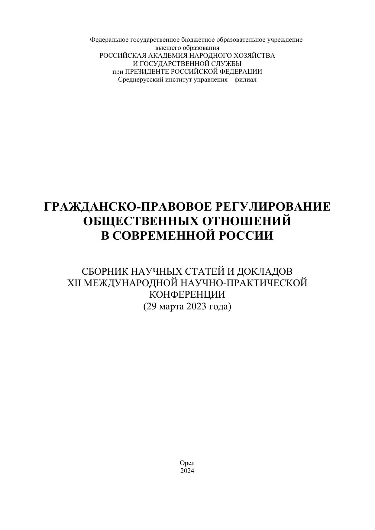 Гражданско-правовое регулирование общественных отношений в современной России. Сборник научных статей и докладов XII Международной научно-практической конференции