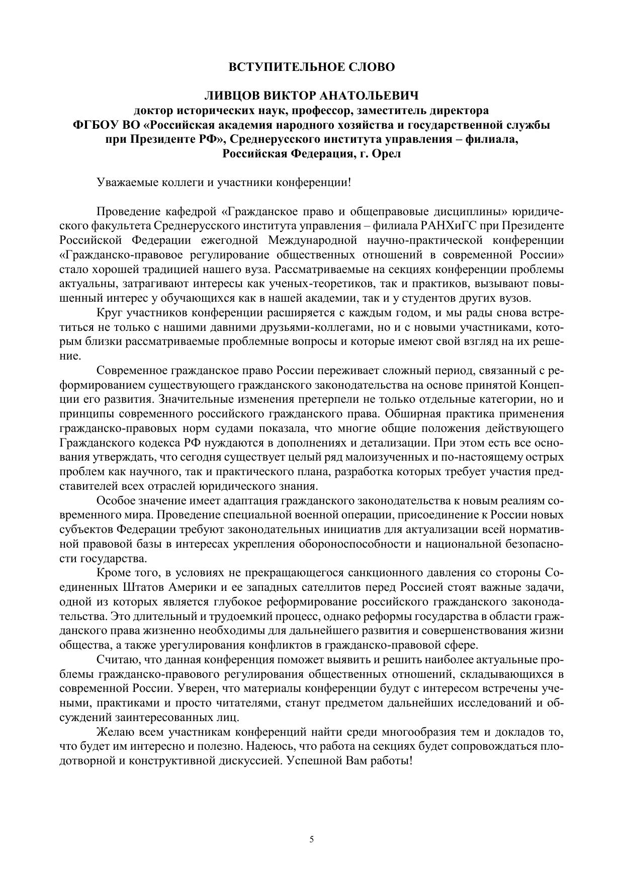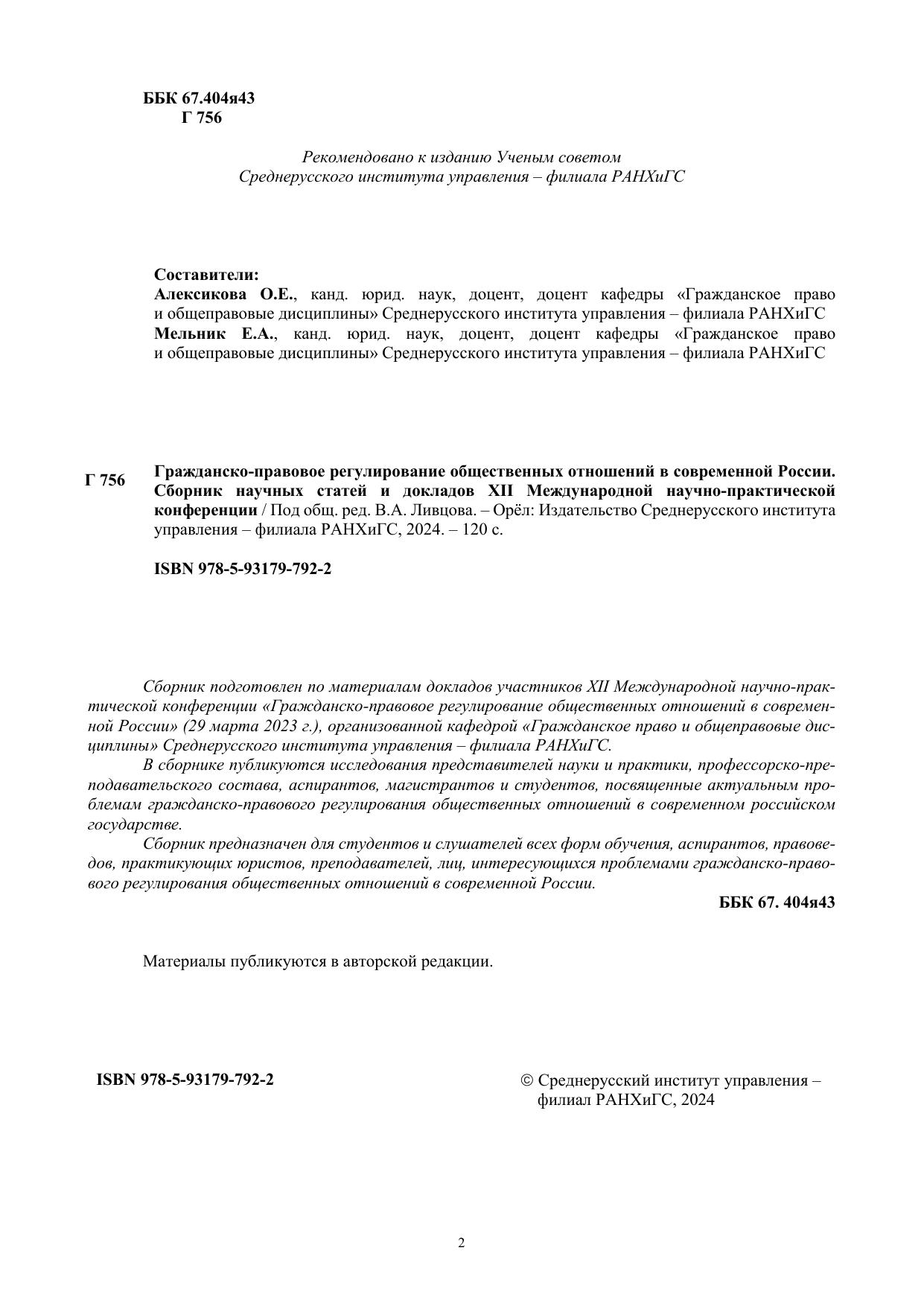 Сборник подготовлен по материалам докладов участников XII Международной научно-практической конференции «Гражданско-правовое регулирование общественных отношений в современной России» (29 марта 2023 г.), организованной кафедрой «Гражданское право и общеправовые дисциплины» Среднерусского института управления – филиала РАНХиГС. В сборнике публикуются исследования представителей науки и практики, профессорско-преподавательского состава, аспирантов, магистрантов и студентов, посвященные актуальным проблемам гражданско-правового регулирования общественных отношений в современном российском государстве. Сборник предназначен для студентов и слушателей всех форм обучения, аспирантов, правоведов, практикующих юристов, преподавателей, лиц, интересующихся проблемами гражданско-правового регулирования общественных отношений в современной России.