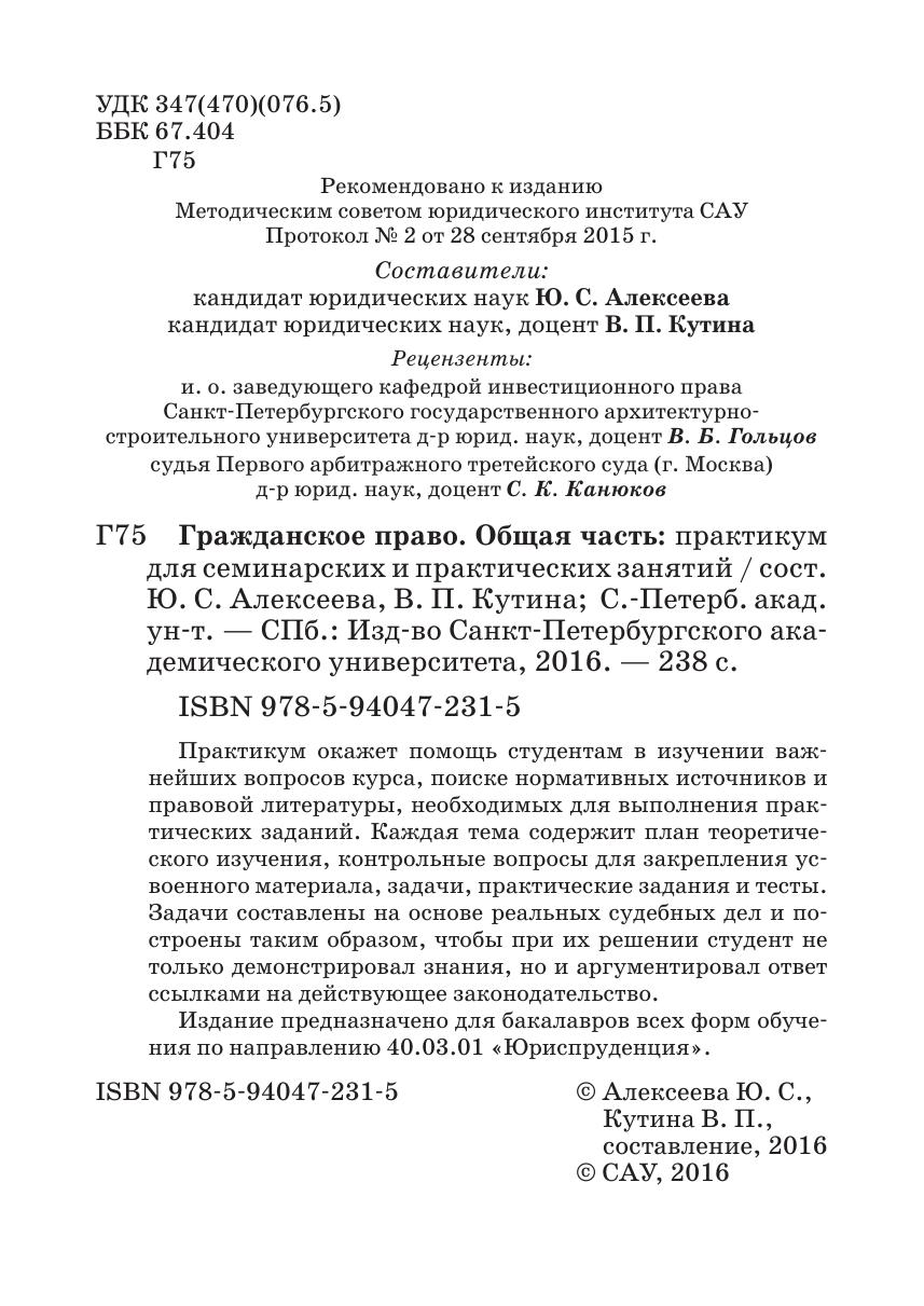 Практикум окажет помощь студентам в изучении важнейших вопросов курса, поиске нормативных источников и правовой литературы, необходимых для выполнения практических заданий. Каждая тема содержит план теоретического изучения, контрольные вопросы для закрепления усвоенного материала, задачи, практические задания и тесты. Задачи составлены на основе реальных судебных дел и построены таким образом, чтобы при их решении студент не только демонстрировал знания, но и аргументировал ответ ссылками на действующее законодательство. Издание предназначено для бакалавров всех форм обучения по направлению 40.03.01 «Юриспруденция».