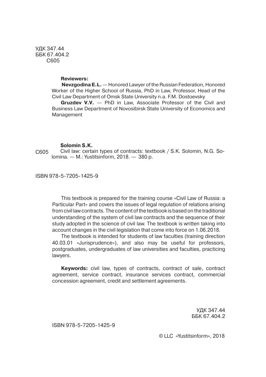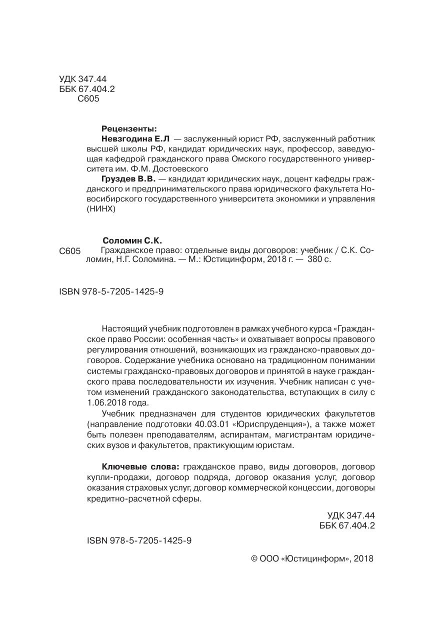 Настоящий учебник подготовлен в рамках учебного курса «Гражданское право России: особенная часть» и охватывает вопросы правового регулирования отношений, возникающих из гражданско-правовых договоров. Содержание учебника основано на традиционном понимании системы гражданско-правовых договоров и принятой в науке гражданского права последовательности их изучения. Учебник написан с учетом изменений гражданского законодательства, вступающих в силу с 1.06.2018 года. Учебник предназначен для студентов юридических факультетов (направление подготовки 40.03.01 «Юриспруденция»), а также может быть полезен преподавателям, аспирантам, магистрантам юридических вузов и факультетов, практикующим юристам.