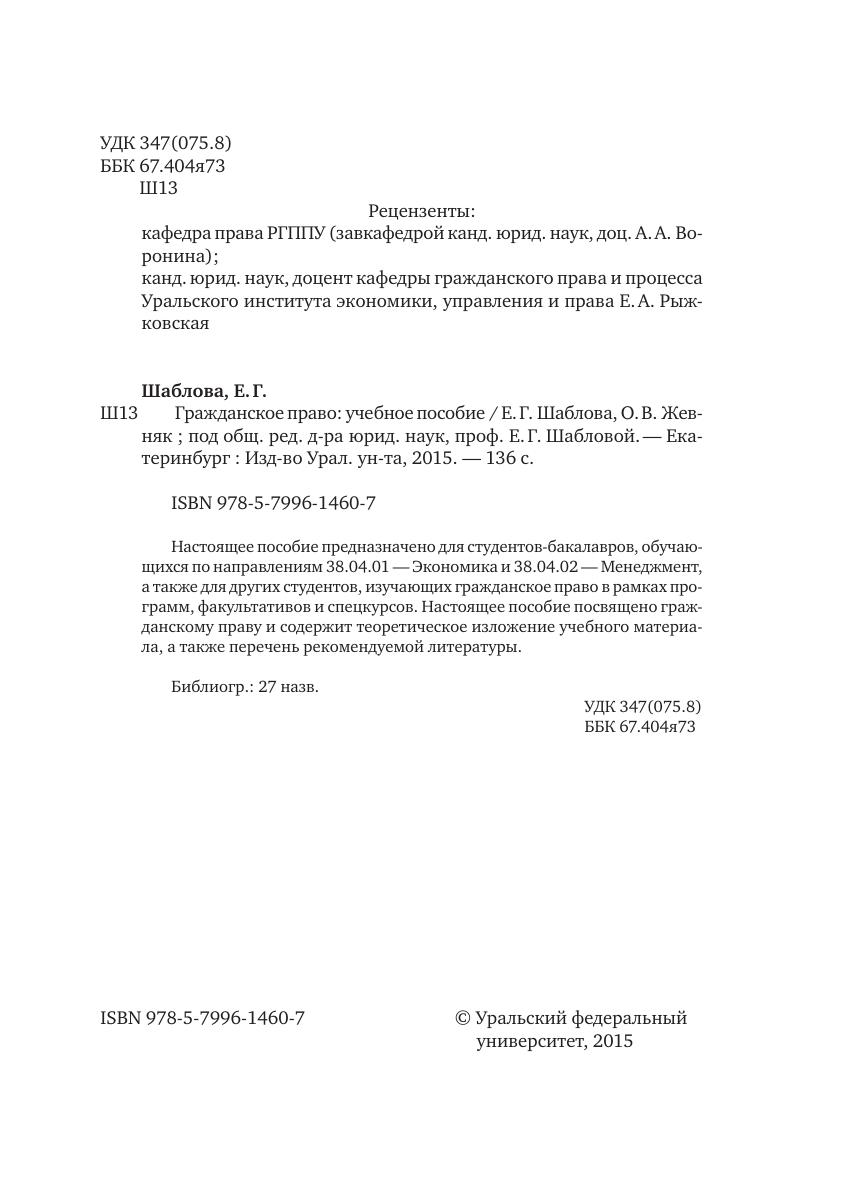 Настоящее пособие предназначено для студентов‑бакалавров, обучающихся по направлениям 38.04.01 — Экономика и 38.04.02 — Менеджмент, а также для других студентов, изучающих гражданское право в рамках программ, факультативов и спецкурсов. Настоящее пособие посвящено гражданскому праву и содержит теоретическое изложение учебного материала, а также перечень рекомендуемой литературы.