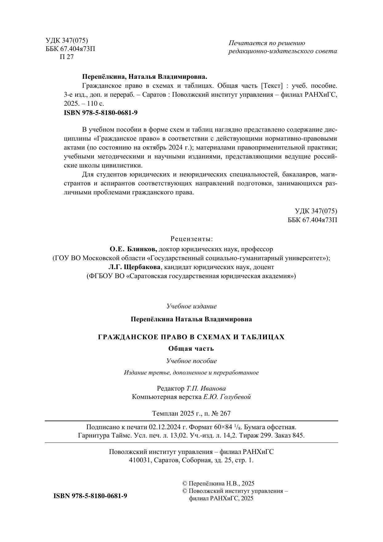 В учебном пособии в форме схем и таблиц наглядно представлено содержание дисциплины «Гражданское право» в соответствии с действующими нормативно-правовыми актами (по состоянию на октябрь 2024 г.); материалами правоприменительной практики; учебными методическими и научными изданиями, представляющими ведущие российские школы цивилистики. Для студентов юридических и неюридических специальностей, бакалавров, магистрантов и аспирантов соответствующих направлений подготовки, занимающихся различными проблемами гражданского права.