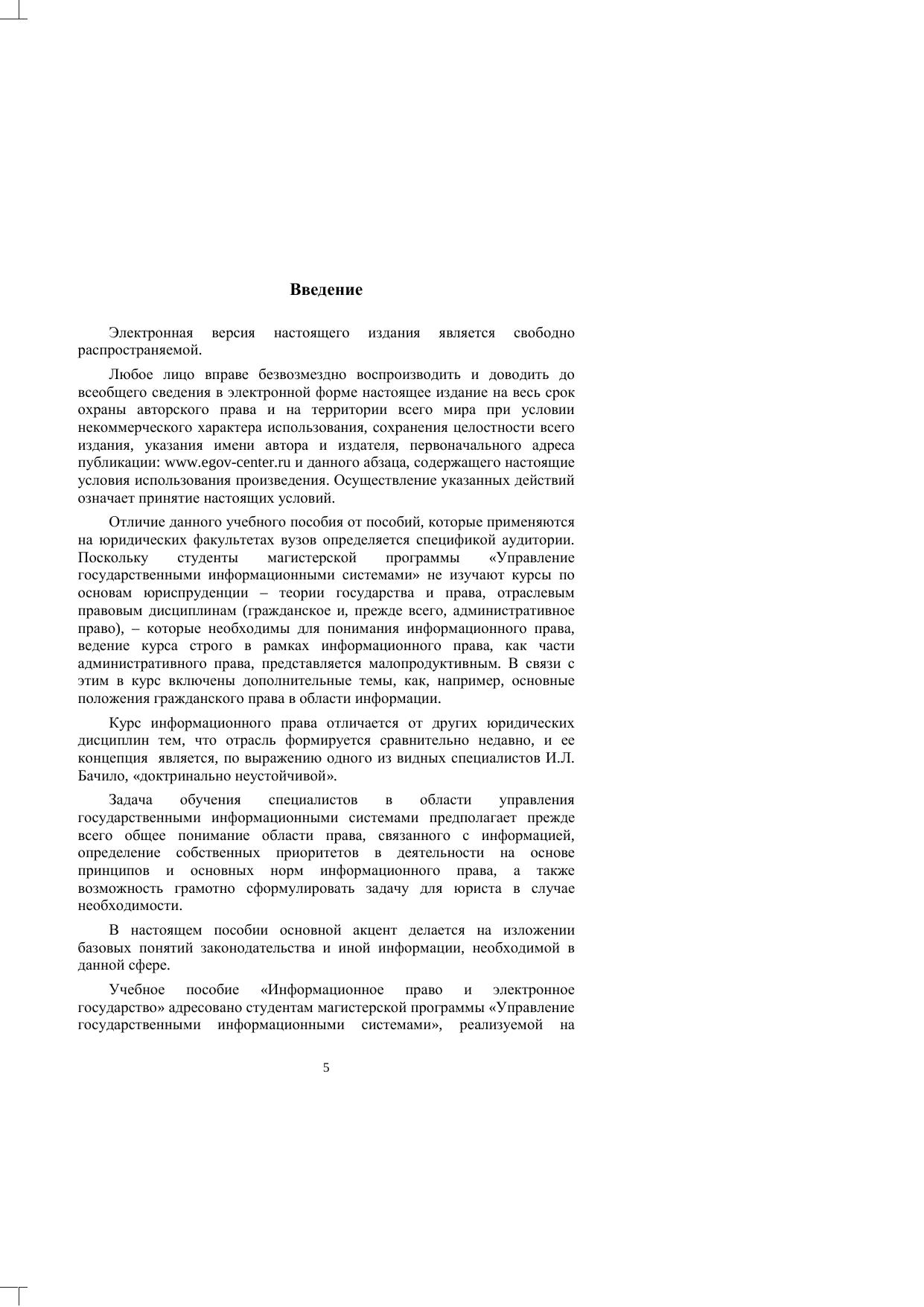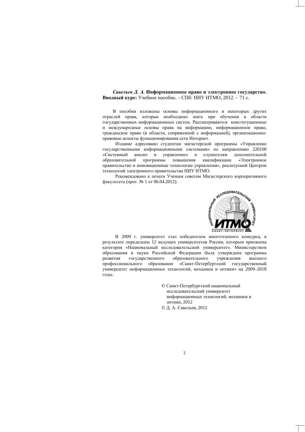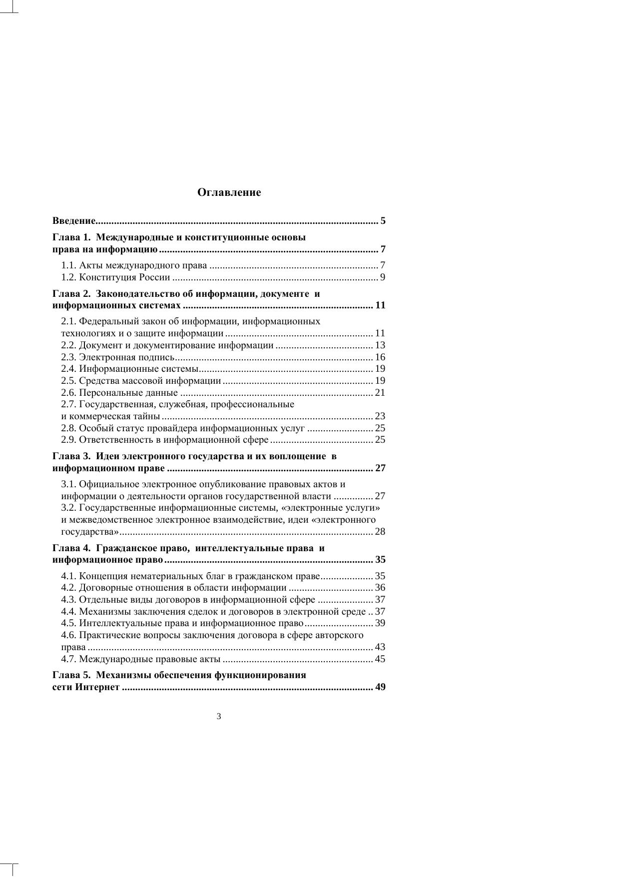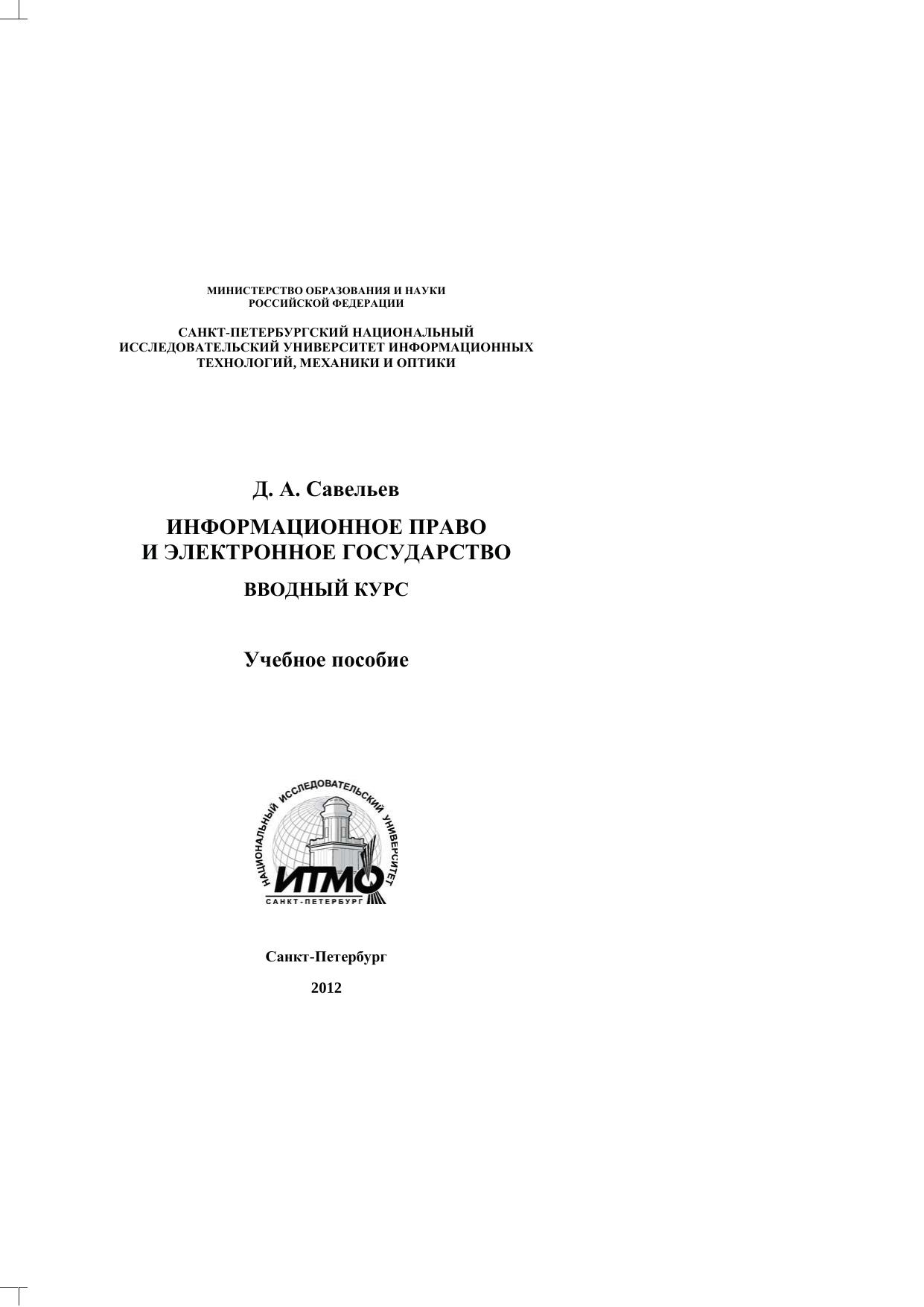В пособии изложены основы информационного и некоторых других отраслей права, которые необходимо знать при обучении в области государственных информационных систем. Рассматриваются конституционные и международные основы права на информацию, информационное право, гражданское право (в области, сопряженной с информацией), организационно-правовые аспекты функционирования сети Интернет. Издание адресовано студентам магистерской программы «Управление государственными информационными системами» по направлению 220100 «Системный анализ и управление» и слушателям дополнительной образовательной программы повышения квалификации «Электронное правительство и инновационные технологии управления», реализуемой Центром технологий электронного правительства НИУ ИТМО.