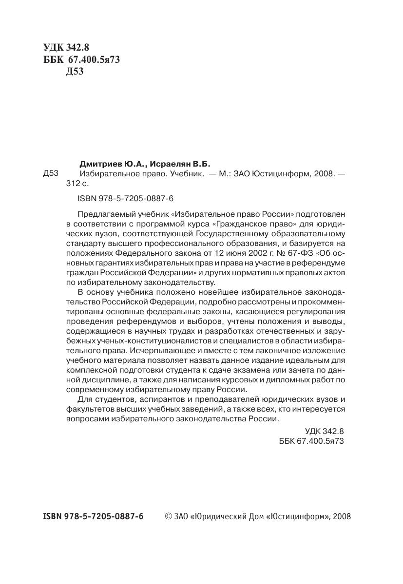 Предлагаемый учебник «Избирательное право России» подготовлен в соответствии с программой курса «Гражданское право» для юридических вузов, соответствующей Государственному образовательному стандарту высшего профессионального образования, и базируется на положениях Федерального закона от 12 июня 2002 г. № 67-ФЗ «Об основных гарантиях избирательных прав и права на участие в референдуме граждан Российской Федерации» и других нормативных правовых актов по избирательному законодательству. В основу учебника положено новейшее избирательное законодательство Российской Федерации, подробно рассмотрены и прокомментированы основные федеральные законы, касающиеся регулирования проведения референдумов и выборов, учтены положения и выводы, содержащиеся в научных трудах и разработках отечественных и зарубежных ученых-конституционалистов и специалистов в области избирательного права. Исчерпывающее и вместе с тем лаконичное изложение учебного материала позволяет назвать данное издание идеальным для комплексной подготовки студента к сдаче экзамена или зачета по данной дисциплине, а также для написания курсовых и дипломных работ по современному избирательному праву России. Для студентов, аспирантов и преподавателей юридических вузов и факультетов высших учебных заведений, а также всех, кто интересуется вопросами избирательного законодательства России.