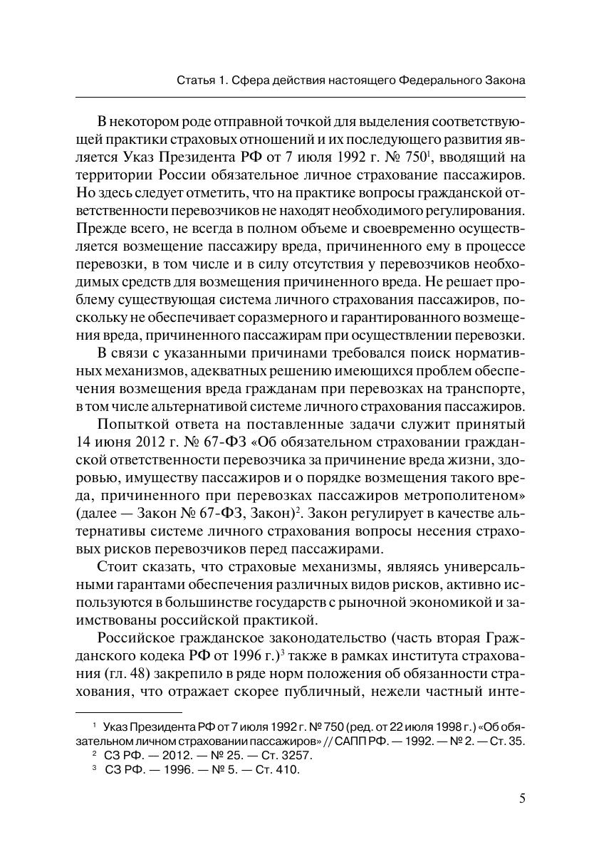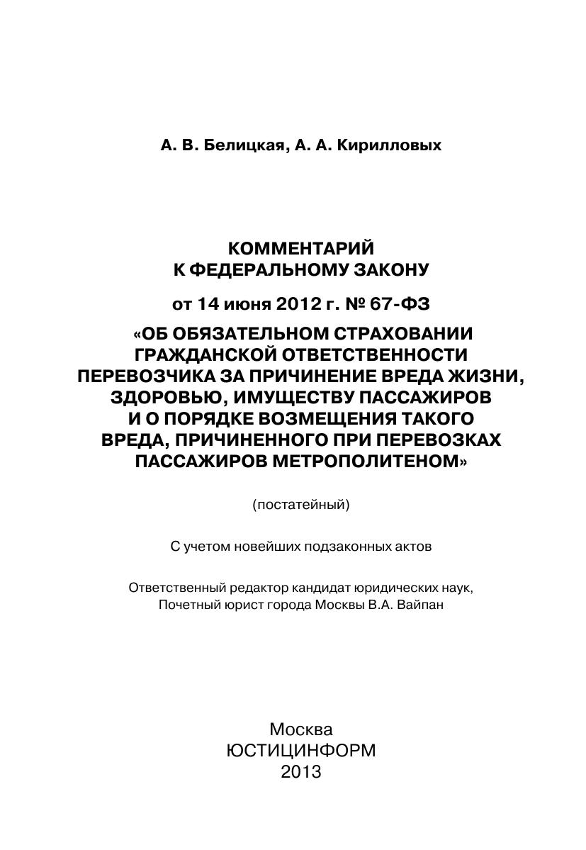 Предлагаемое издание представляет собой постатейный комментарий к Федеральному закону от 14 июня 2012 г. № 67-ФЗ «Об обязательном страховании гражданской ответственности перевозчика за причинение вреда жизни здоровью, имуществу пассажиров и о порядке возмещения такого вреда, причиненного при перевозках пассажиров метрополитеном».Закон развивает положения гражданского законодательства в части закрепления особенностей осуществления страхования рисков, связанных с несением перевозчиками гражданской ответственности и порядком возмещения вреда пассажирам.Регламентируются вопросы характеристики договора обязательного страхования, страхового возмещения и гарантий осуществления компенсационных выплат. Уделяется внимание деятельности страховщиков, их профессиональных объединений, а также особенностям возмещения вреда, причиненного при перевозках пассажиров метрополитеном.Комментарий рассчитан на юристов, руководителей и специалистов предприятий, осуществляющих пассажирские перевозки, лиц, которым причинен вред на транспорте, страховые организации, профессиональные объединения страховщиков.
