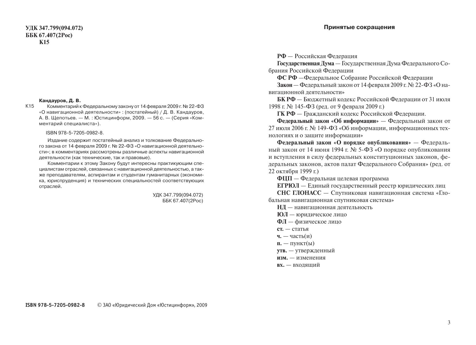 Издание содержит постатейный анализ и толкование Федерального закона от 14 февраля 2009 г. № 22-ФЗ «О навигационной деятельности» в комментариях рассмотрены различные аспекты навигационной деятельности (как технические, так и правовые). Комментарии к этому Закону будут интересны практикующим специалистам отраслей, связанных с навигационной деятельностью, а также преподавателям, аспирантам и студентам гуманитарных (экономика, юриспруденция) и технических специальностей соответствующих отраслей.