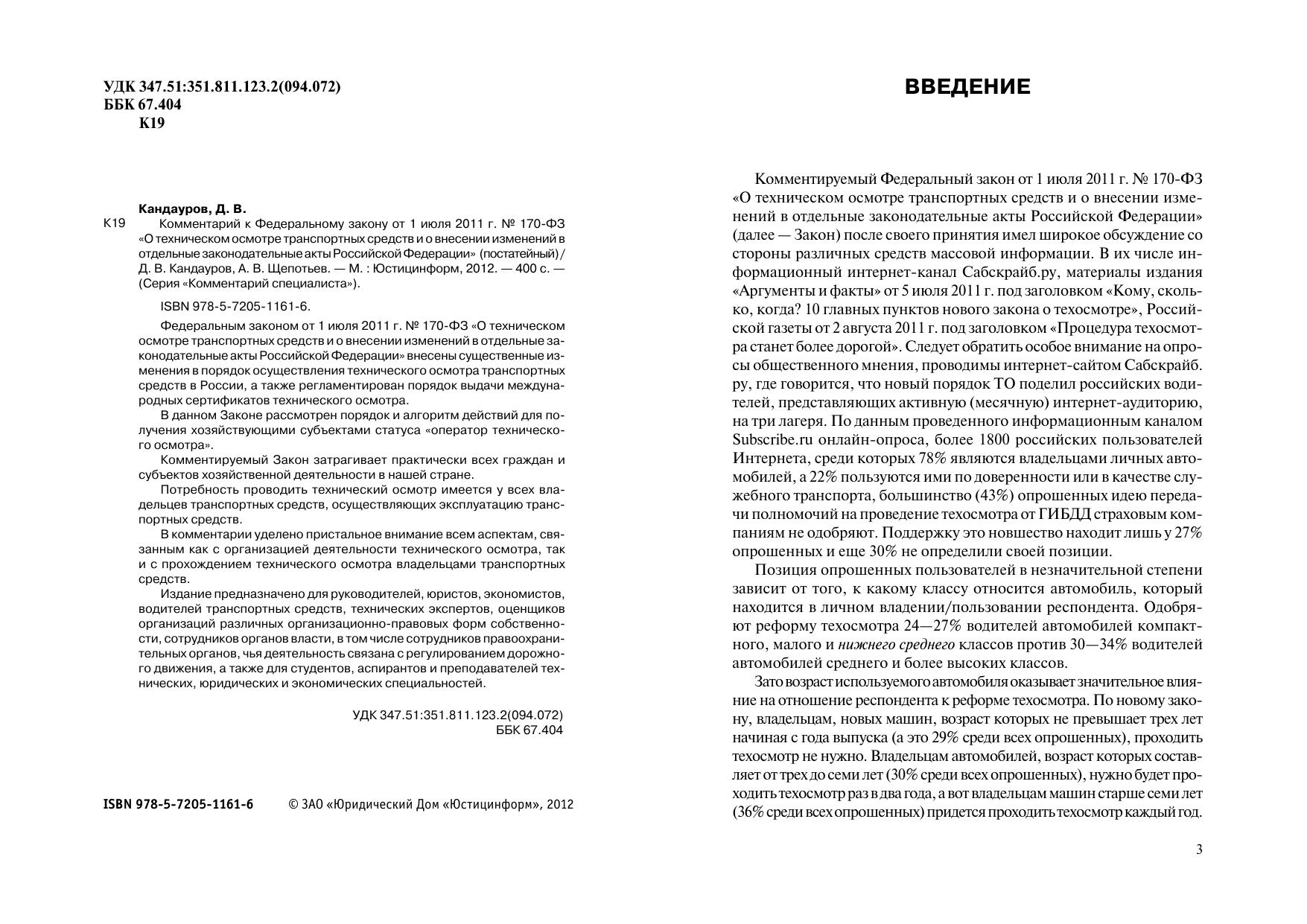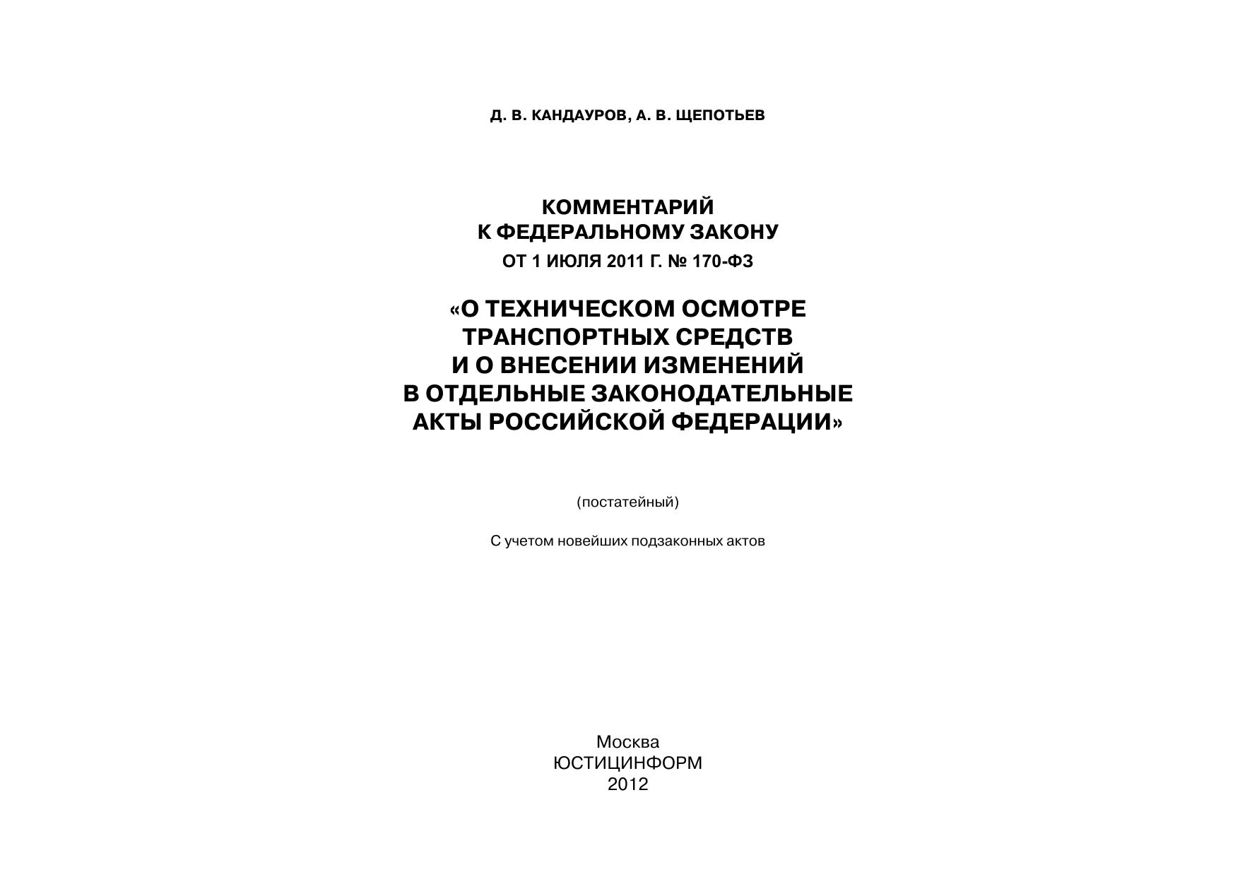 Федеральным законом от 1 июля 2011 г. № 170-ФЗ «О техническом осмотре транспортных средств и о внесении изменений в отдельные законодательные акты Российской Федерации» внесены существенные изменения в порядок осуществления технического осмотра транспортных средств в России, а также регламентирован порядок выдачи международных сертификатов технического осмотра.В данном Законе рассмотрен порядок и алгоритм действий для получения хозяйствующими субъектами статуса «оператор технического осмотра».Комментируемый Закон затрагивает практически всех граждан и субъектов хозяйственной деятельности в нашей стране. Потребность проводить технический осмотр имеется у всех владельцев транспортных средств, осуществляющих эксплуатацию транспортных средств. В комментарии уделено пристальное внимание всем аспектам, связанным как с организацией деятельности технического осмотра, так и с прохождением технического осмотра владельцами транспортных средств.Издание предназначено для руководителей, юристов, экономистов, водителей транспортных средств, технических экспертов, оценщиков организаций различных организационно-правовых форм собственности, сотрудников органов власти, в том числе сотрудников правоохранительных органов, чья деятельность связана с регулированием дорожного движения, а также для студентов, аспирантов и преподавателей технических, юридических и экономических специальностей.