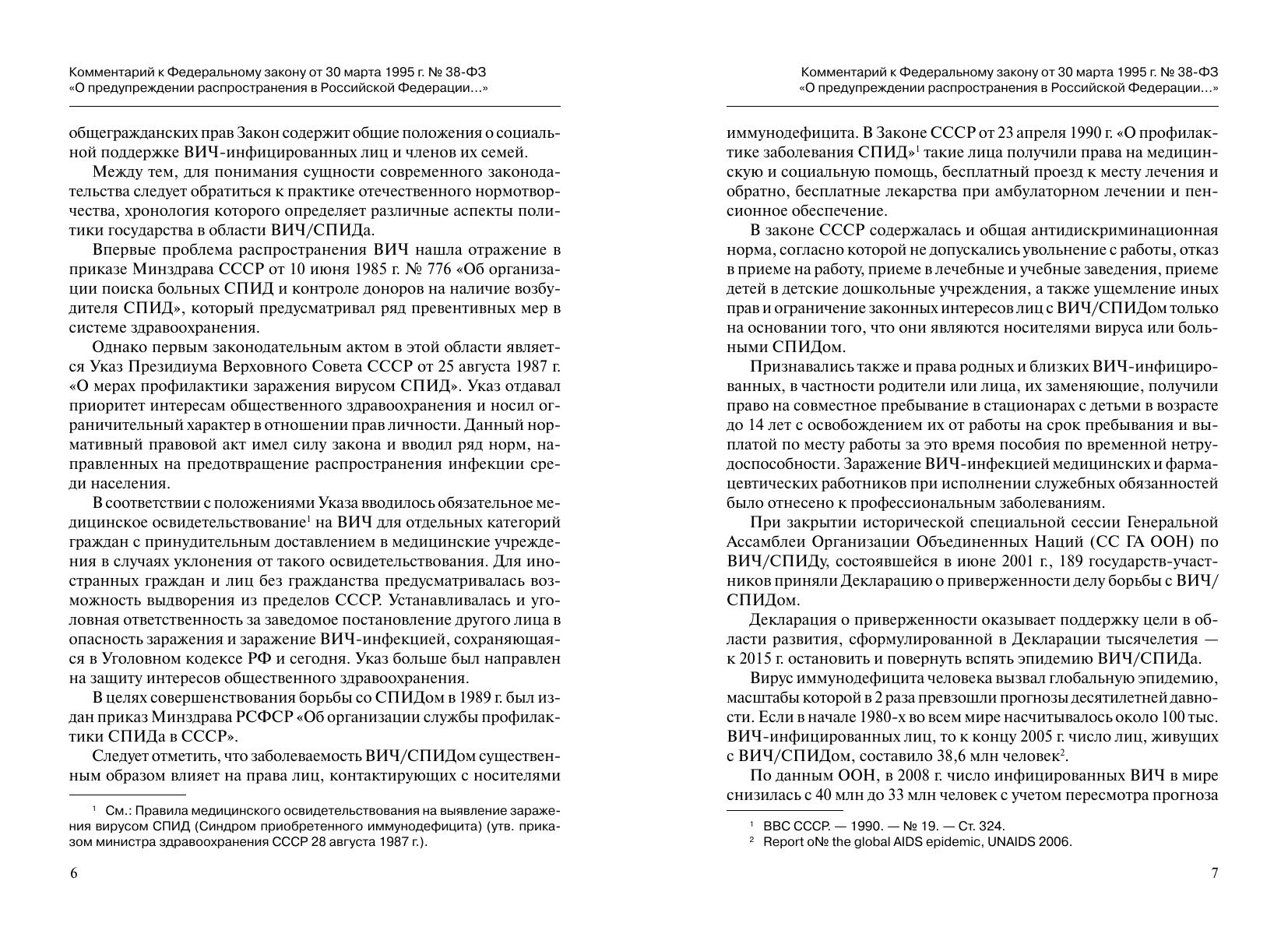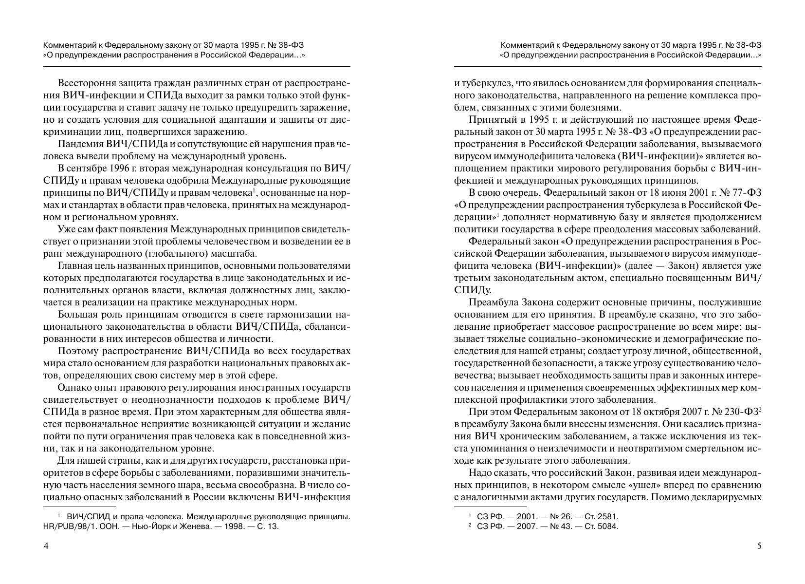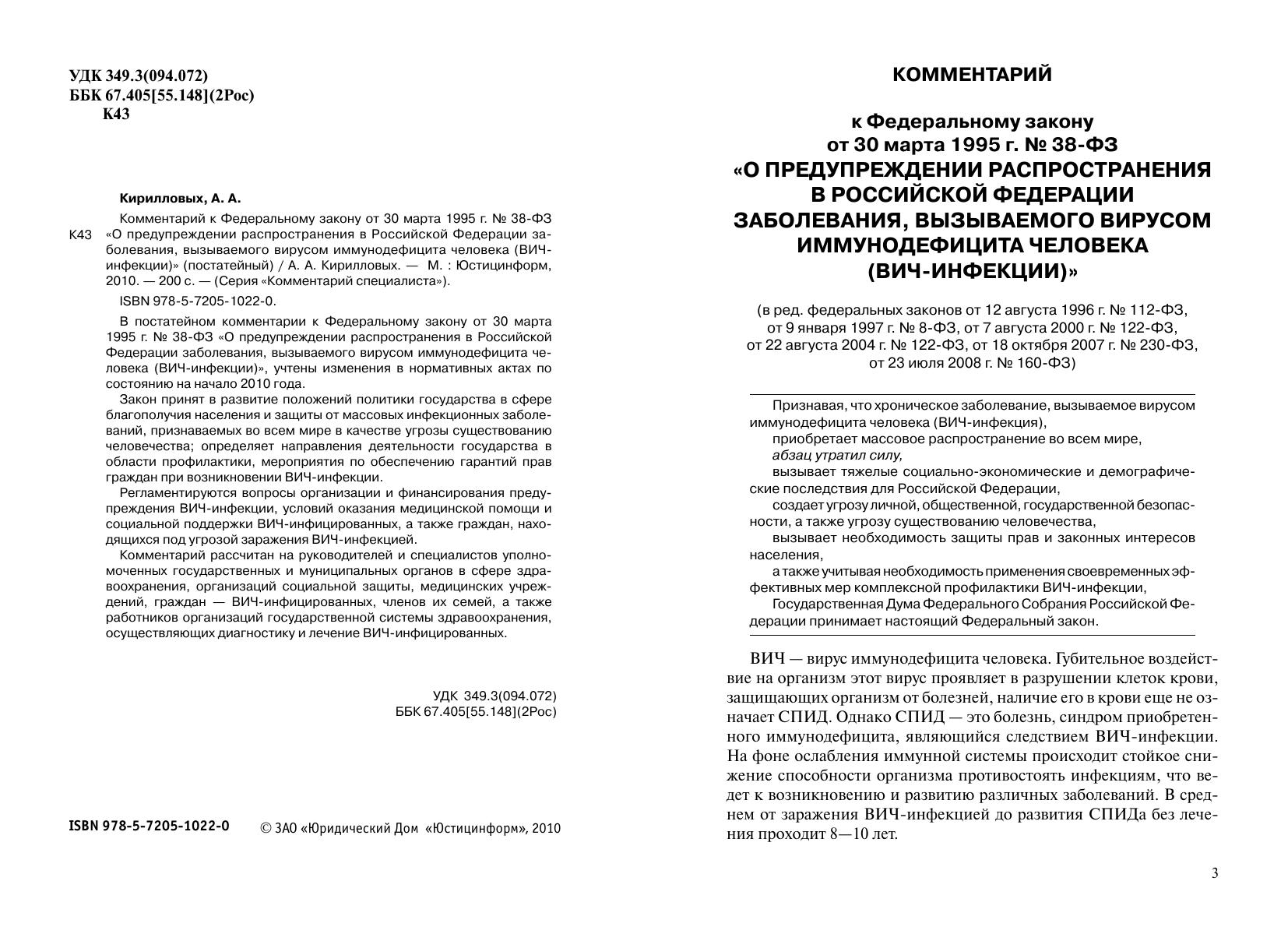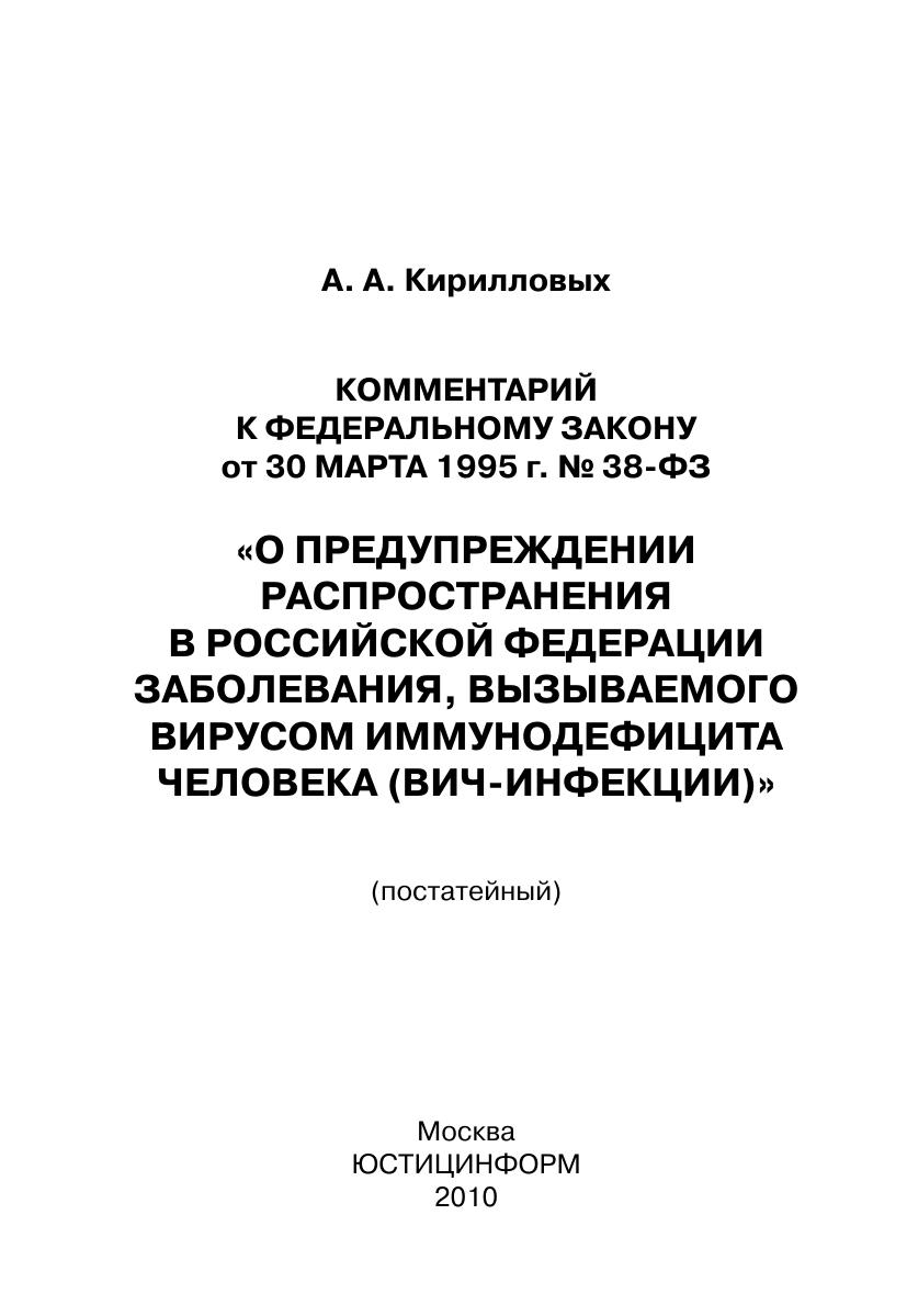 В постатейном комментарии к Федеральному закону от 30 марта 1995 г. № 38-ФЗ «О предупреждении распространения в Российской Федерации заболевания, вызываемого вирусом иммунодефицита человека (ВИЧ-инфекции)», учтены изменения в нормативных актах по состоянию на начало 2010 года.Закон принят в развитие положений политики государства в сфере благополучия населения и защиты от массовых инфекционных заболеваний, признаваемых во всем мире в качестве угрозы существованию человечества определяет направления деятельности государства в области профилактики, мероприятия по обеспечению гарантий прав граждан при возникновении ВИЧ-инфекции.Регламентируются вопросы организации и финансирования предупреждения ВИЧ-инфекции, условий оказания медицинской помощи и социальной поддержки ВИЧ-инфицированных, а также граждан, находящихся под угрозой заражения ВИЧ-инфекцией. Комментарий рассчитан на руководителей и специалистов уполномоченных государственных и муниципальных органов в сфере здравоохранения, организаций социальной защиты, медицинских учреждений, граждан — ВИЧ-инфицированных, членов их семей, а также работников организаций государственной системы здравоохранения, осуществляющих диагностику и лечение ВИЧ-инфицированных.