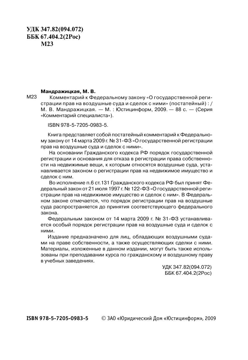 Книга представляет собой постатейный комментарий к Федеральному закону от 14 марта 2009 г. № 31-ФЗ «О государственной регистрации прав на воздушные суда и сделок с ними». На основании Гражданского кодекса РФ порядок государственной регистрации и основания для отказа в регистрации права собственности на недвижимые вещи, к которым относятся воздушные суда, устанавливается законом о регистрации прав на недвижимое имущество и сделок с ним.Во исполнение п.6 ст.131 Гражданского кодекса РФ был принят Федеральный закон от 21 июля 1997 г. № 122-ФЗ «О государственной регистрации прав на недвижимое имущество и сделок с ним». В Федеральном законе отмечается, что порядок регистрации прав на воздушные суда распространяется до принятия соответствующего федерального закона. Федеральным законом от 14 марта 2009 г. № 31-ФЗ устанавливается особый порядок регистрации прав на воздушные суда и сделок с ними.Издание предназначено для лиц, обладающих воздушными судами на праве собственности, а также осуществляющих сделки с ними. Материалы, изложенные в данном издании, могут быть также использованы при преподавании курса по гражданскому и воздушному праву в учебных заведениях.