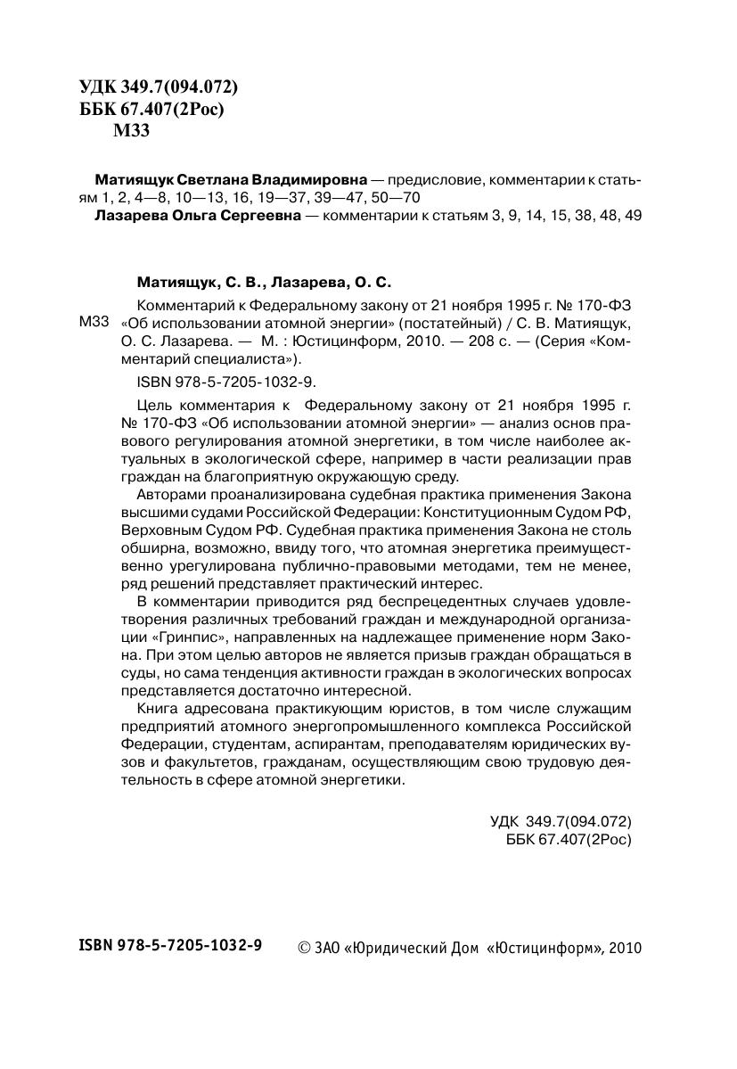 Цель комментария к Федеральному закону от 21 ноября 1995 г. № 170-ФЗ «Об использовании атомной энергии» — анализ основ правового регулирования атомной энергетики, в том числе наиболее актуальных в экологической сфере, например в части реализации прав граждан на благоприятную окружающую среду. Авторами проанализирована судебная практика применения Закона высшими судами Российской Федерации: Конституционным Судом РФ, Верховным Судом РФ. Судебная практика применения Закона не столь обширна, возможно, ввиду того, что атомная энергетика преимущественно урегулирована публично-правовыми методами, тем не менее, ряд решений представляет практический интерес. В комментарии приводится ряд беспрецедентных случаев удовлетворения различных требований граждан и международной организации «Гринпис», направленных на надлежащее применение норм Закона. При этом целью авторов не является призыв граждан обращаться в суды, но сама тенденция активности граждан в экологических вопросах представляется достаточно интересной. Книга адресована практикующим юристов, в том числе служащим предприятий атомного энергопромышленного комплекса Российской Федерации, студентам, аспирантам, преподавателям юридических вузов и факультетов, гражданам, осуществляющим свою трудовую деятельность в сфере атомной энергетики