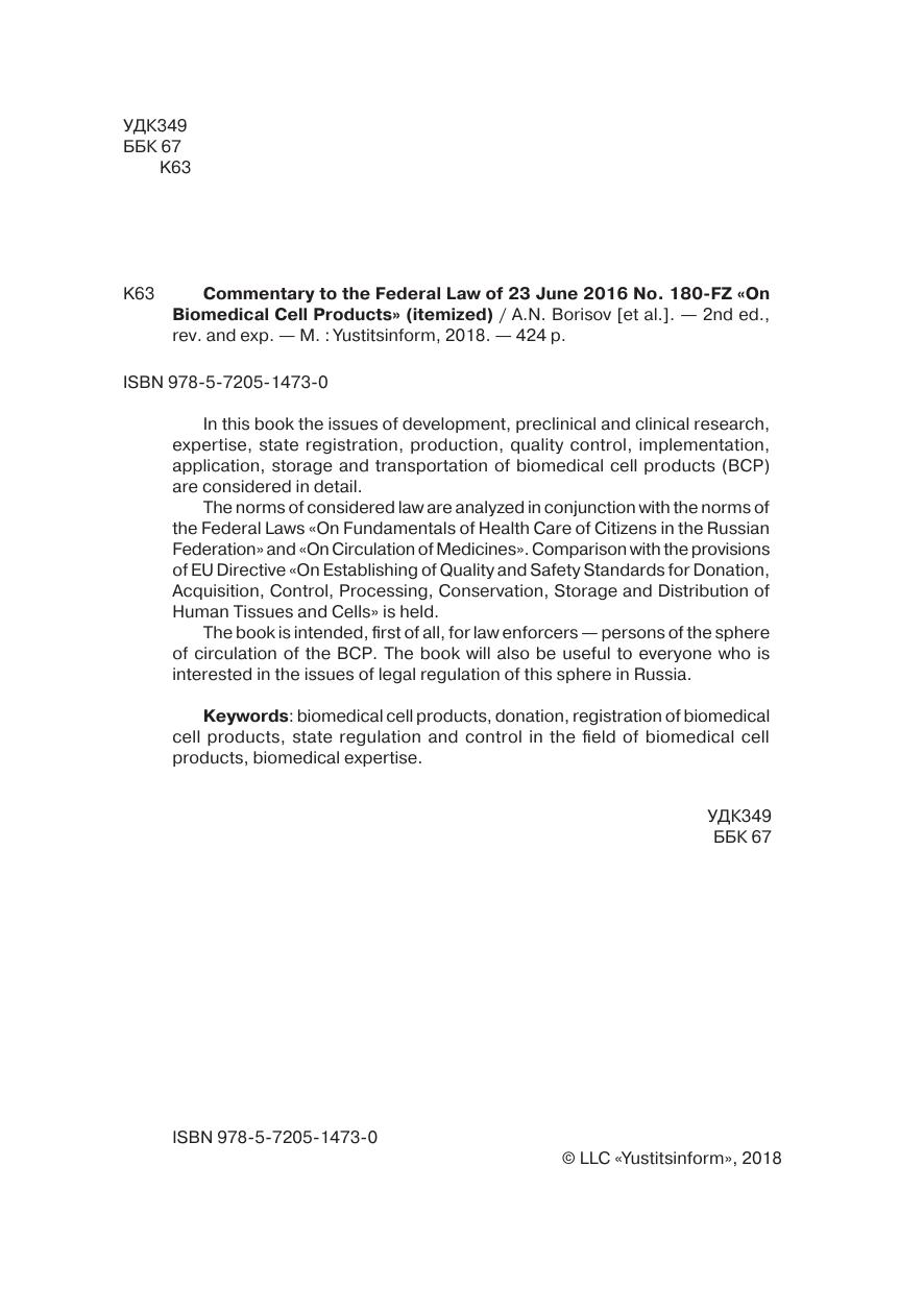 В книге подробно рассмотрены вопросы разработки, доклинических и клинических исследований, экспертизы, государственной регистрации, производства, контроля качества, реализации, применения, хранения и транспортировки биомедицинских клеточных продуктов (БМКП).
